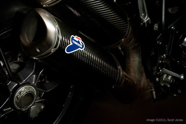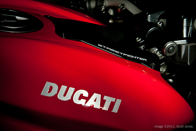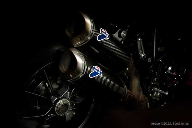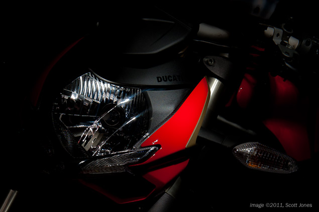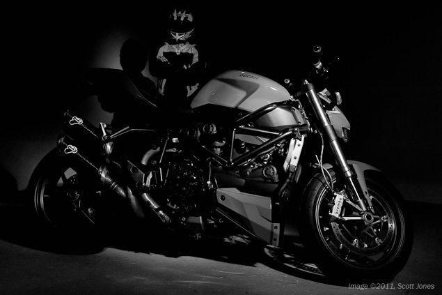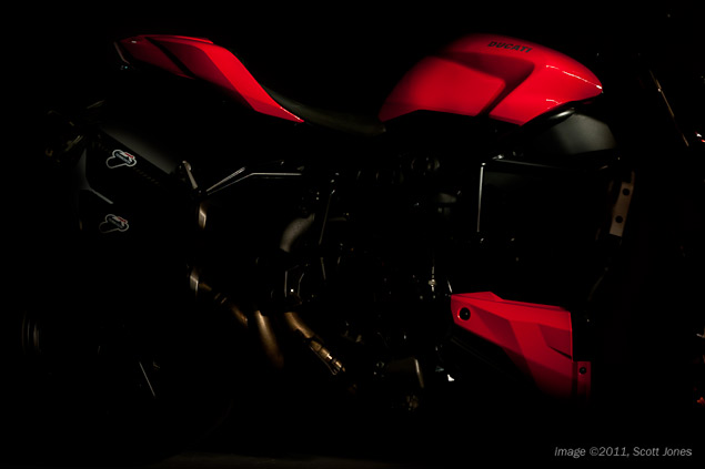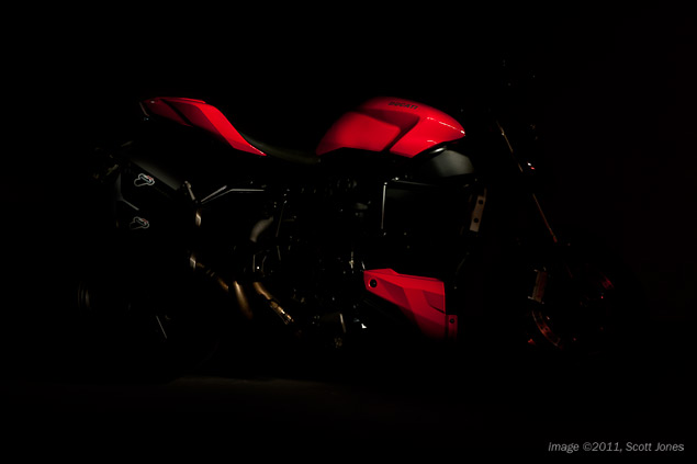 Luckily we have some photogenic subjects here in the office, as Scott spent the next two hours shooting my Ducati Streetfighter in the dark with long shutter speeds (I’m really surprised one of us didn’t trip over something in the process). There are various ways to play with the light in this setting, but Scott focused on exposing individual parts of the motorcycle with a pen light, which created a more dramatic effect. Check out after the jump some of the fruits of Scott’s labor.