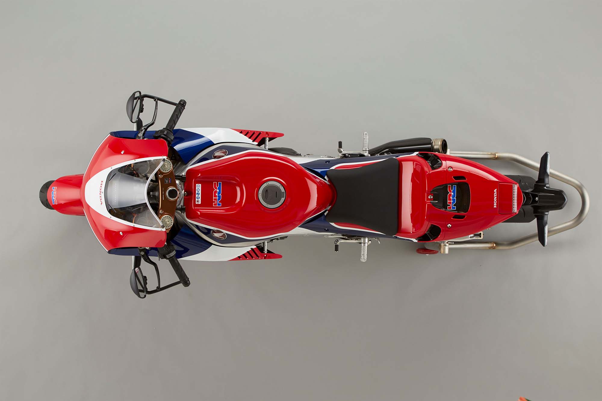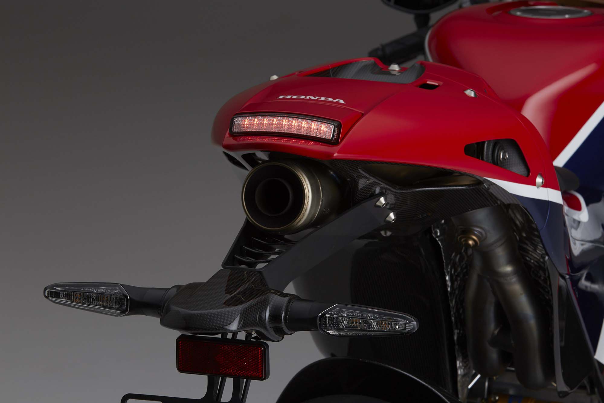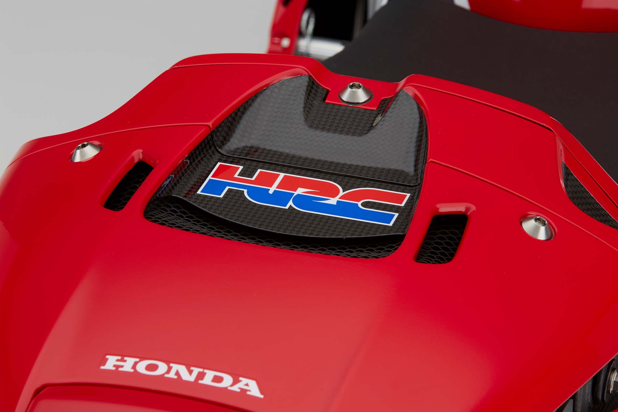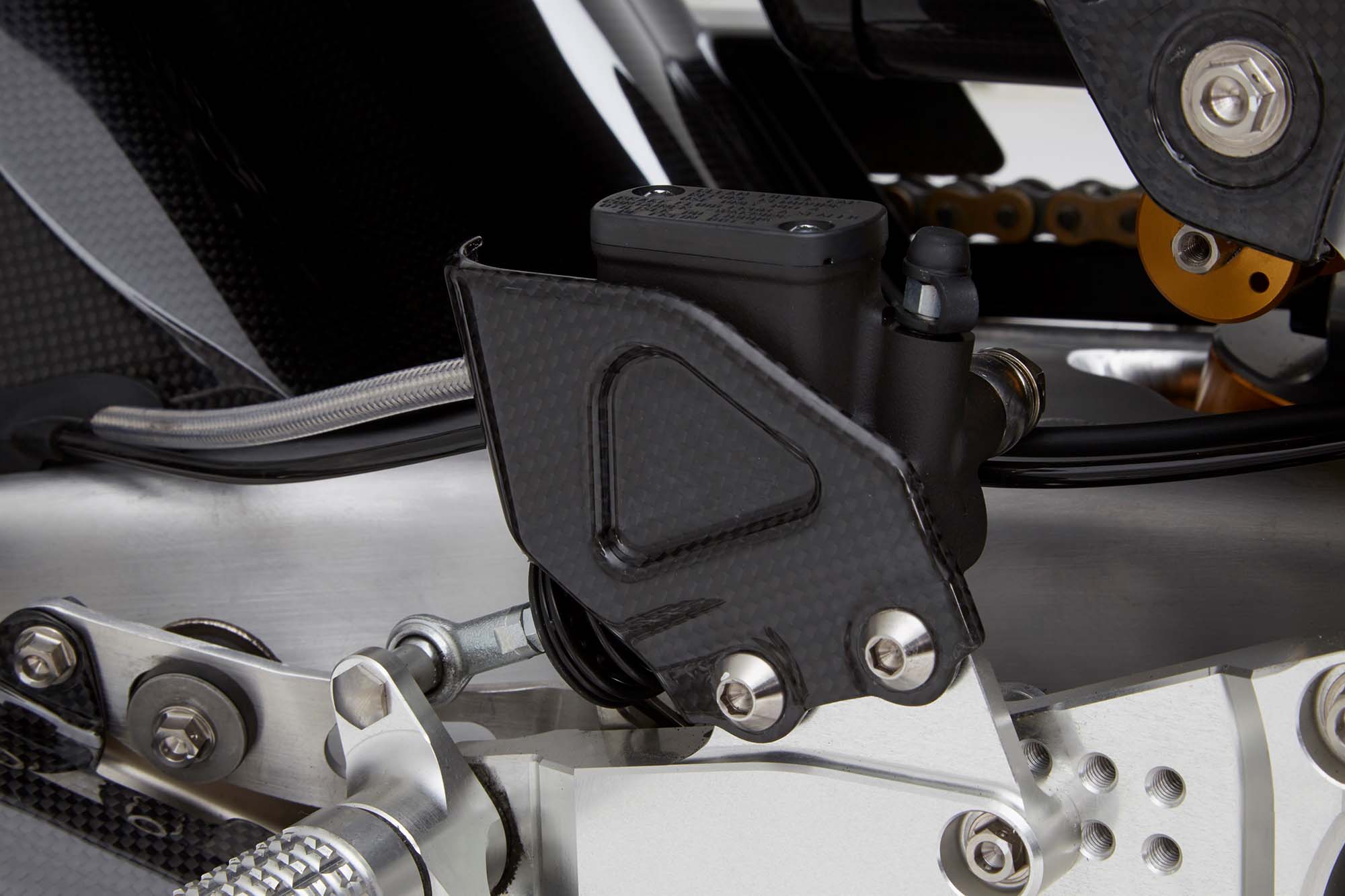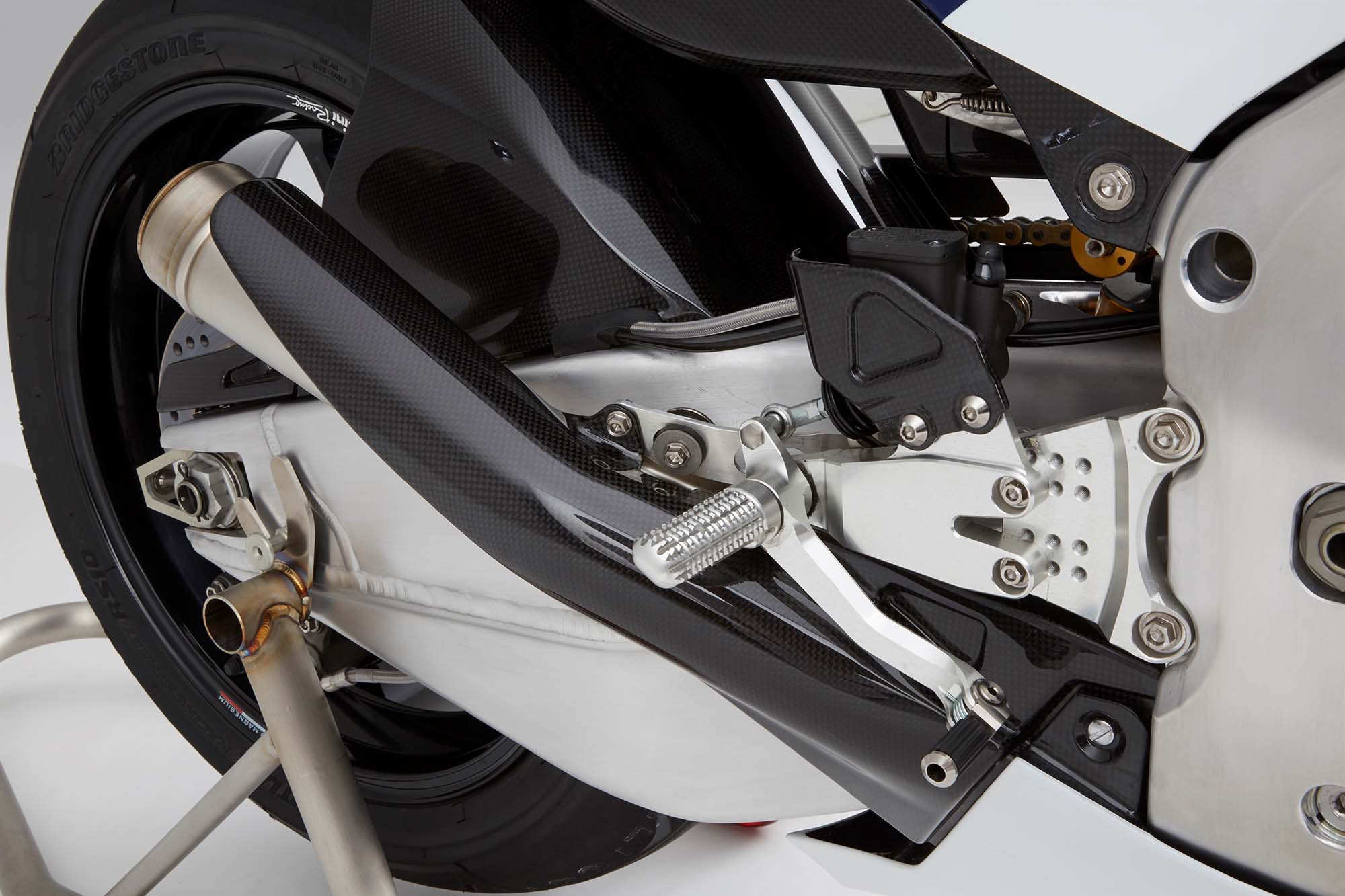 The 2016 Honda RC213V-S will be available in two colors: the HRC Tricolor or plain-jane carbon fiber (our pick). Both colors have carbon fiber fairings, and come with coil spring valves (not pneumatic valves, like on the race bikes). Other changes from the racing machines include the gearbox, tires, brakes, and maximum steering angle.