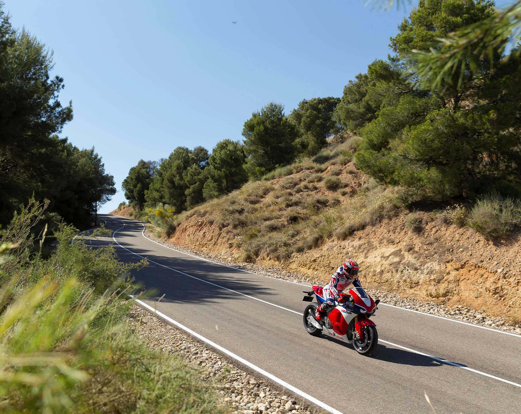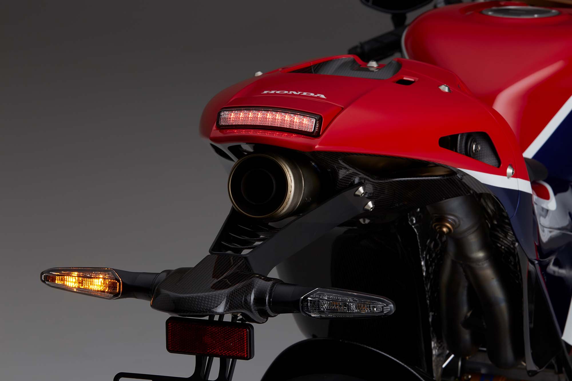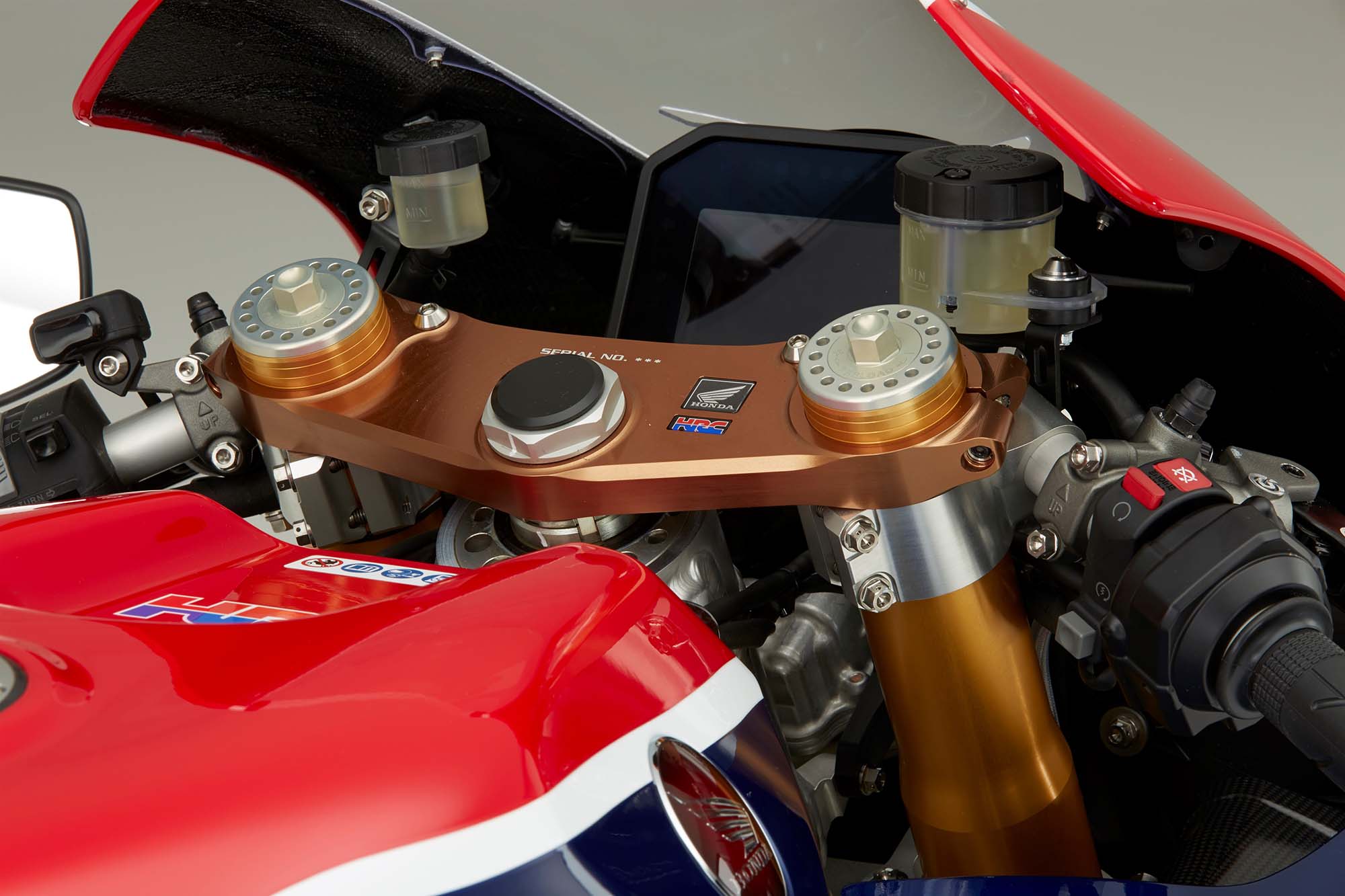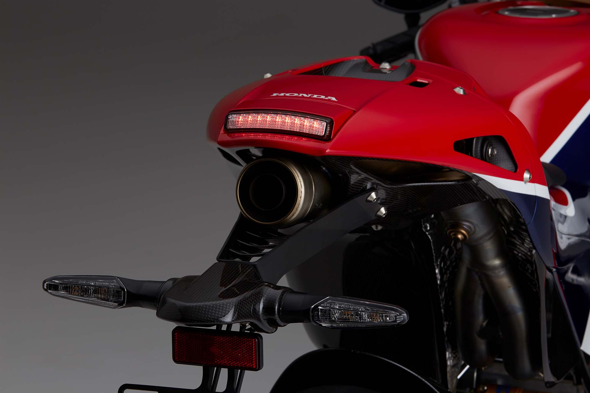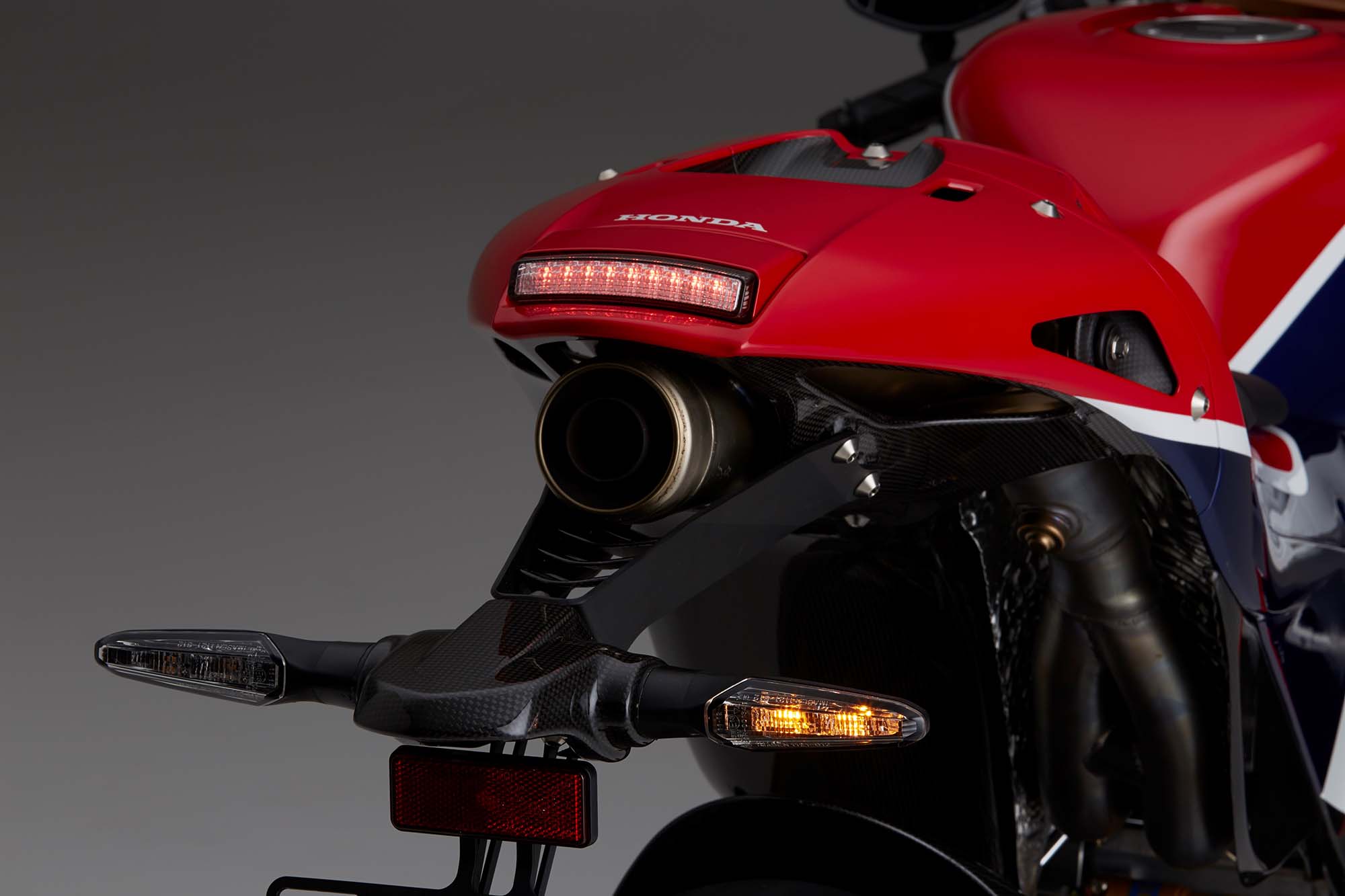 The 2016 Honda RC213V-S will be available in two colors: the HRC Tricolor or plain-jane carbon fiber (our pick). Both colors have carbon fiber fairings, and come with coil spring valves (not pneumatic valves, like on the race bikes). Other changes from the racing machines include the gearbox, tires, brakes, and maximum steering angle.