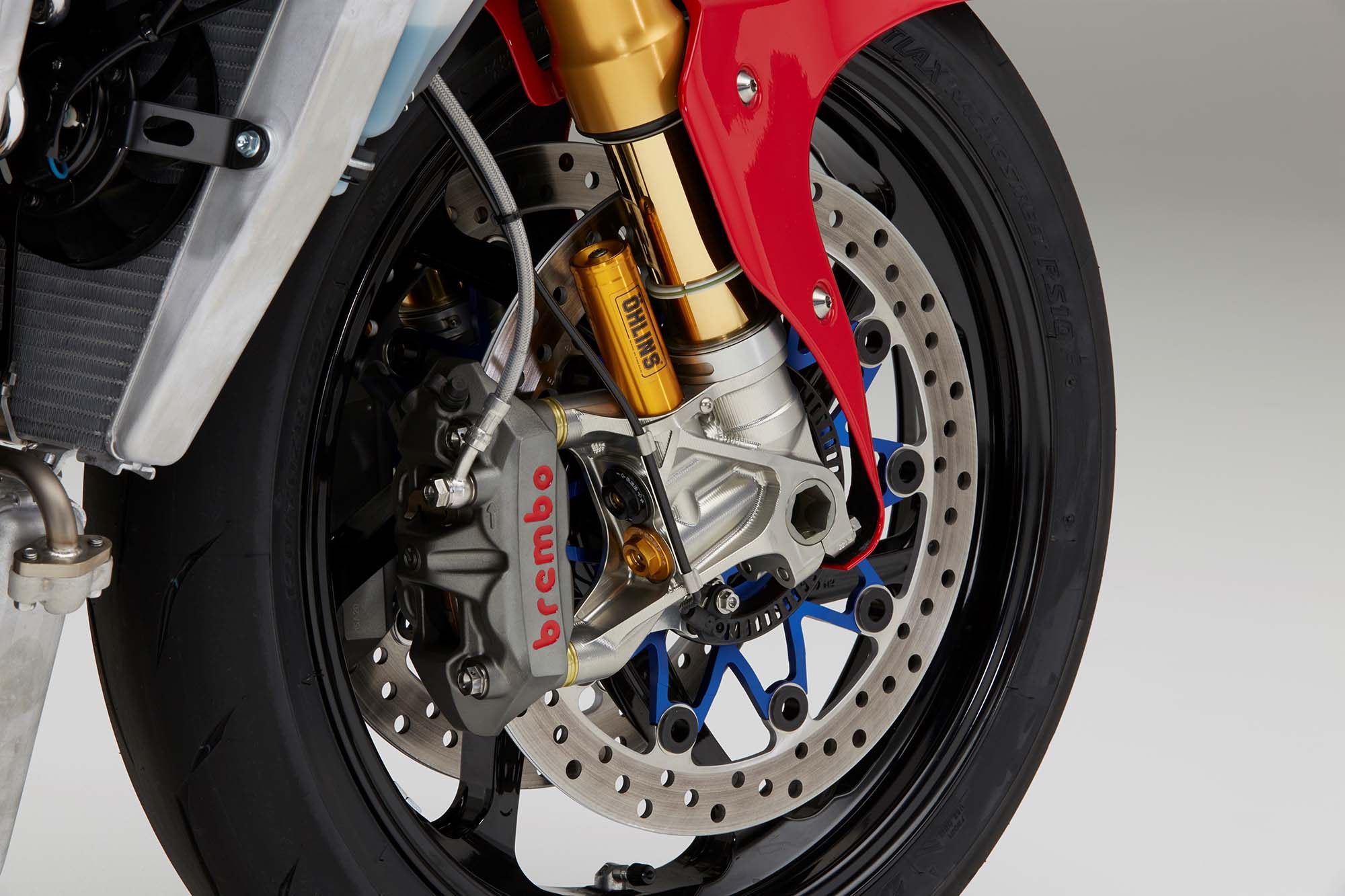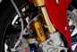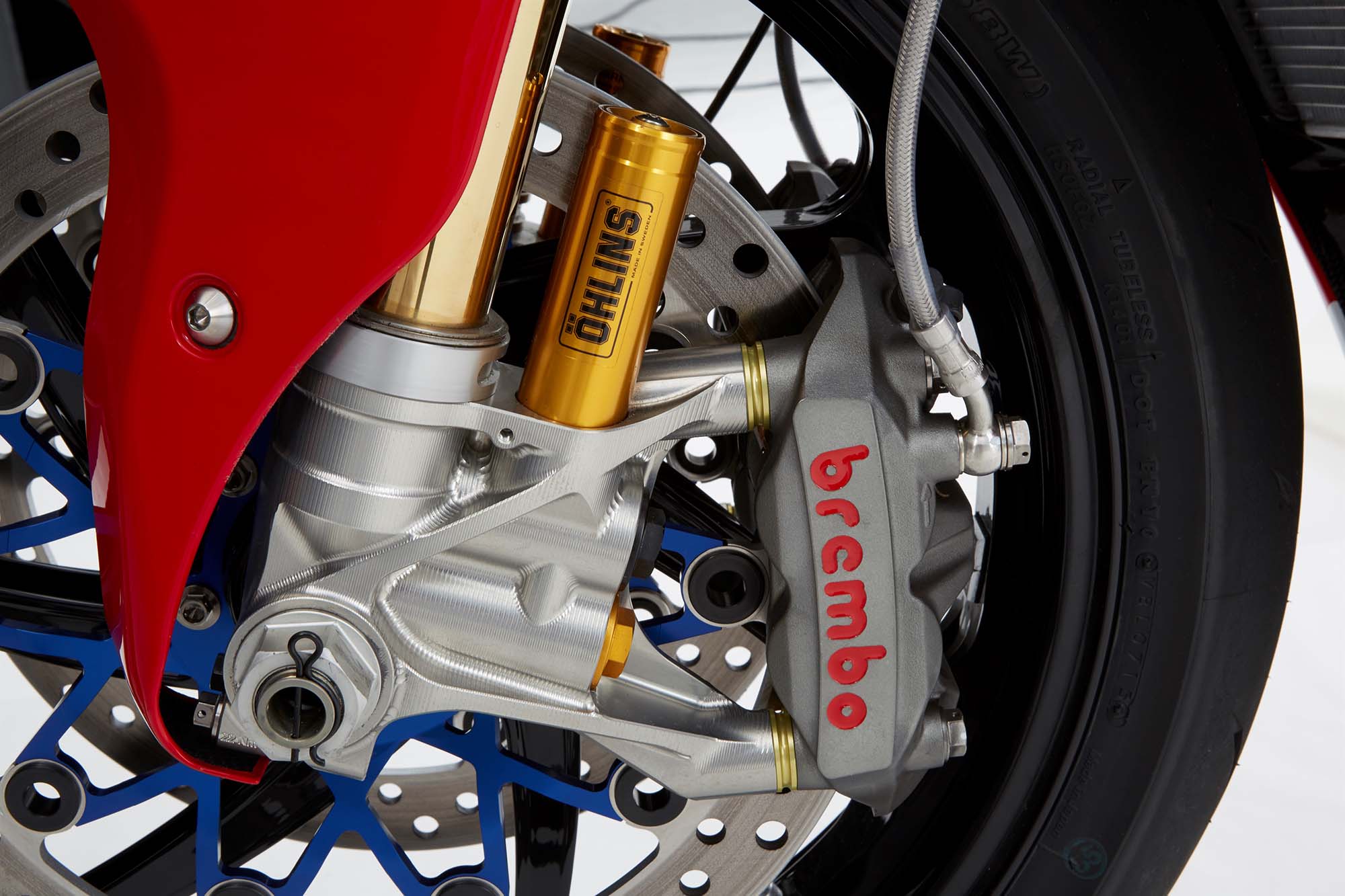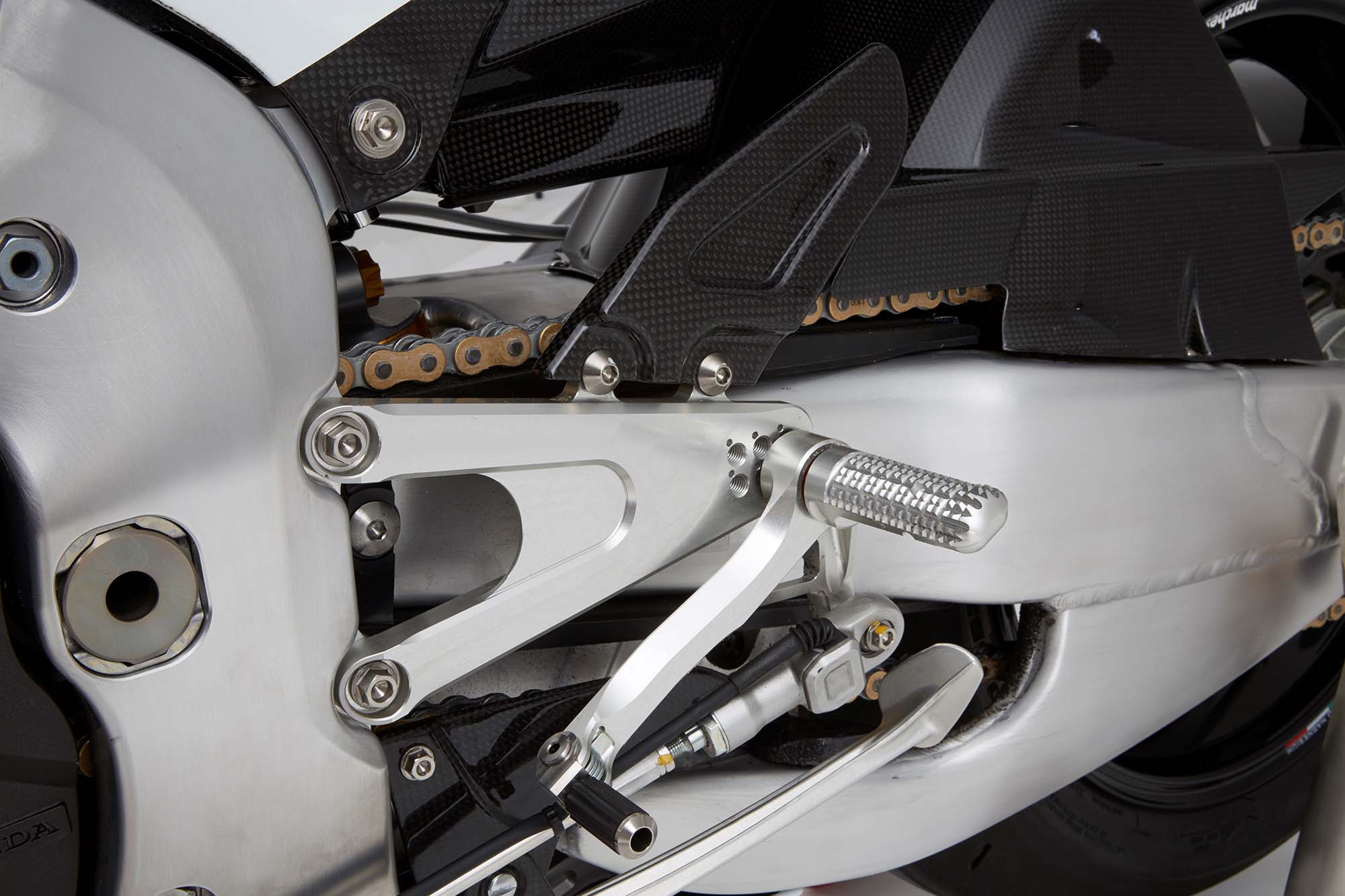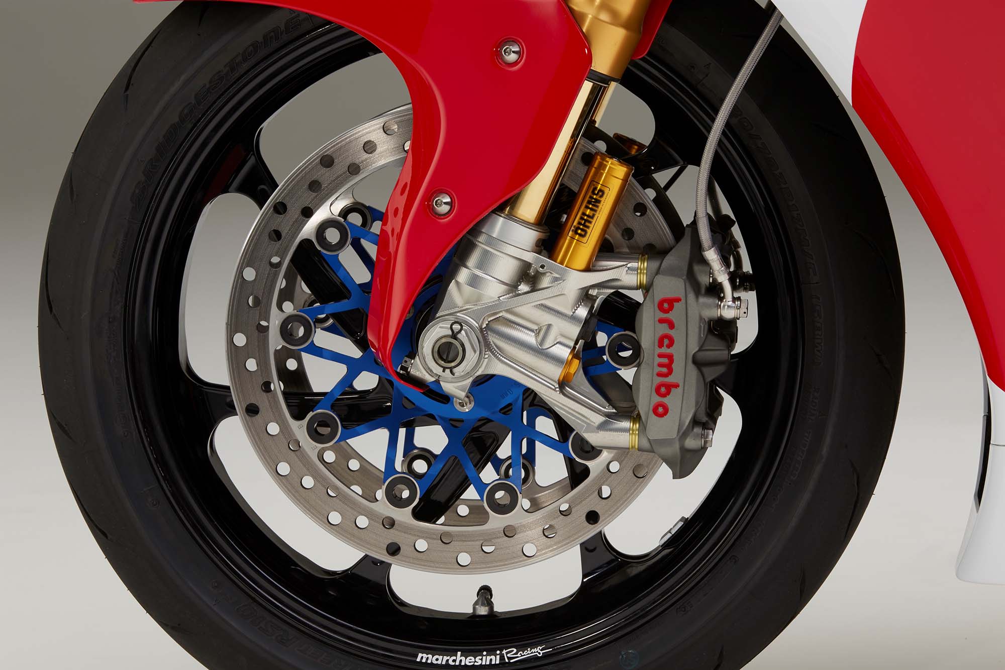 Other items straight from the MotoGP bike are the swingarm, slipper clutch, magnesium Marchesini wheels (17″ inches in size), pressurized Öhlins forks, adjustable footrests and foot controls, as well as most of the Brembo brake components (steel rotors instead of carbon).