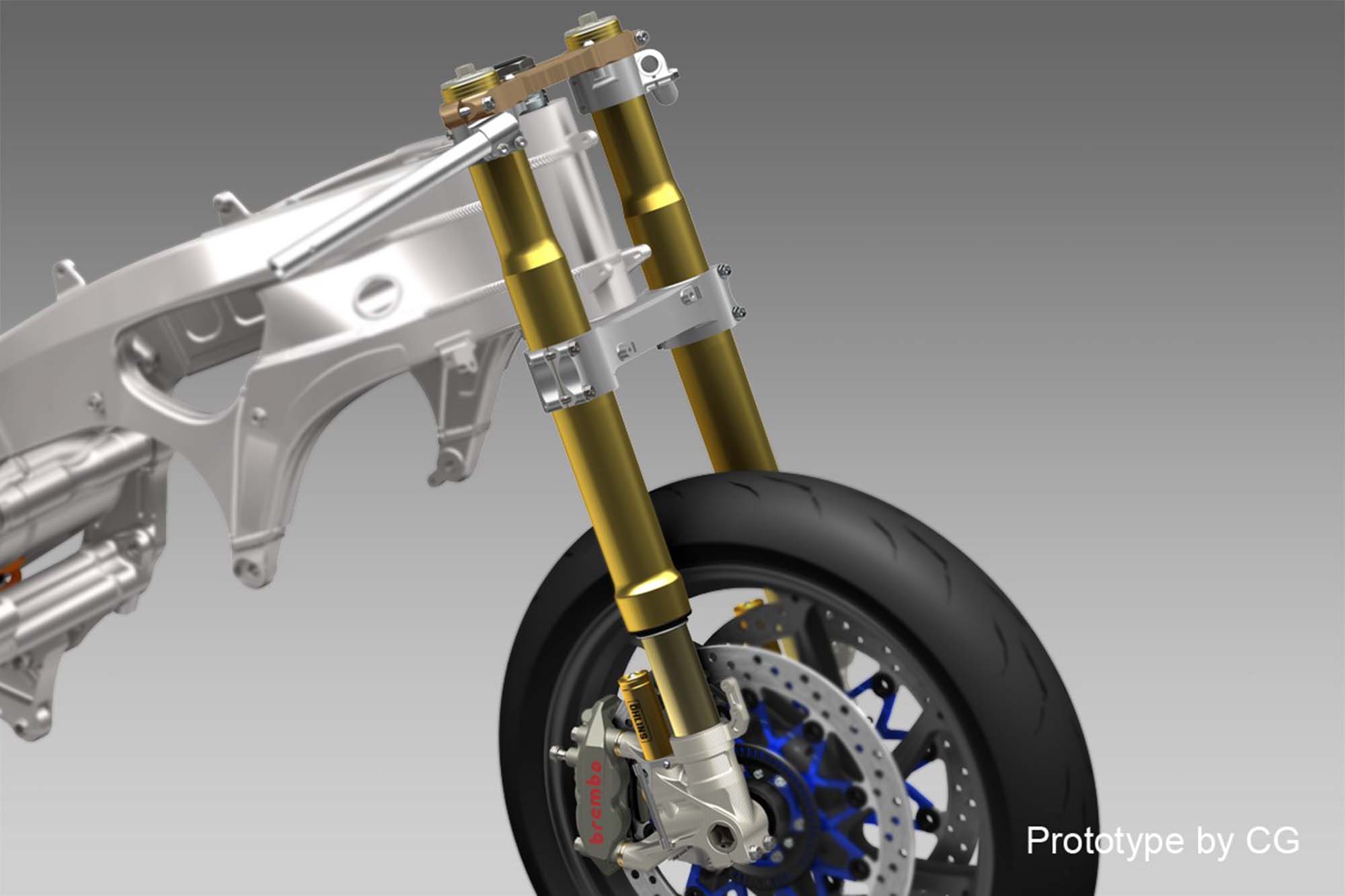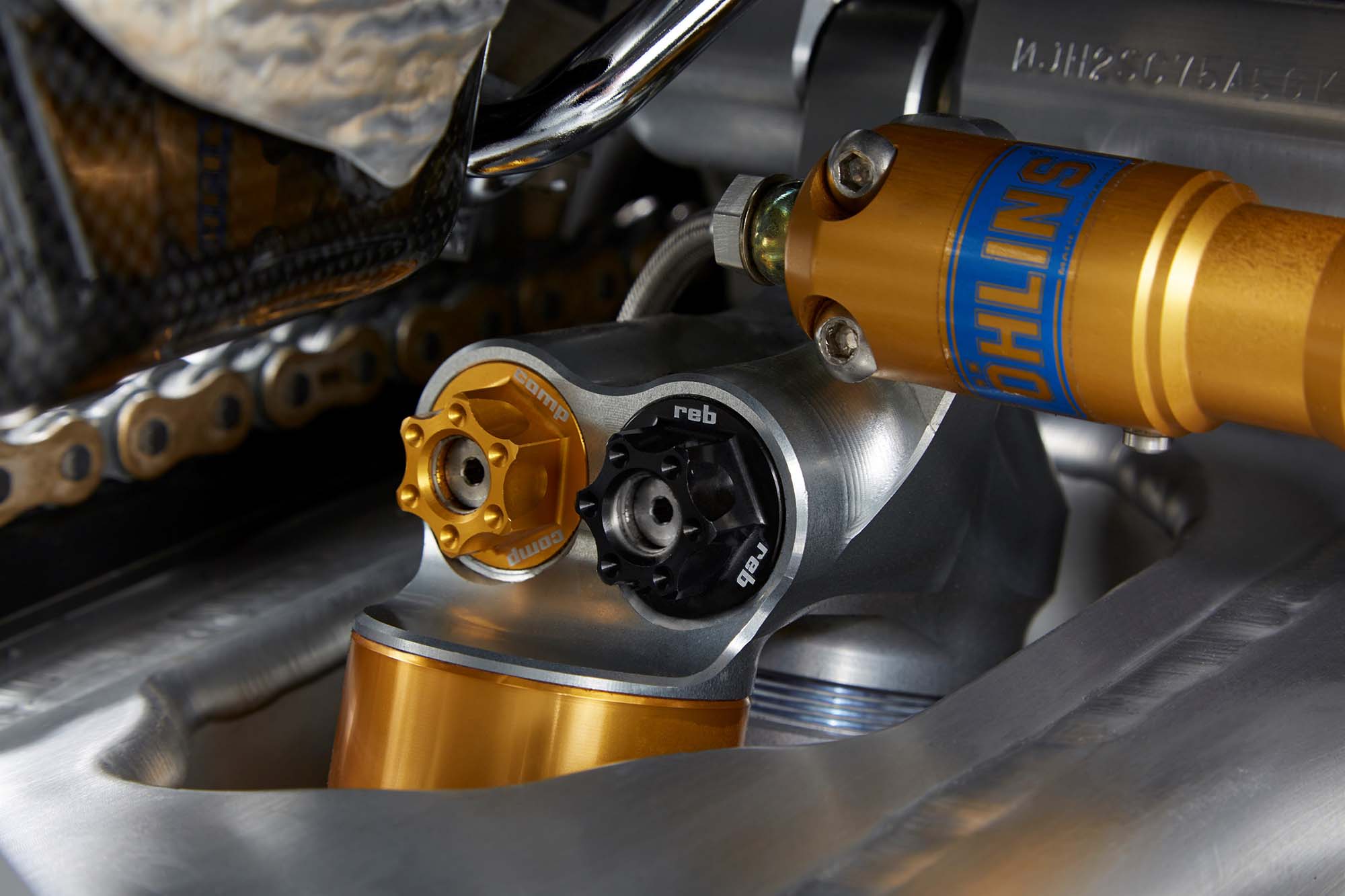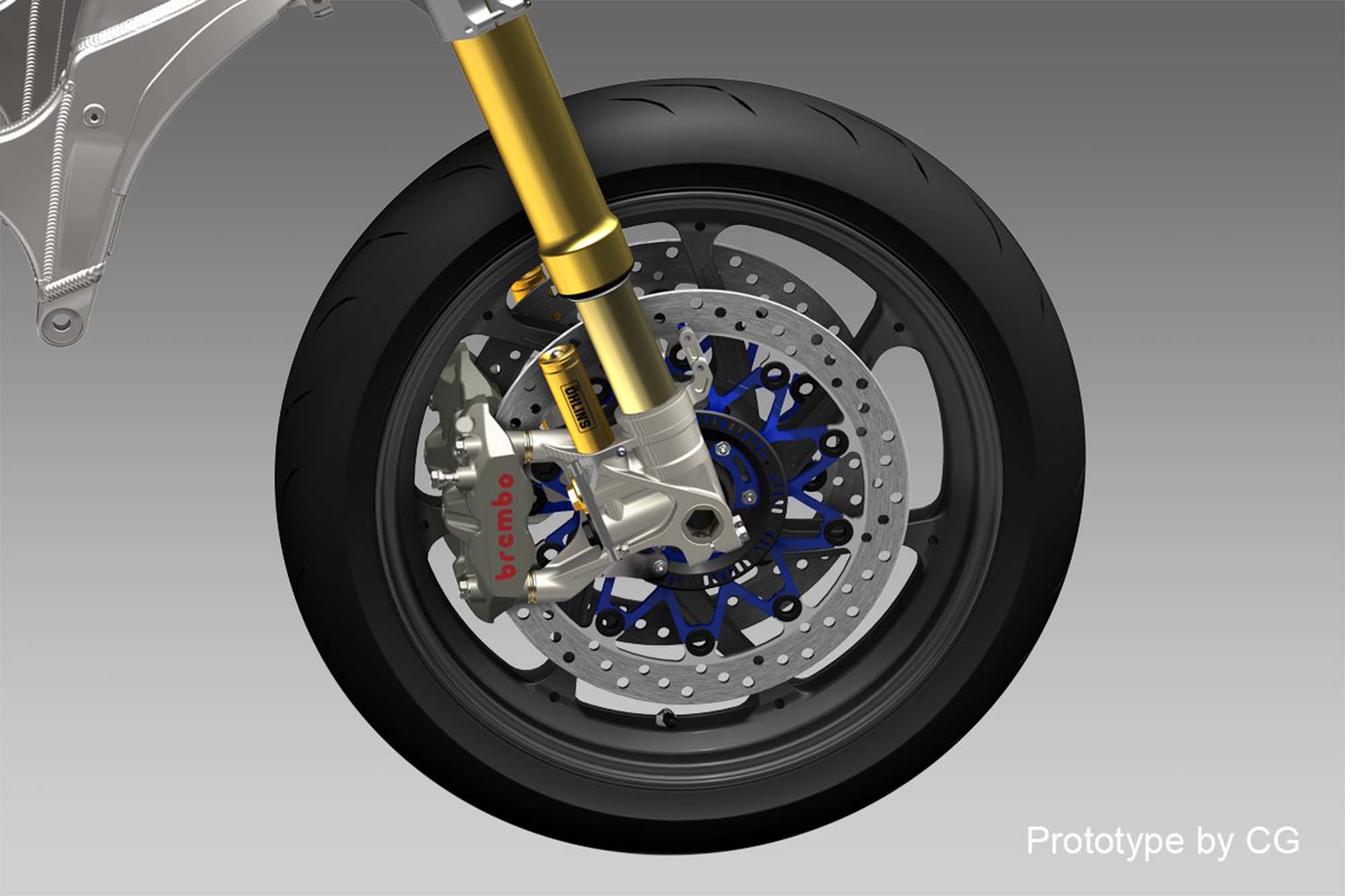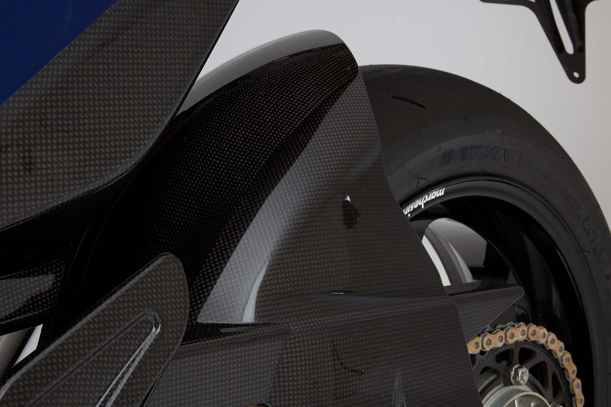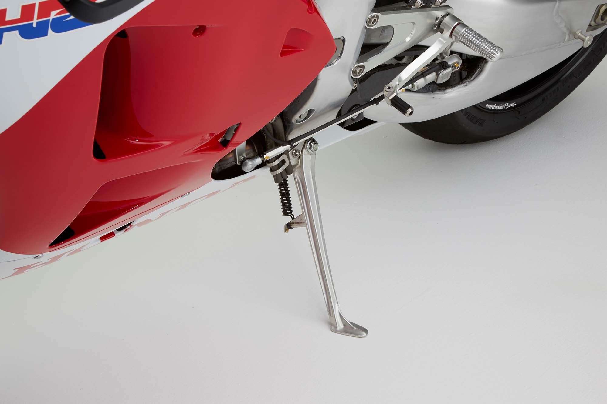 Other items straight from the MotoGP bike are the swingarm, slipper clutch, magnesium Marchesini wheels (17″ inches in size), pressurized Öhlins forks, adjustable footrests and foot controls, as well as most of the Brembo brake components (steel rotors instead of carbon).