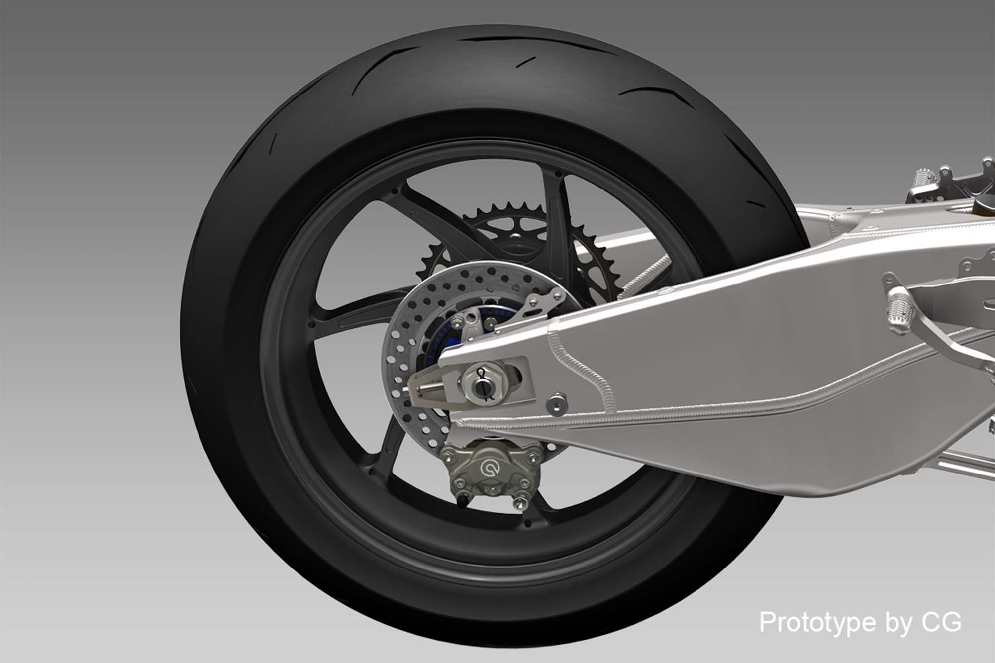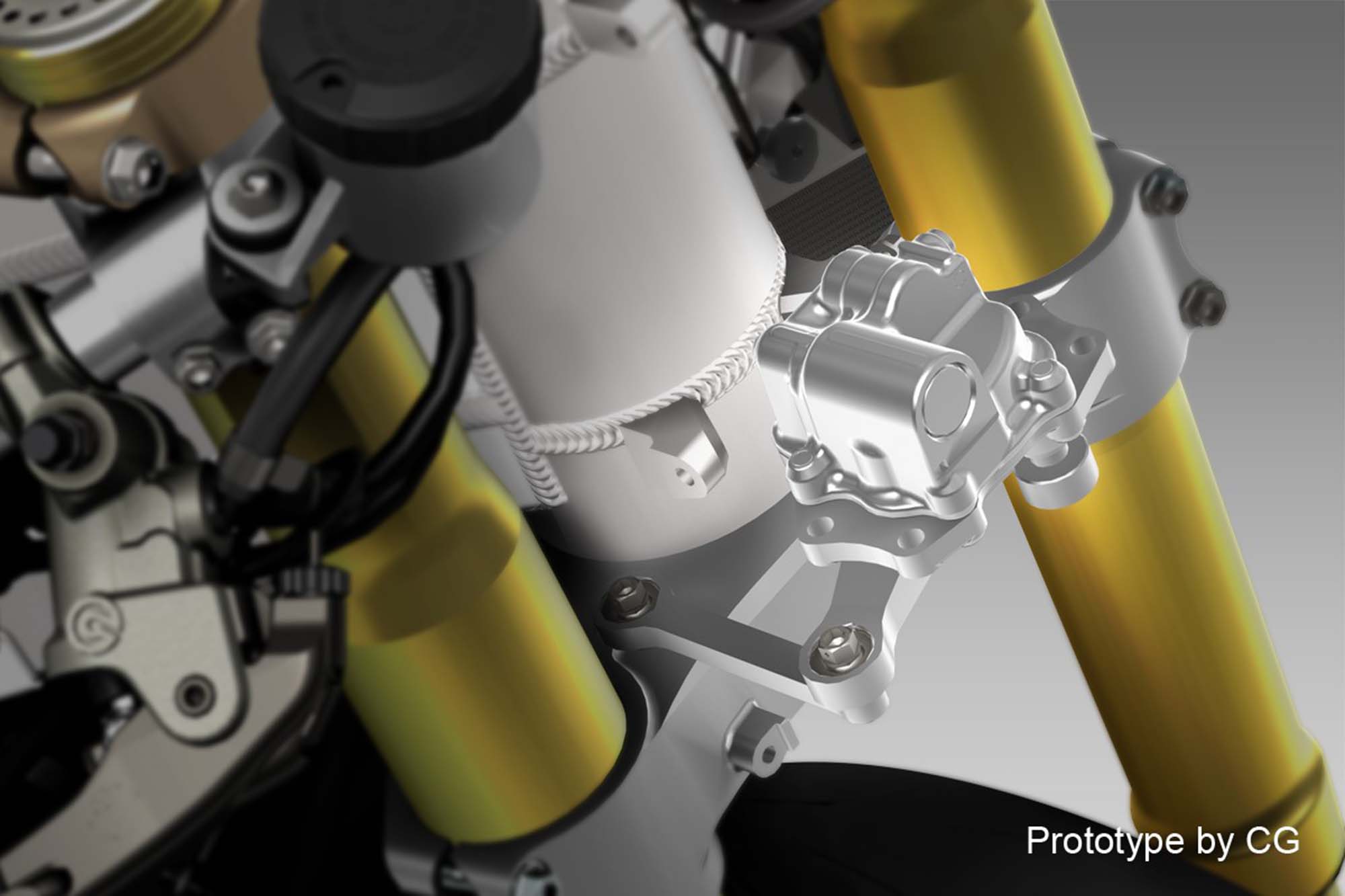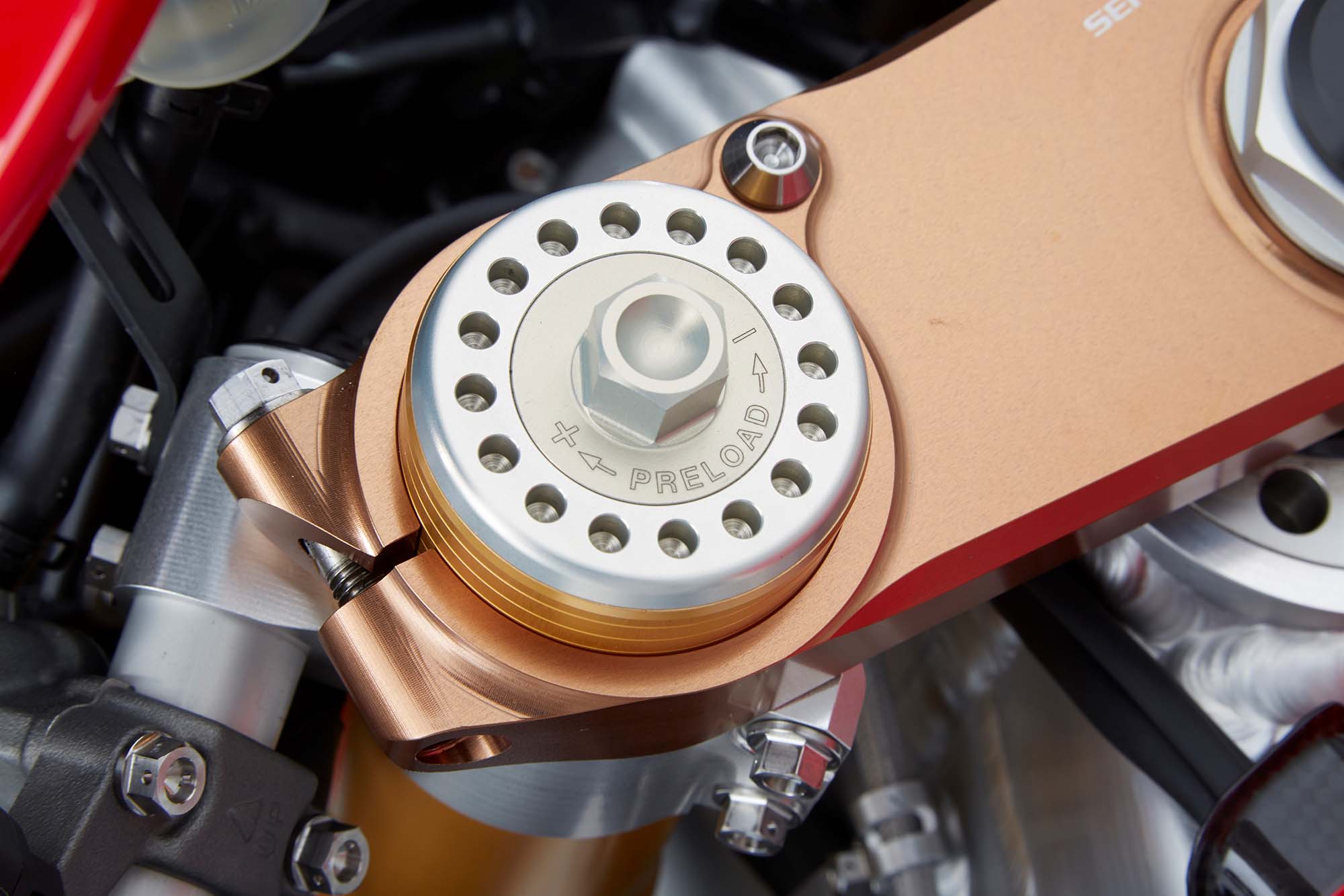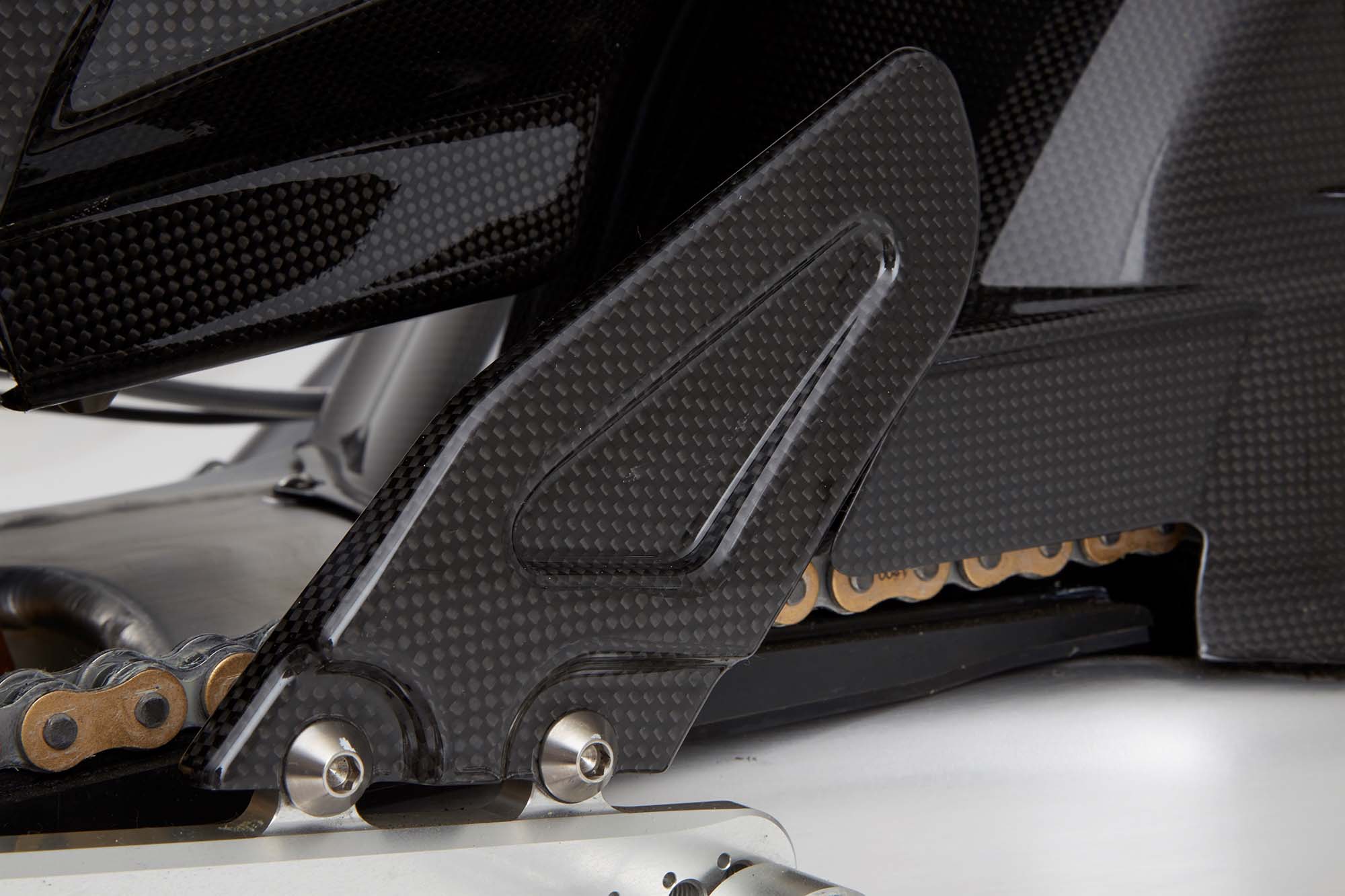 Other items straight from the MotoGP bike are the swingarm, slipper clutch, magnesium Marchesini wheels (17″ inches in size), pressurized Öhlins forks, adjustable footrests and foot controls, as well as most of the Brembo brake components (steel rotors instead of carbon).