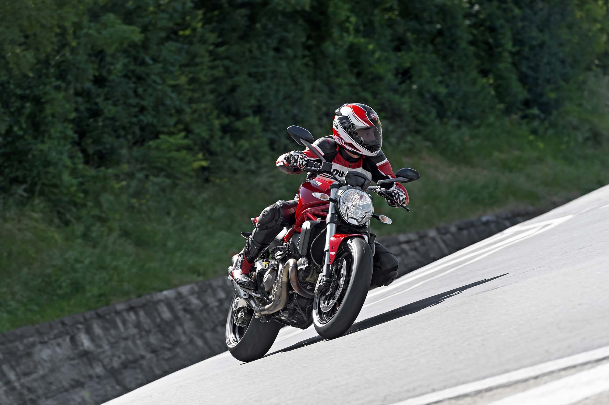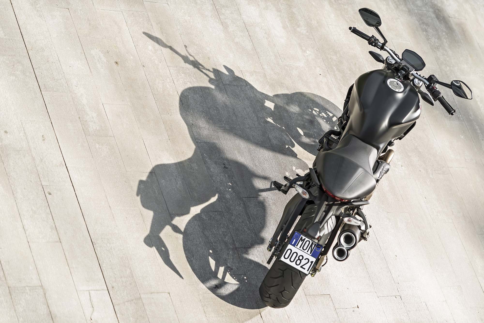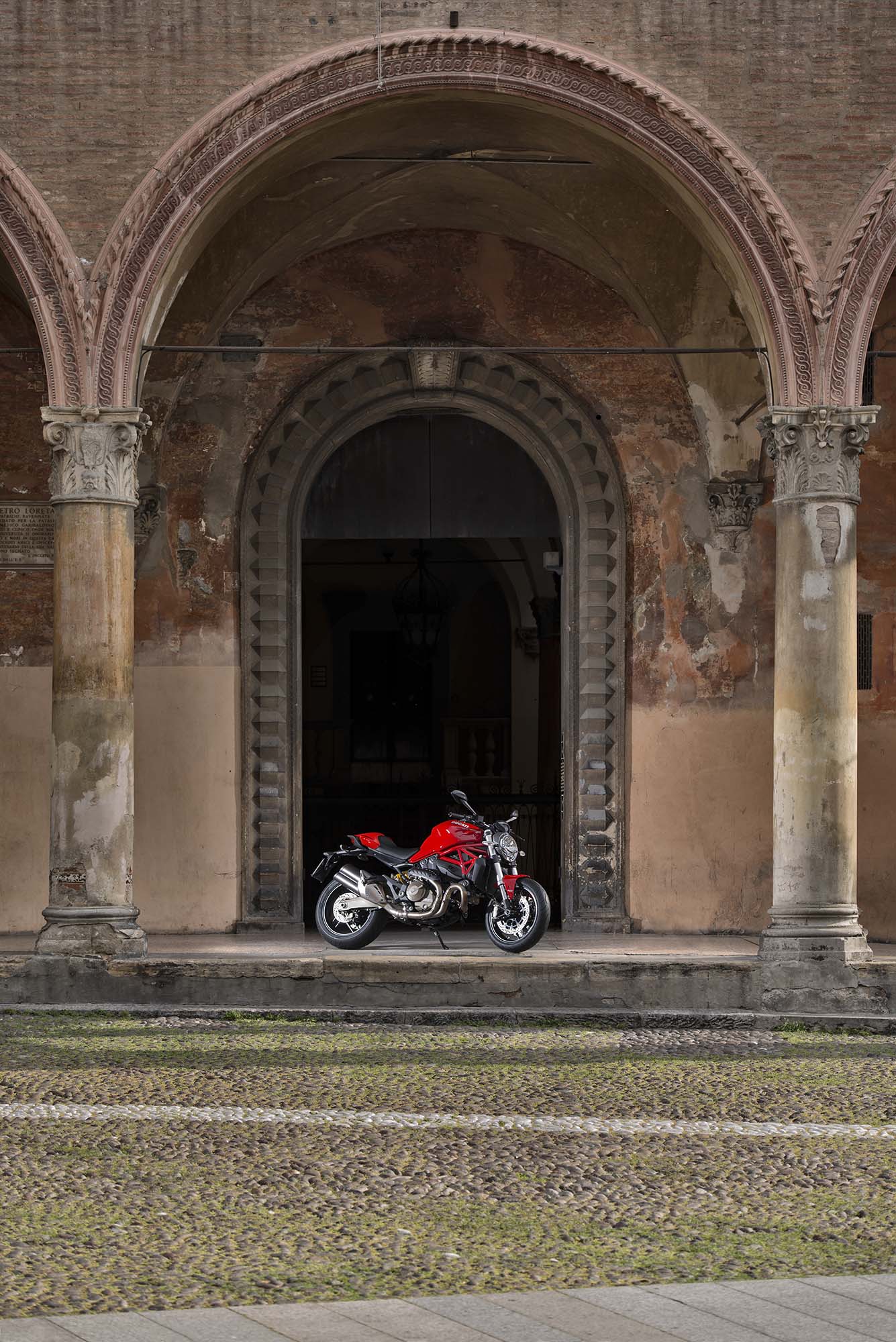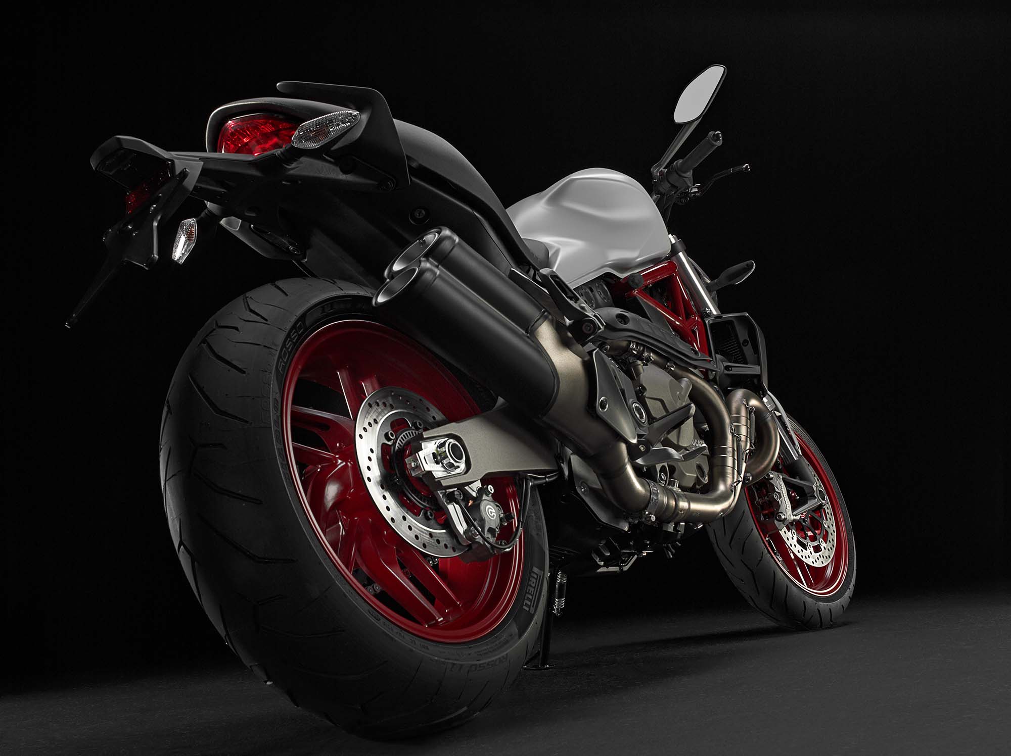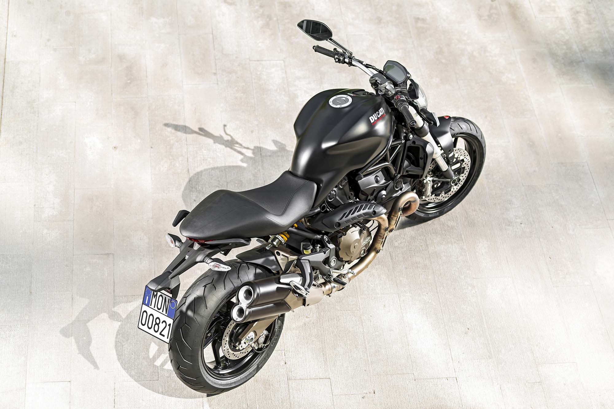 Visually very similar to the Monster 1200, the Monster 821 distinguishes itself with lower-spec components, and more noticeably with a double-sided swingarm.