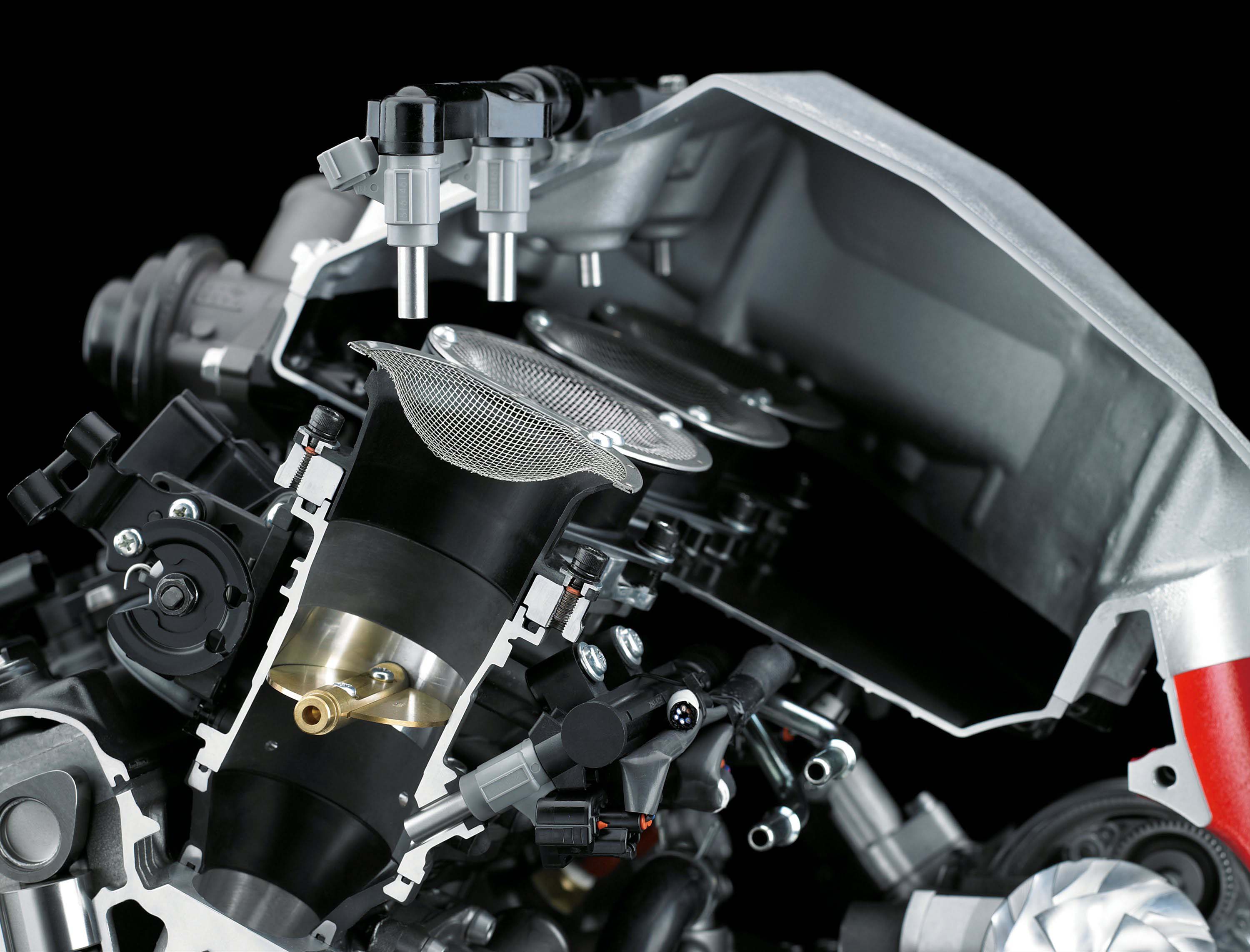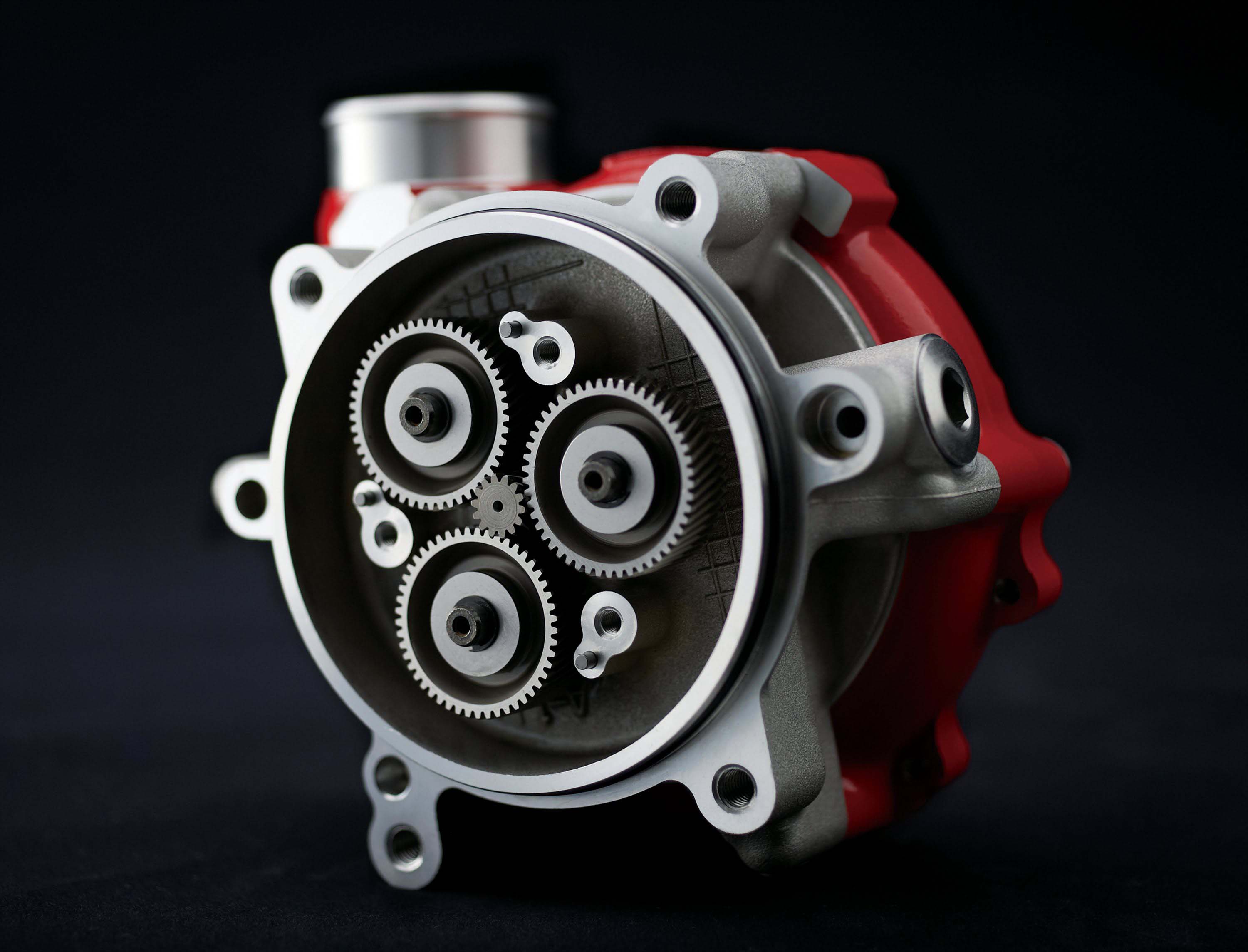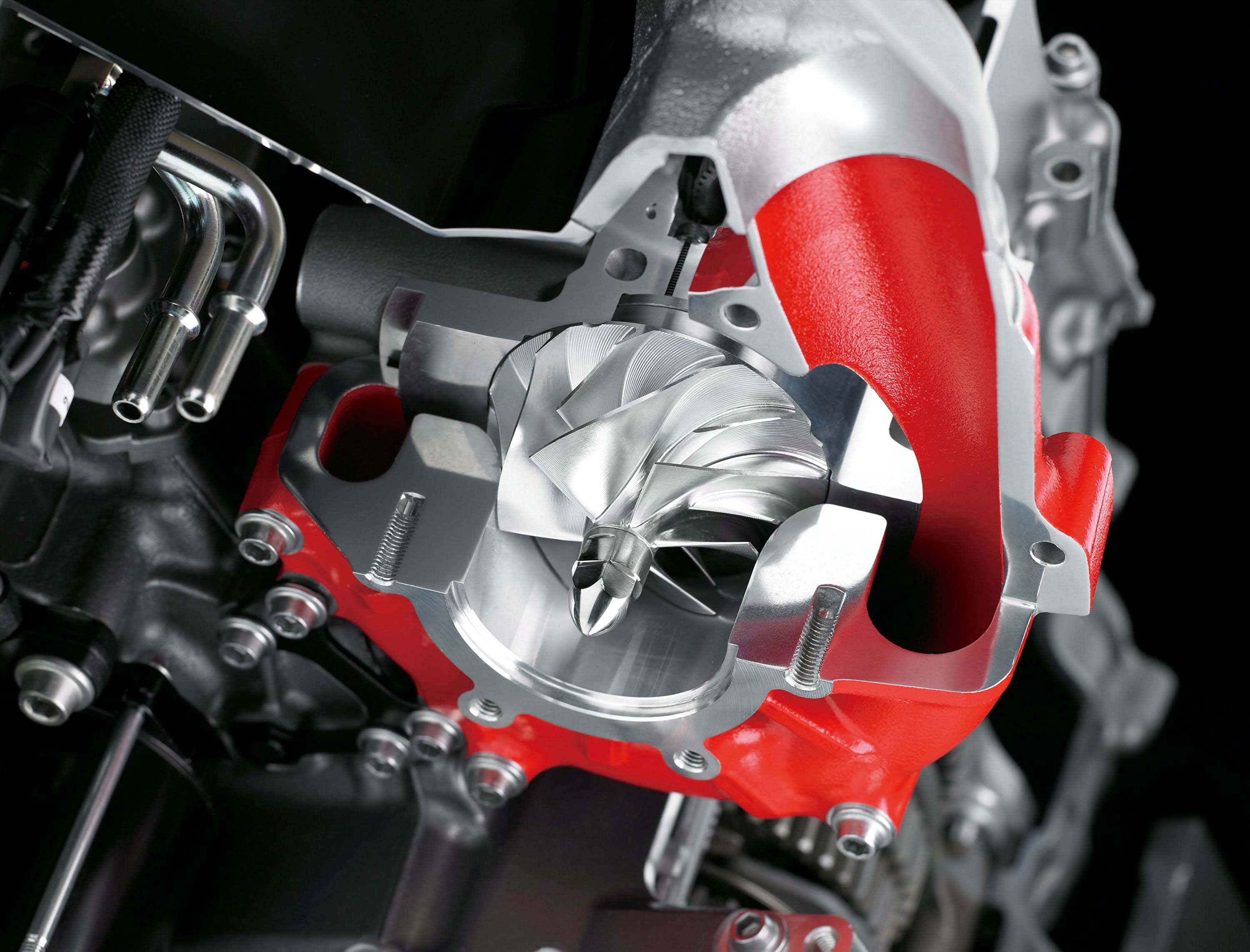 Kawasaki has designed its supercharger system to have two-step gear-ratio, allowing for maximum boost and low and high engine speeds, and the supercharger impeller reaches 130,000 rpm when the Kawasaki Ninja H2 is at its 14,000 rpm redline. Peak torque is 98 lbs•ft, at 10,500 rpm, with the supercharger primarily helping to broaden the powerband for better street riding.