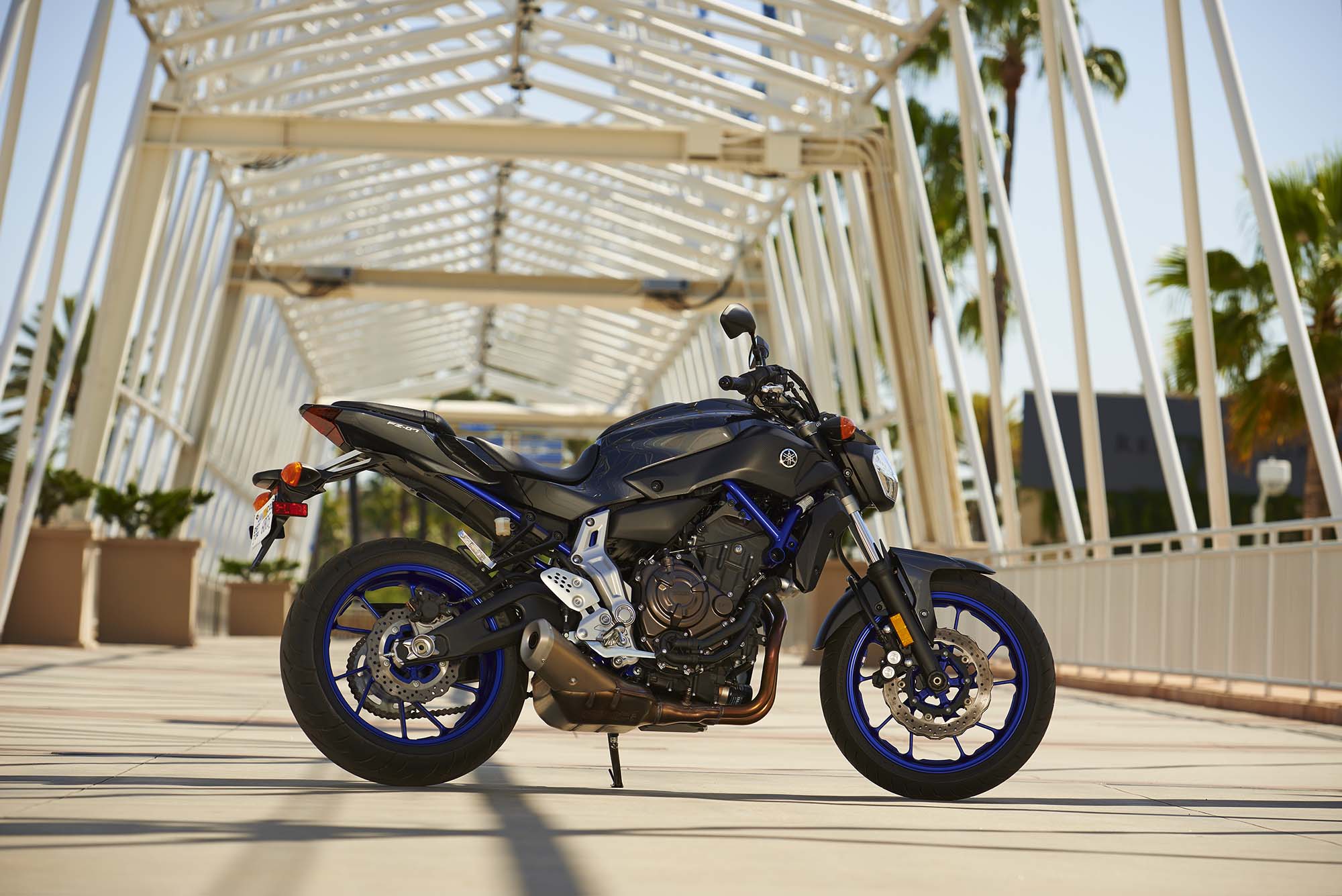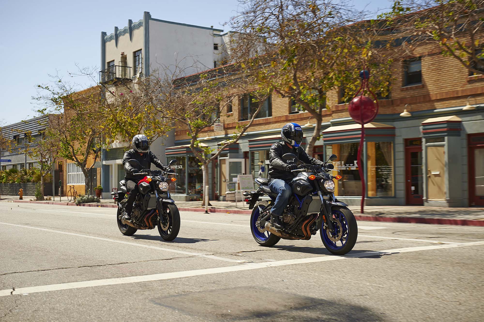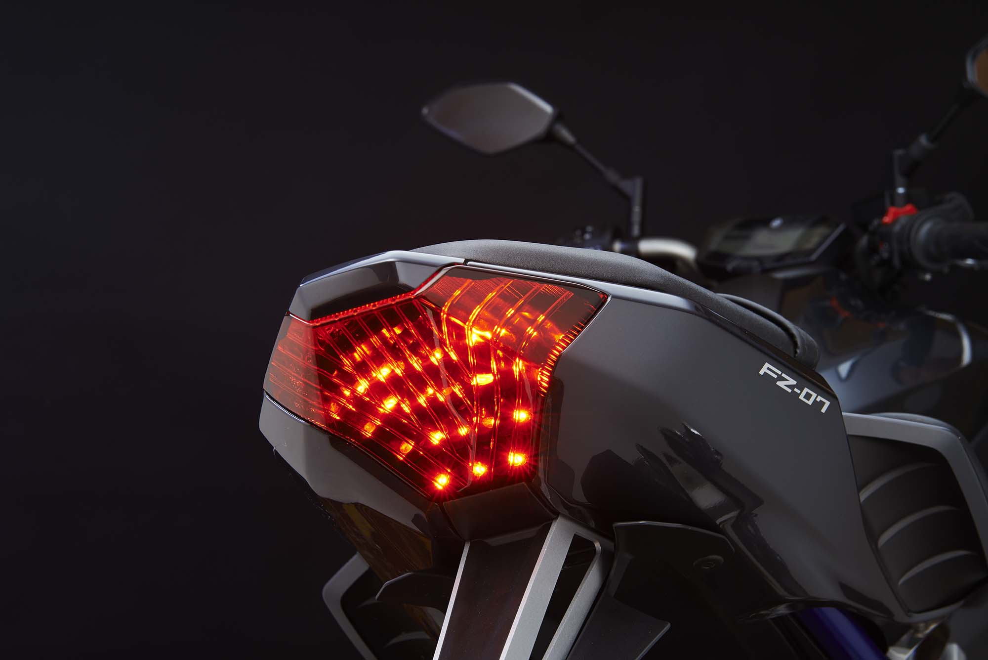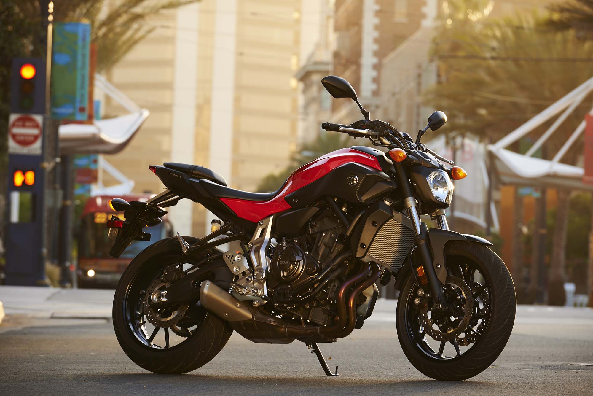 Tipping the scales 17 lbs lighter than the FZ-09 (397 lbs wet), the Yamaha FZ-07 is sans a cylinder, helping differentiate it further from its counterpart. Thus using a 689cc parallel-twin engine, the FZ-07 is good for a peppy 74hp and 50 lbs•ft of torque.