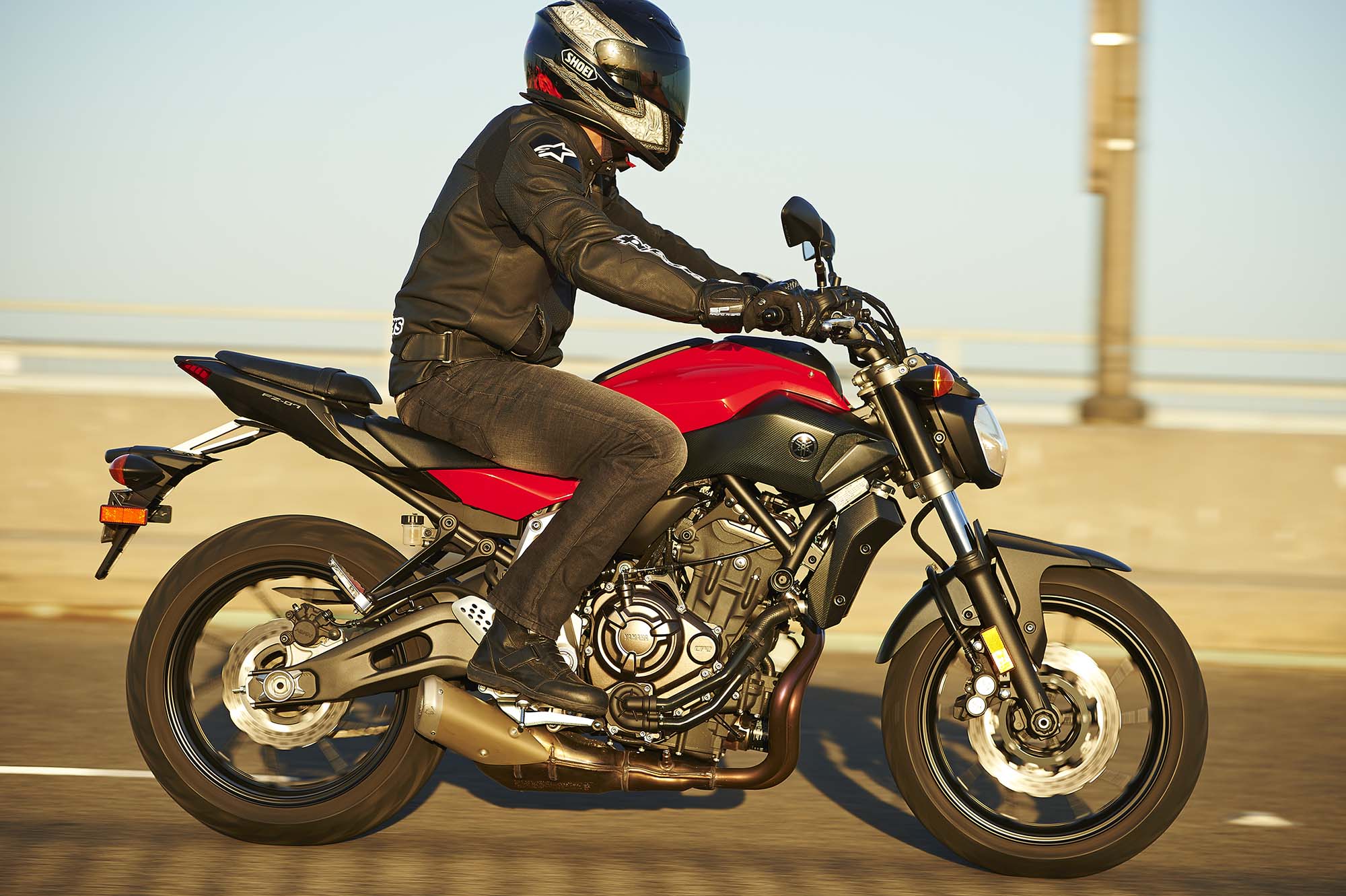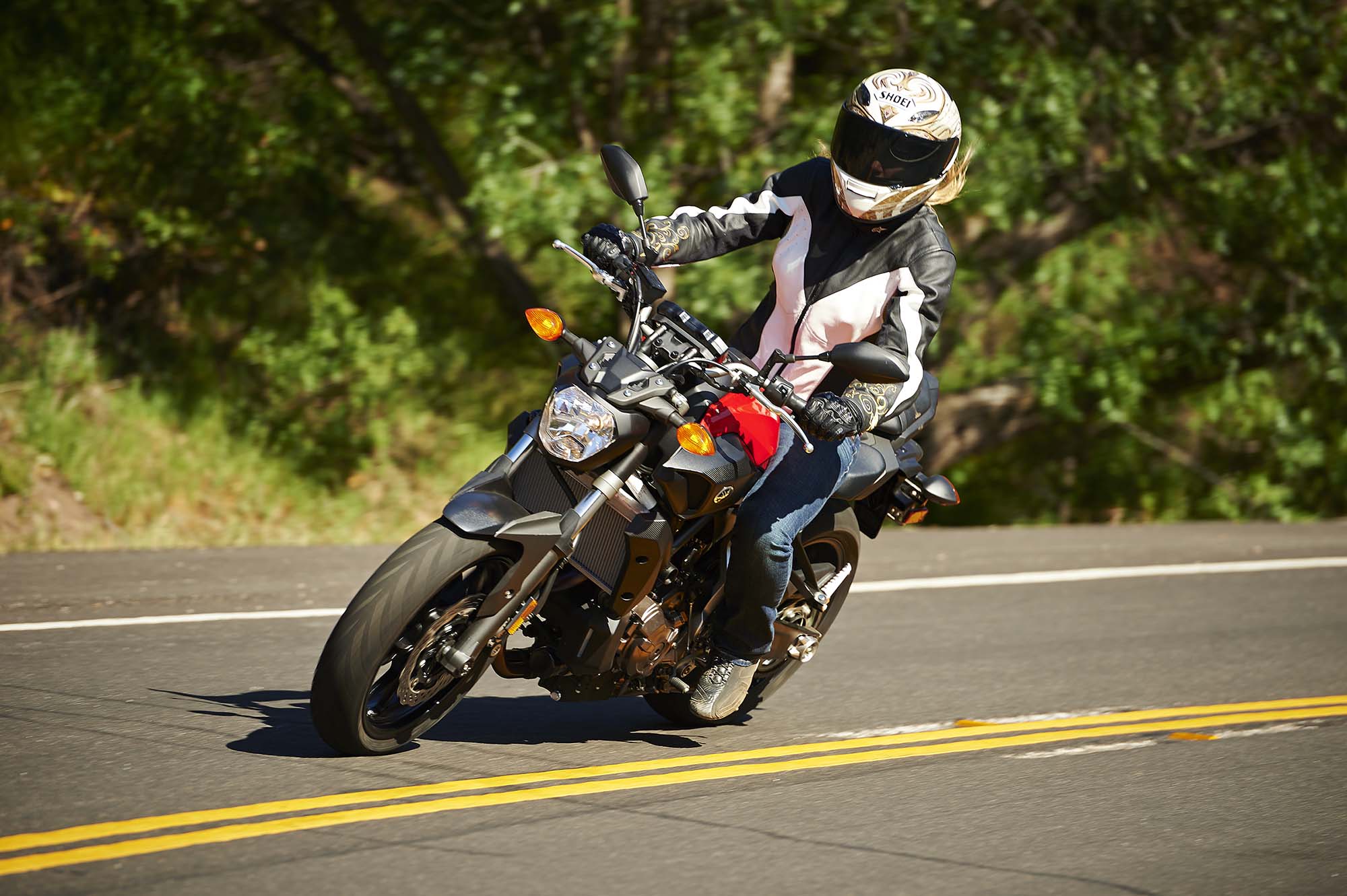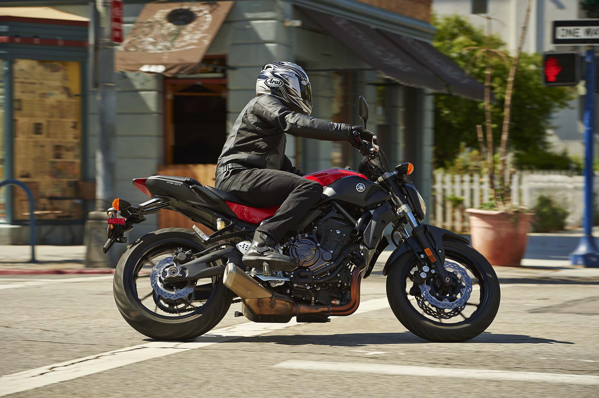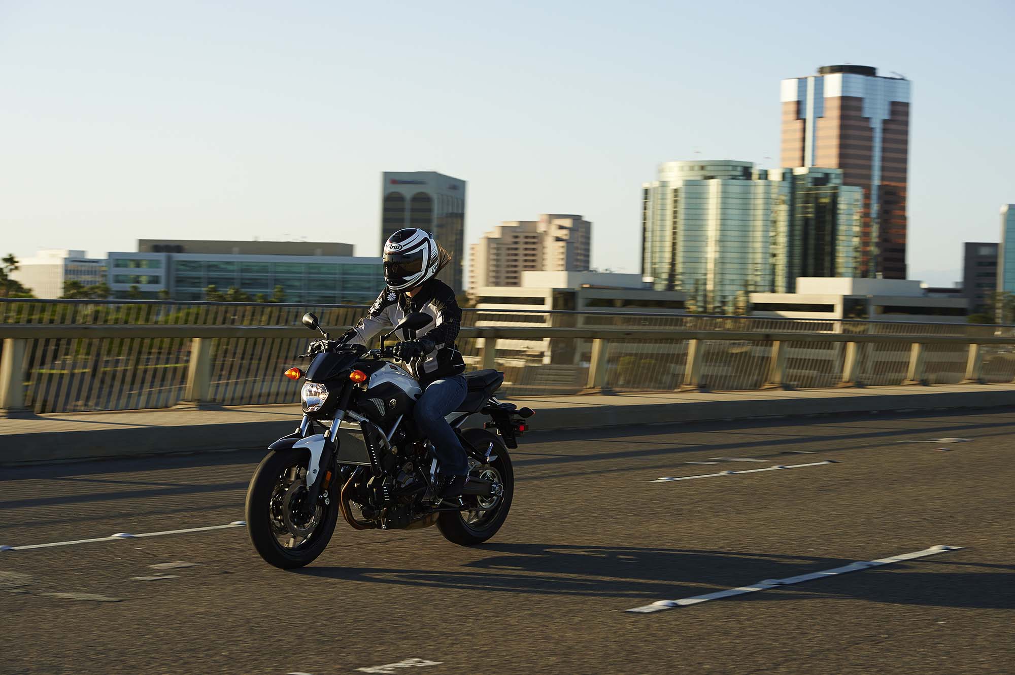 Tipping the scales 17 lbs lighter than the FZ-09 (397 lbs wet), the Yamaha FZ-07 is sans a cylinder, helping differentiate it further from its counterpart. Thus using a 689cc parallel-twin engine, the FZ-07 is good for a peppy 74hp and 50 lbs•ft of torque.