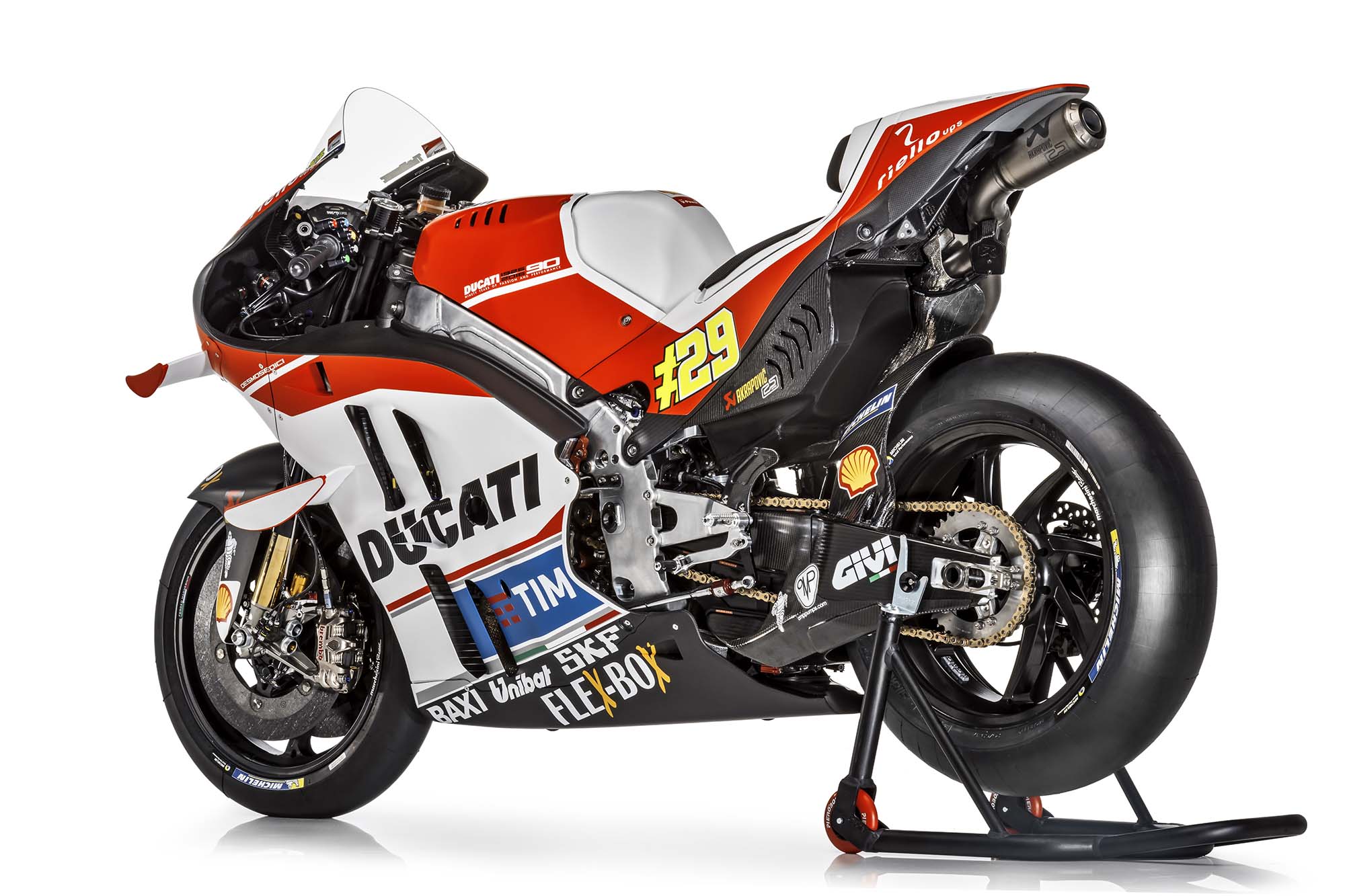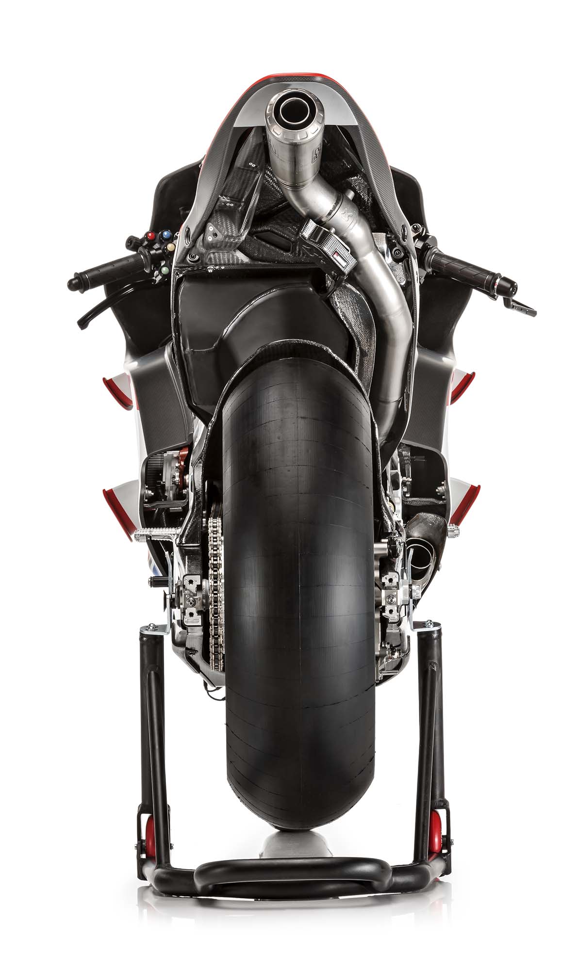 The Akrapovi? exhaust system has been changed slightly as well, with its low-mount can tucked nicely away into the Desmo 16 GP’s belly pan.