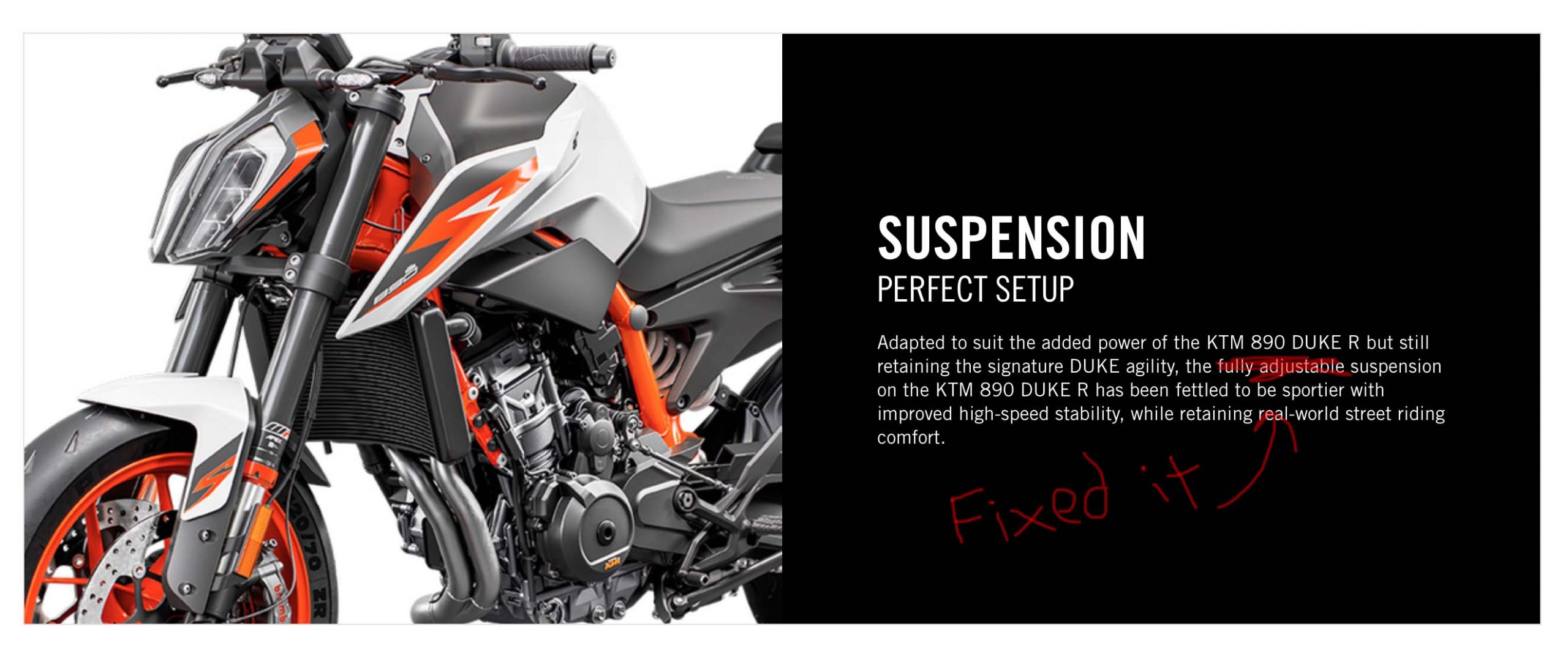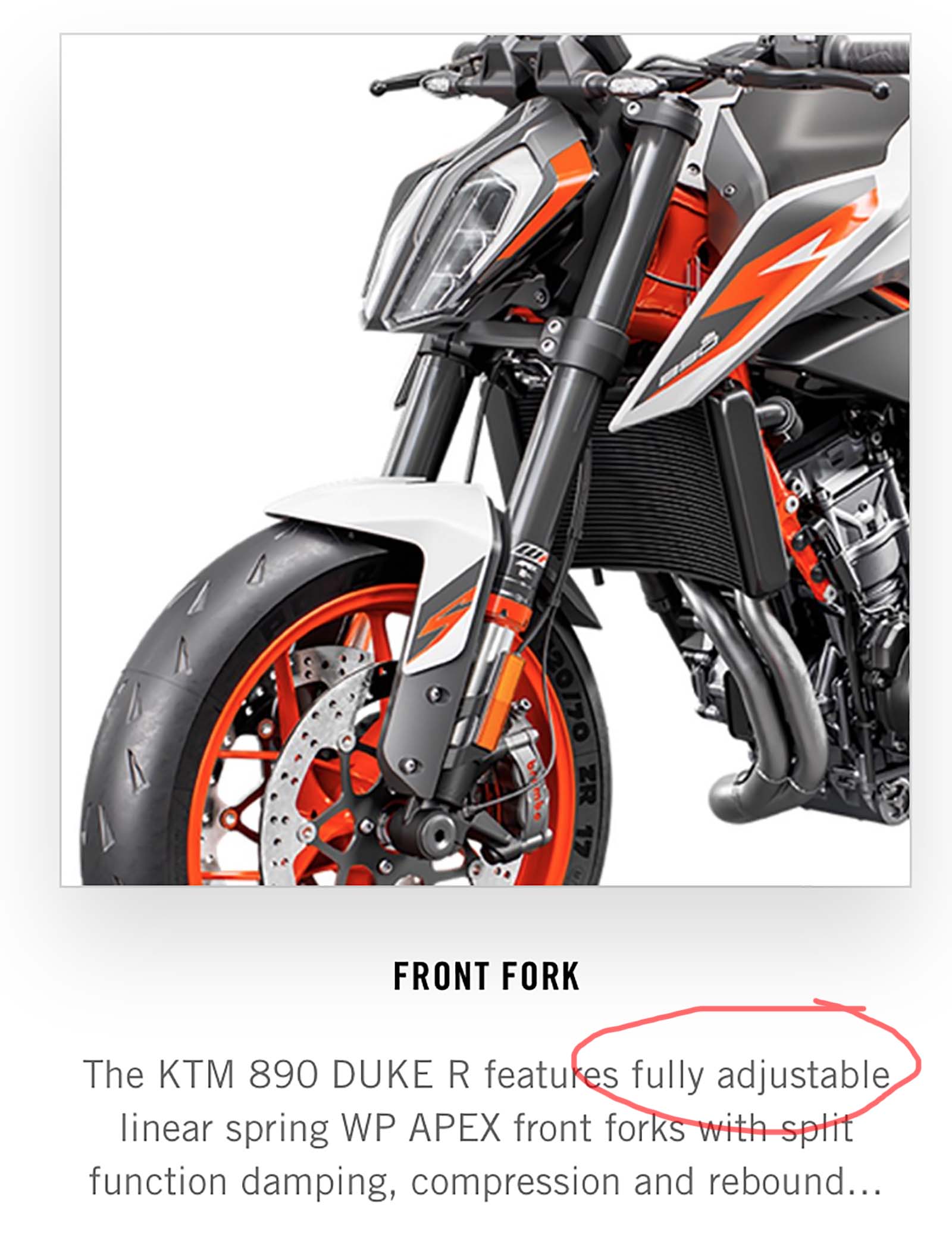 “Thank you for pointing that out, in the preparation of these texts we may have been a bit overzealous in the descriptions, our apologies, we will correct it. The suspension on the 890 DUKE R is of a very high level, with a measured control of damping and the separate compression (30 clicks) and rebound (28 clicks) adjustment on the fork ensure that the bike can be setup properly for all riders.”