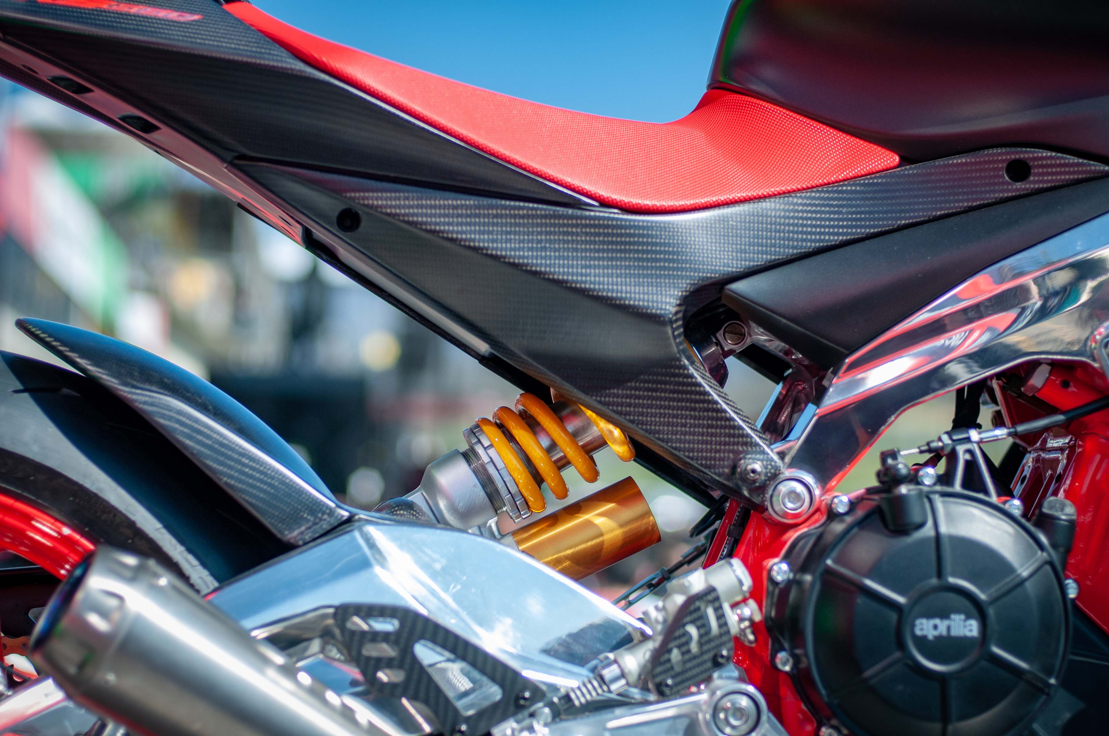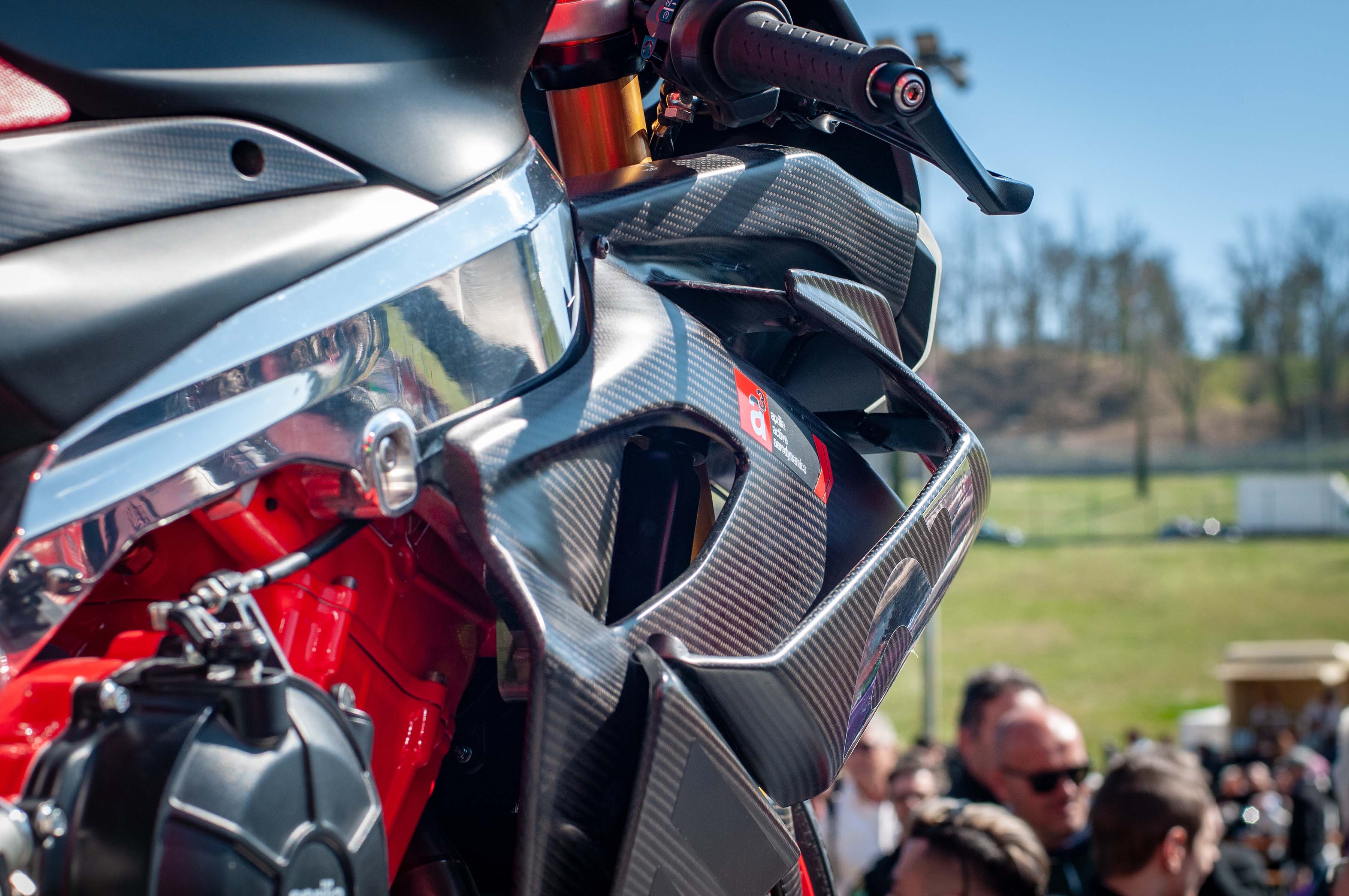 The Italian company has no shortage of carbon fiber pieces on the machine. The tail section seems to be a completely self-supporting carbon fiber unit (just like the company’s litany of GP bikes), and the swingarm seems to partially employ the composite material as well.