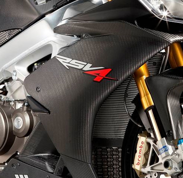 It seems Aprilia is getting ready to offer street-ready carbon fiber body panels for the RSV4 superbike, which should help well-financed Aprilia owners unload a maximum amount of cash for a minimal amount of actual performance increase (it’ll look good though). Composed of a carbon/kevlar/carbon layered composite, pricing for the carbon fiber fairings is being bantered around at about $5,000 for the carbon belly pan, front fairing, tank cover, air vents, right side panel, left side panel, and carbon tail pieces.