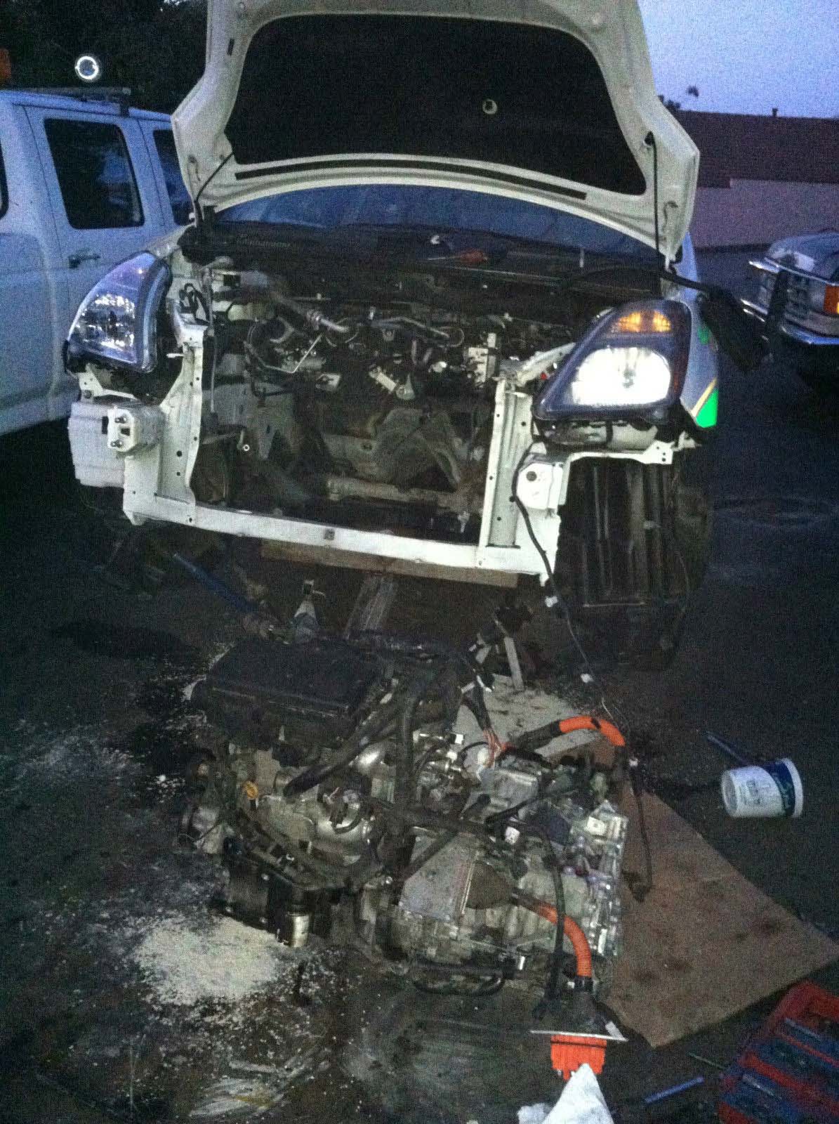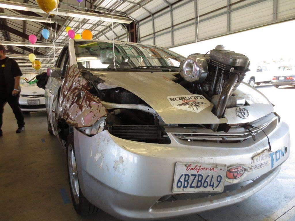 Someone had the audacity/genius, to completely rip out the guts of a 2008 Toyota Prius, and stuff in a Harley Davidson motor from 1986.