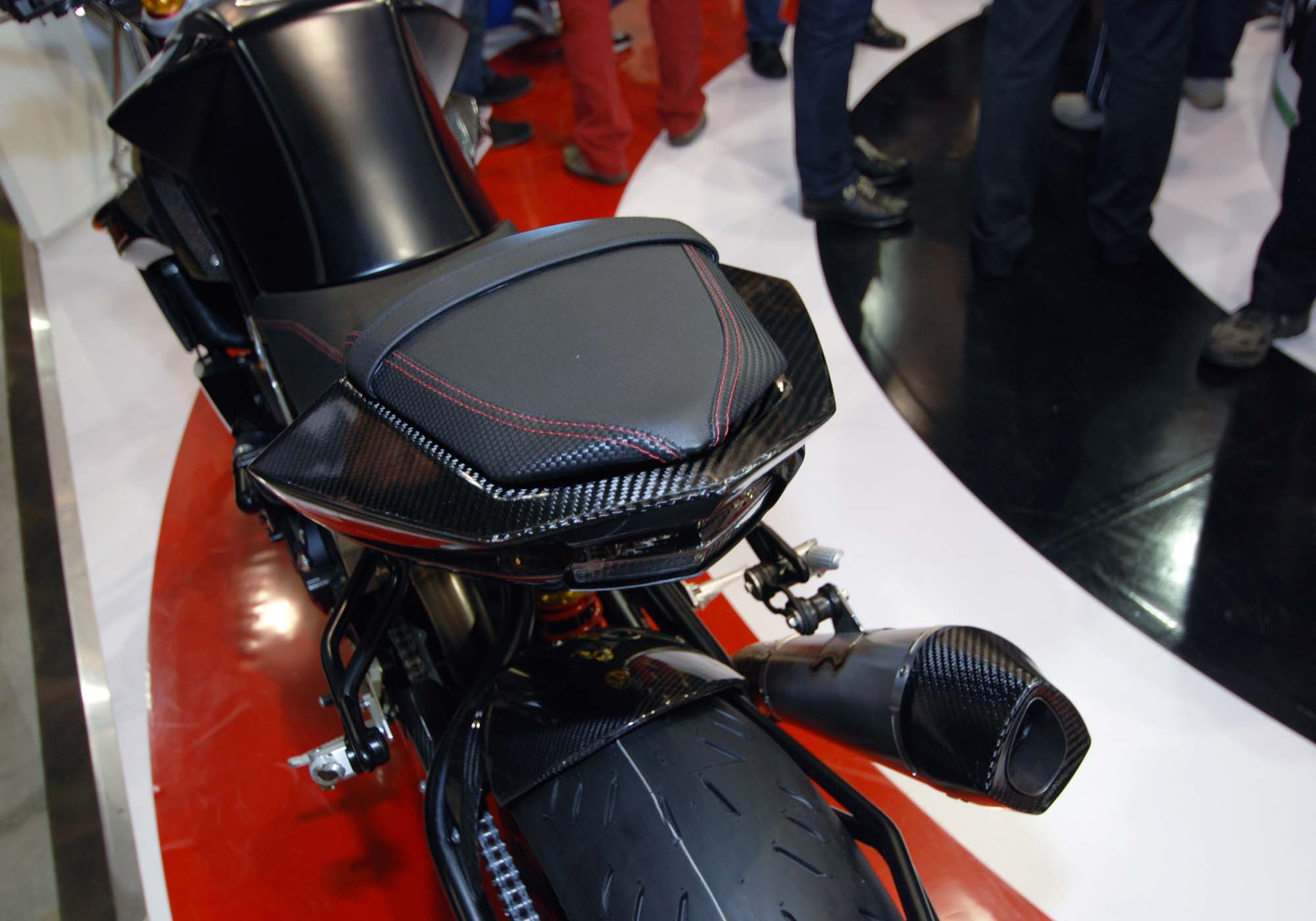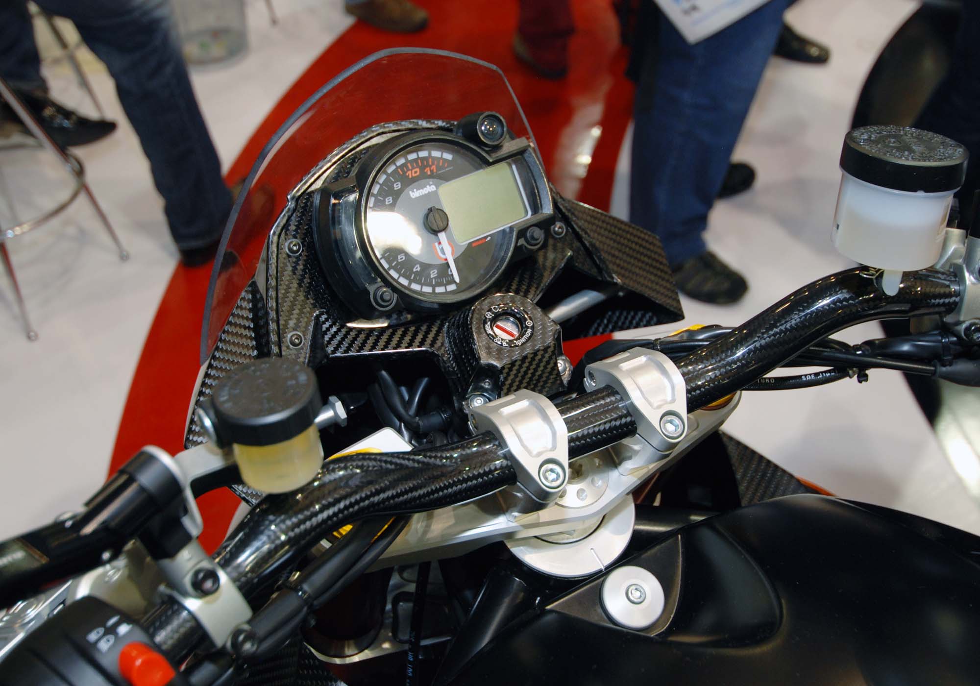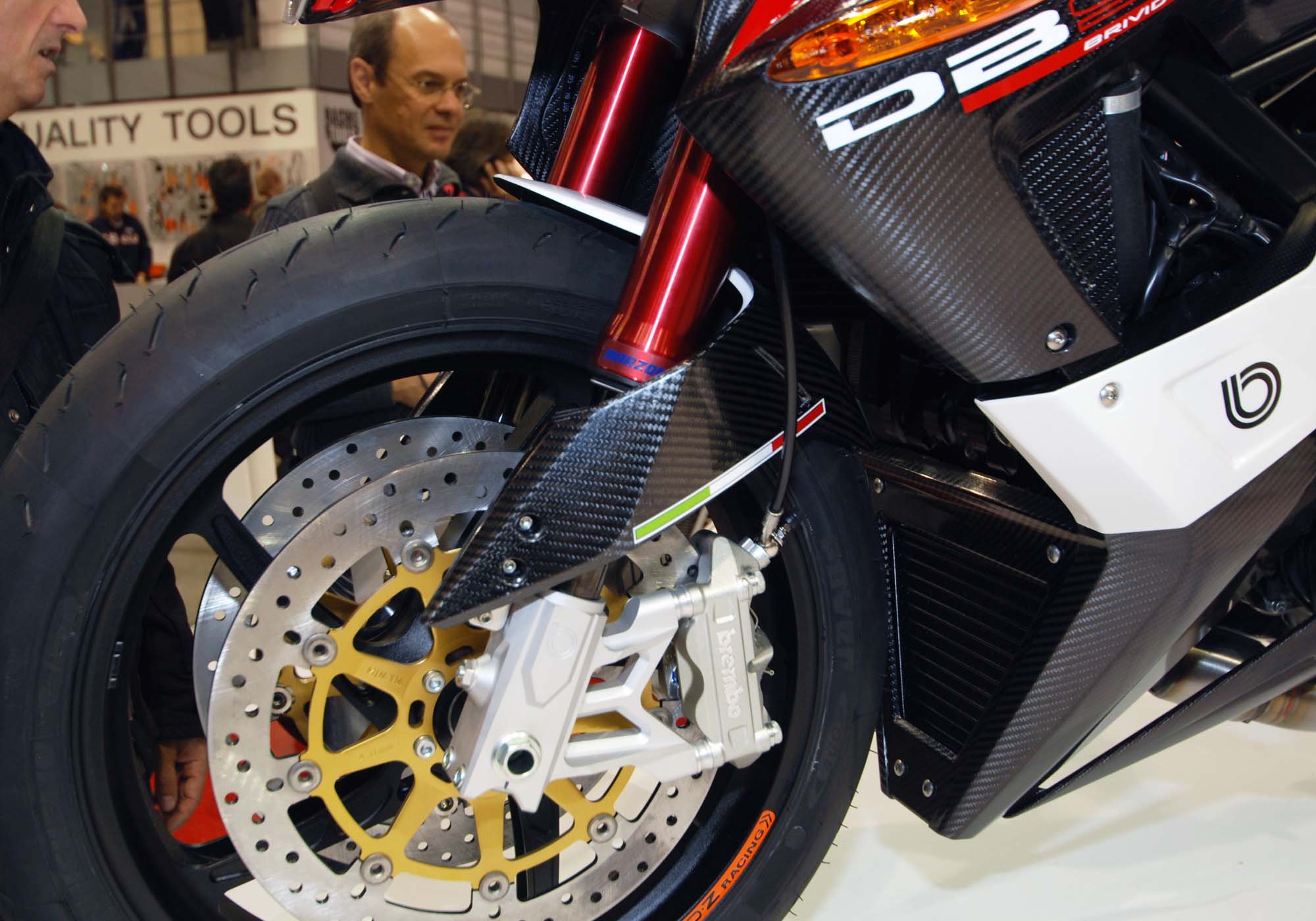 On display in Milan were two Brividos, the base model and one kitted in unpainted carbon fiber. Complete with a single perimeter braking disc, the tricked out Bimota DB9 Brivido will surely turn some heads at a bike night. Our pictures don’t really do either DB9 justice, as both bikes have an amazing fit and finish, and the carbon-clad Brivido is sinister with its high-tech murdered look. Our only real complaint is the general direction Bimota has been going with its fairing design stretching all the way back to the DB5. While the DB9 is still a looker, we’re craving something that sets the Ducati-powered model apart from each other.