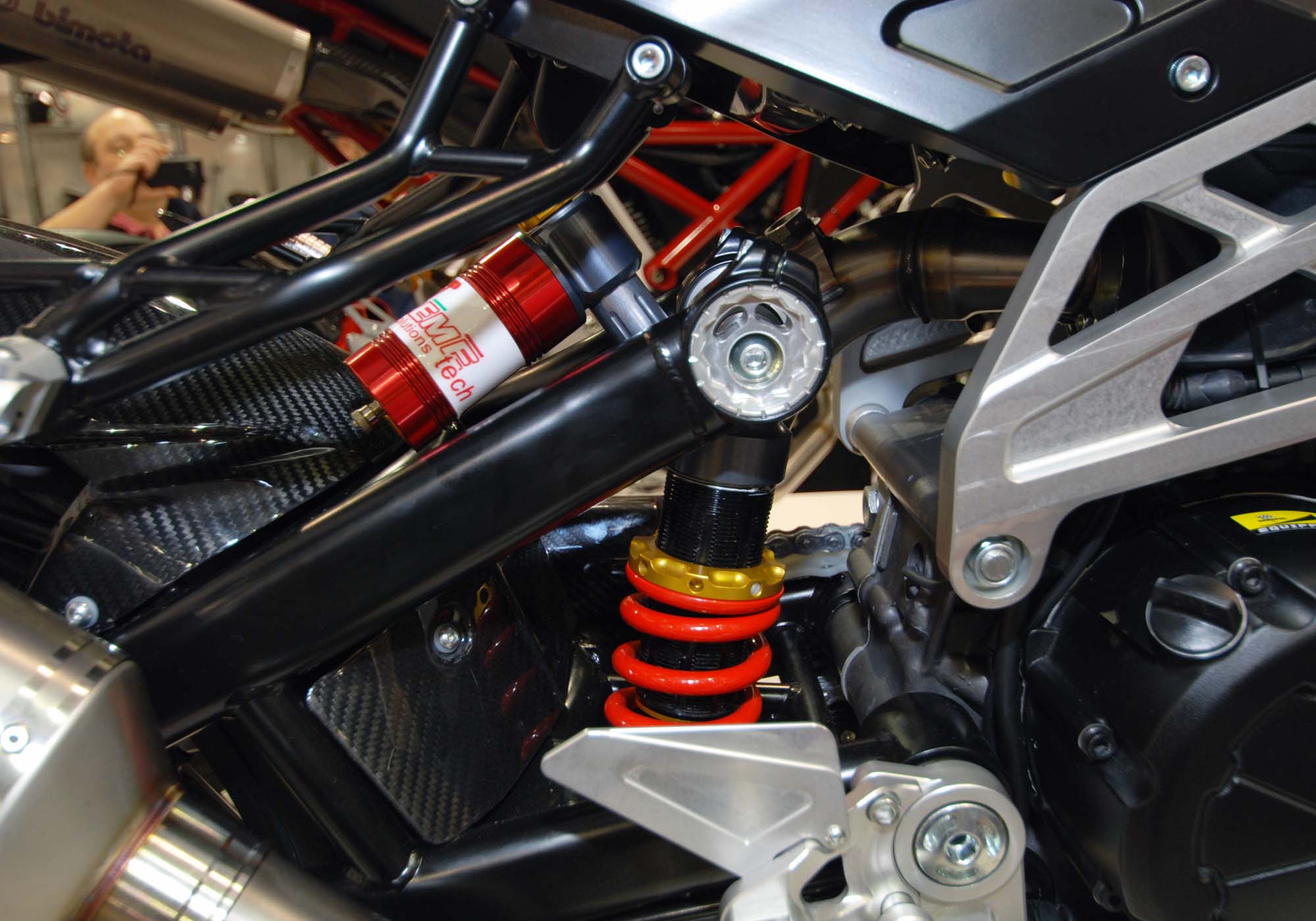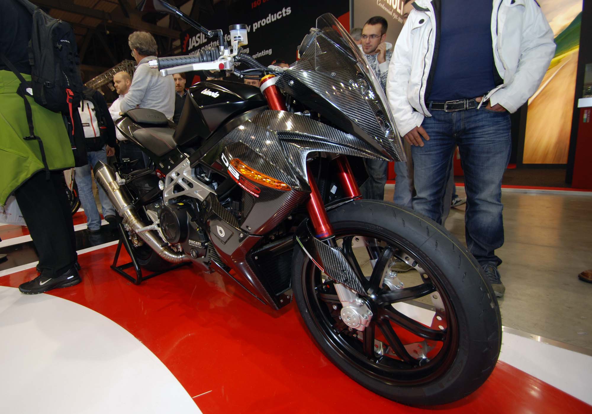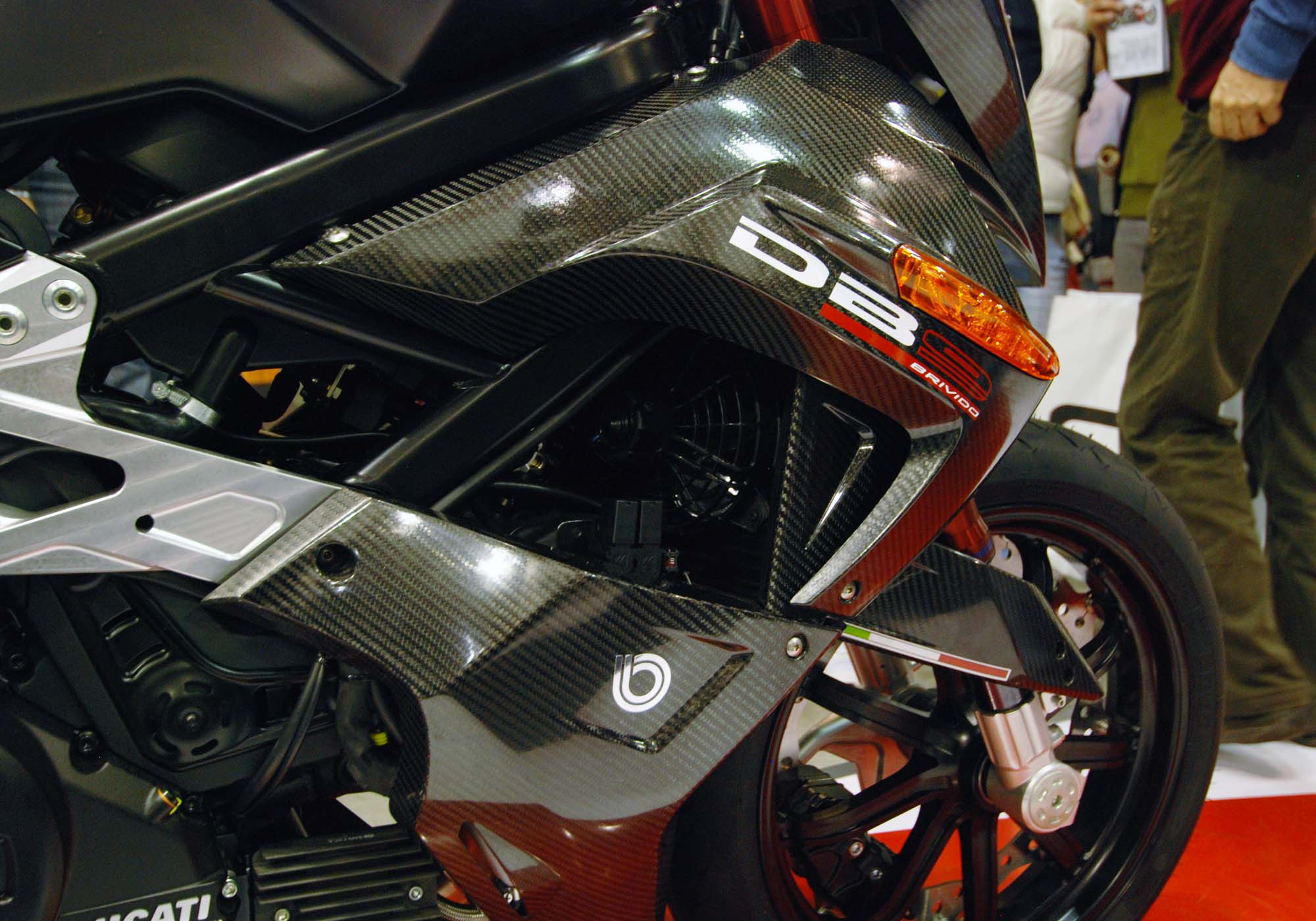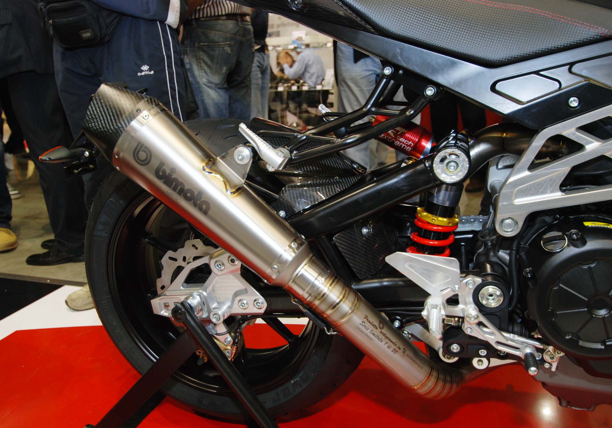 On display in Milan were two Brividos, the base model and one kitted in unpainted carbon fiber. Complete with a single perimeter braking disc, the tricked out Bimota DB9 Brivido will surely turn some heads at a bike night. Our pictures don’t really do either DB9 justice, as both bikes have an amazing fit and finish, and the carbon-clad Brivido is sinister with its high-tech murdered look. Our only real complaint is the general direction Bimota has been going with its fairing design stretching all the way back to the DB5. While the DB9 is still a looker, we’re craving something that sets the Ducati-powered model apart from each other.