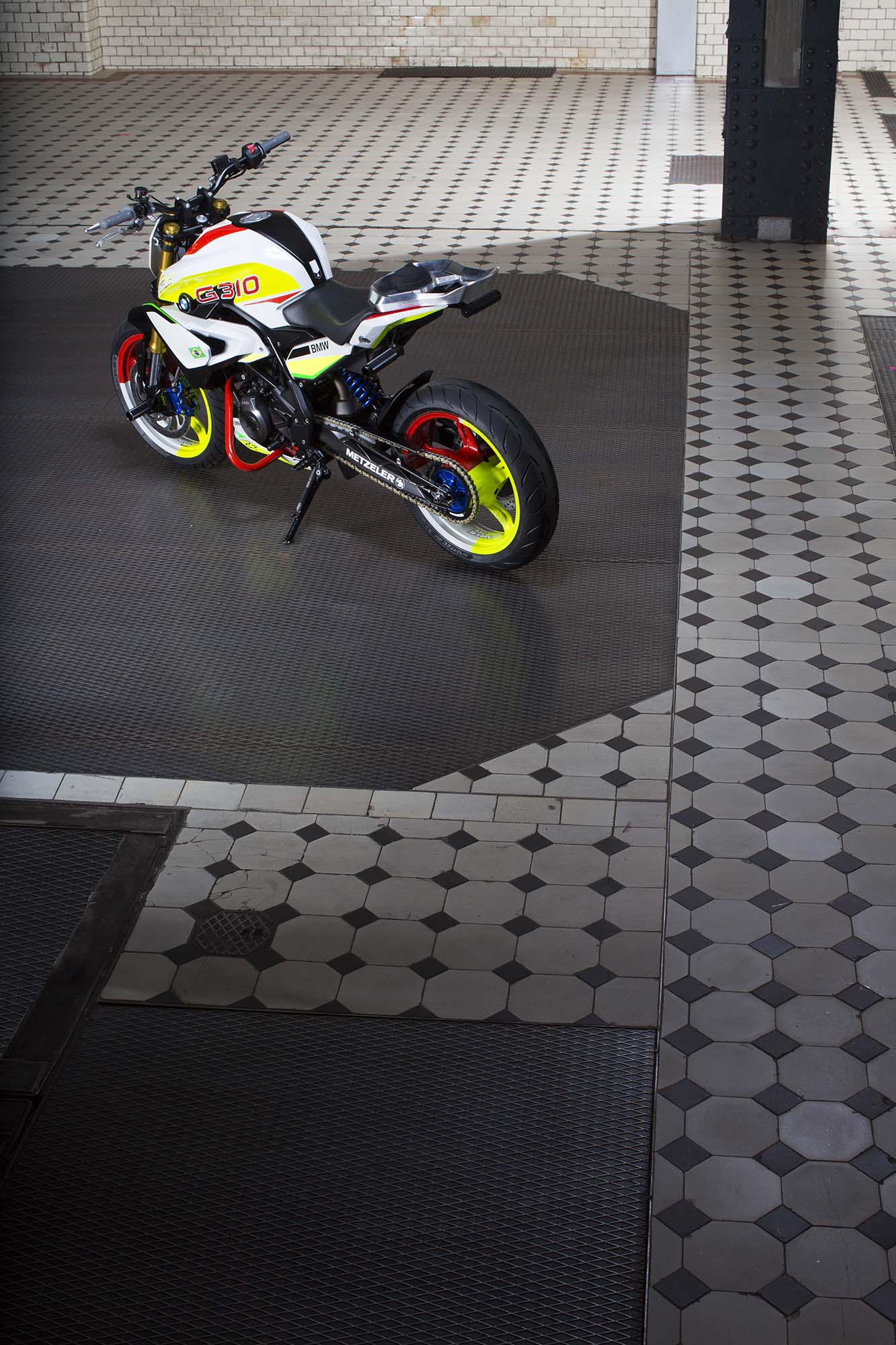 At the core of the Stunt G 310 concept is a single-cylinder engine, likely punched out to 310cc in capacity, given the name. Making things interesting, the cylinder head has been reclined back towards the rider, and rotated 180 degrees in order to create a super-short wheelbase, with an extra-long swingarm, for the concept.