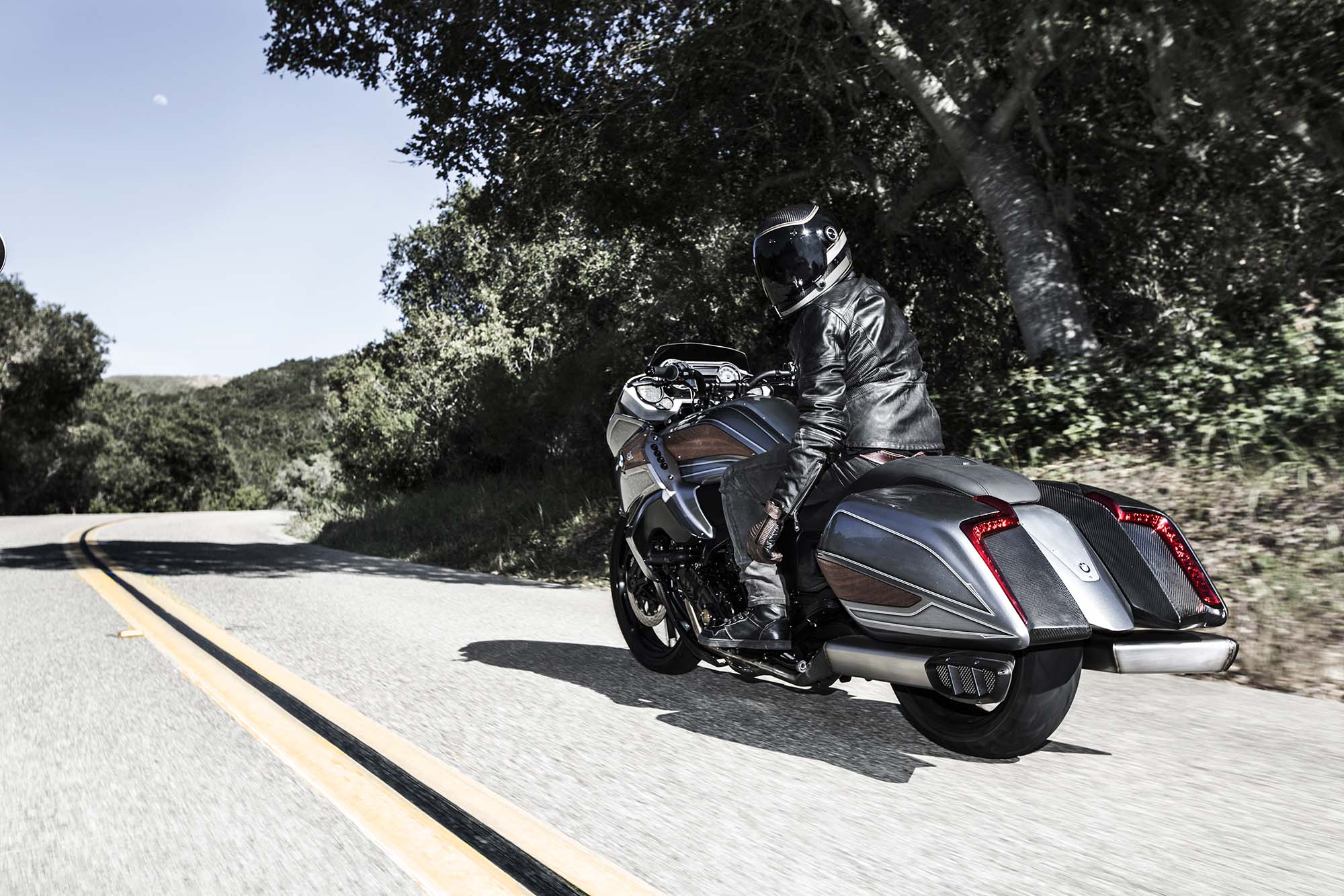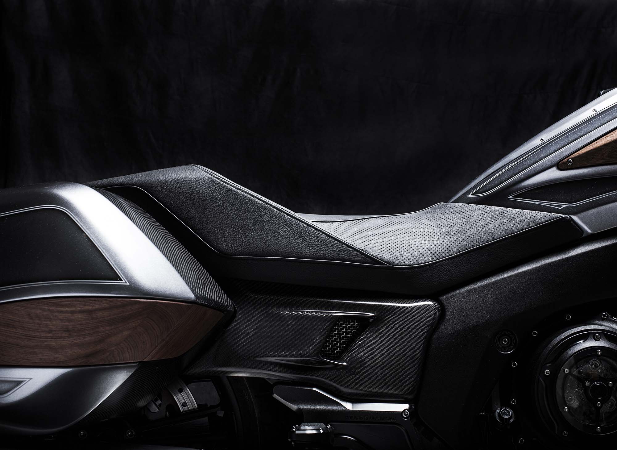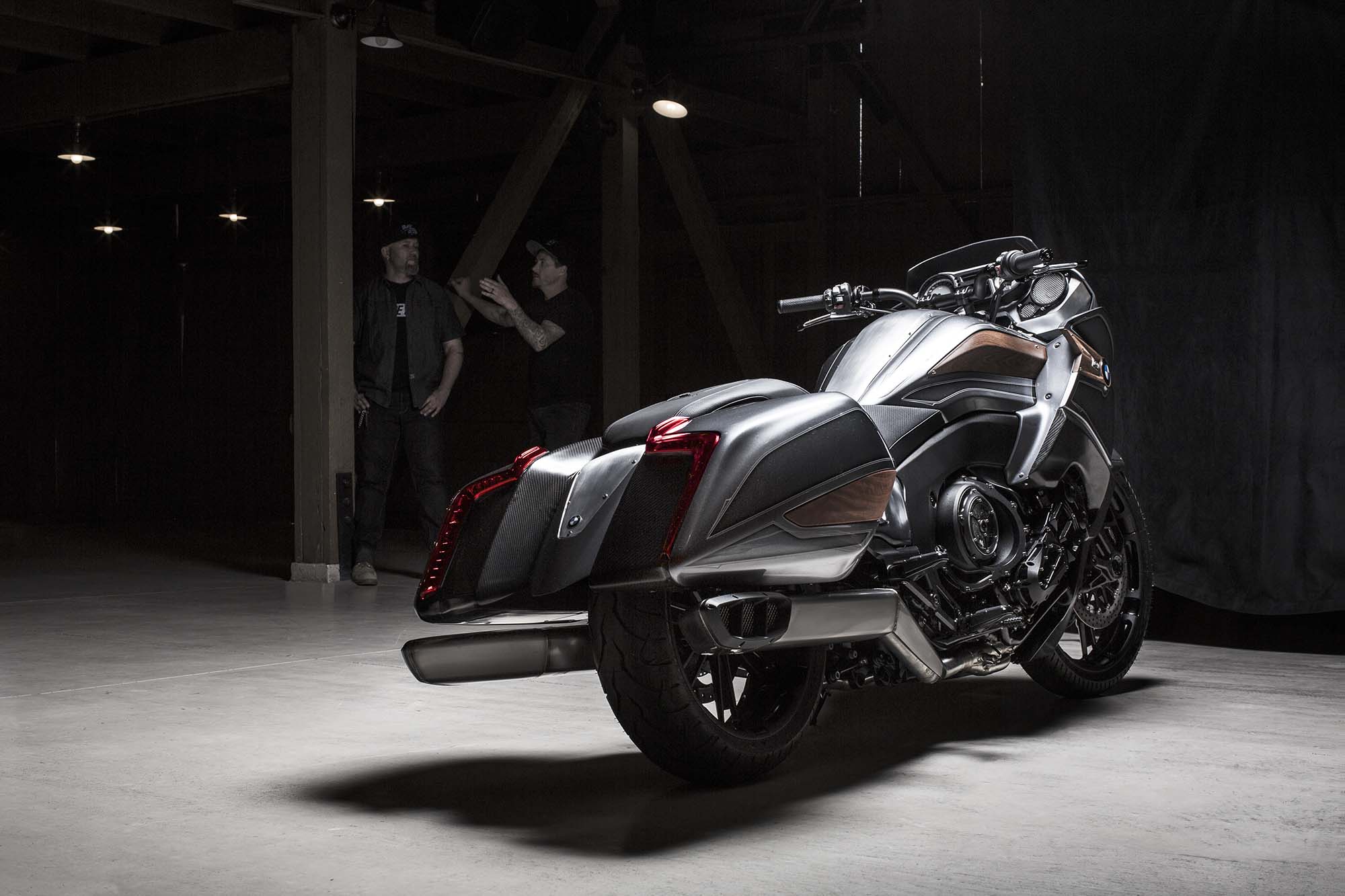 Perhaps the most striking features of the Concept 101 are the wood trim panels the sides of the front fairing, fuel tank, and bags. The dual three-tip exhaust, which sweeps all the way to the rear of the motorcycle, is also visually very gripping.