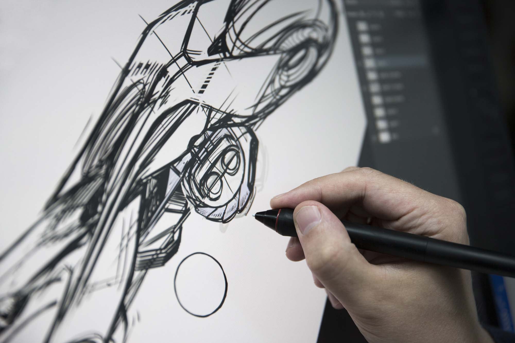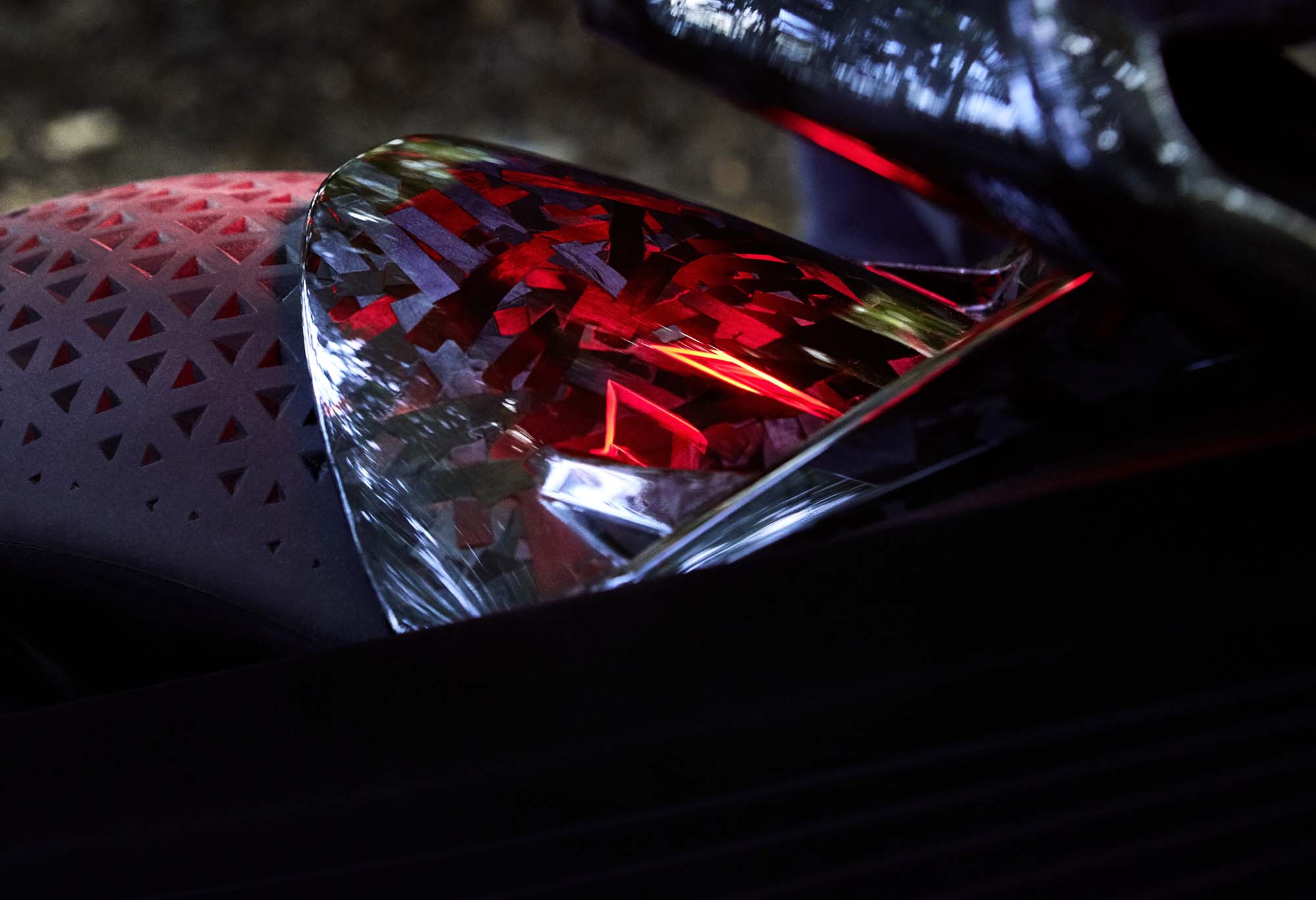 In lieu of a helmet, a rider wears a visor that has an integrated heads-up display (HUD). This provides the bulk of the bike’s informational systems, and allows access to the digital companion.