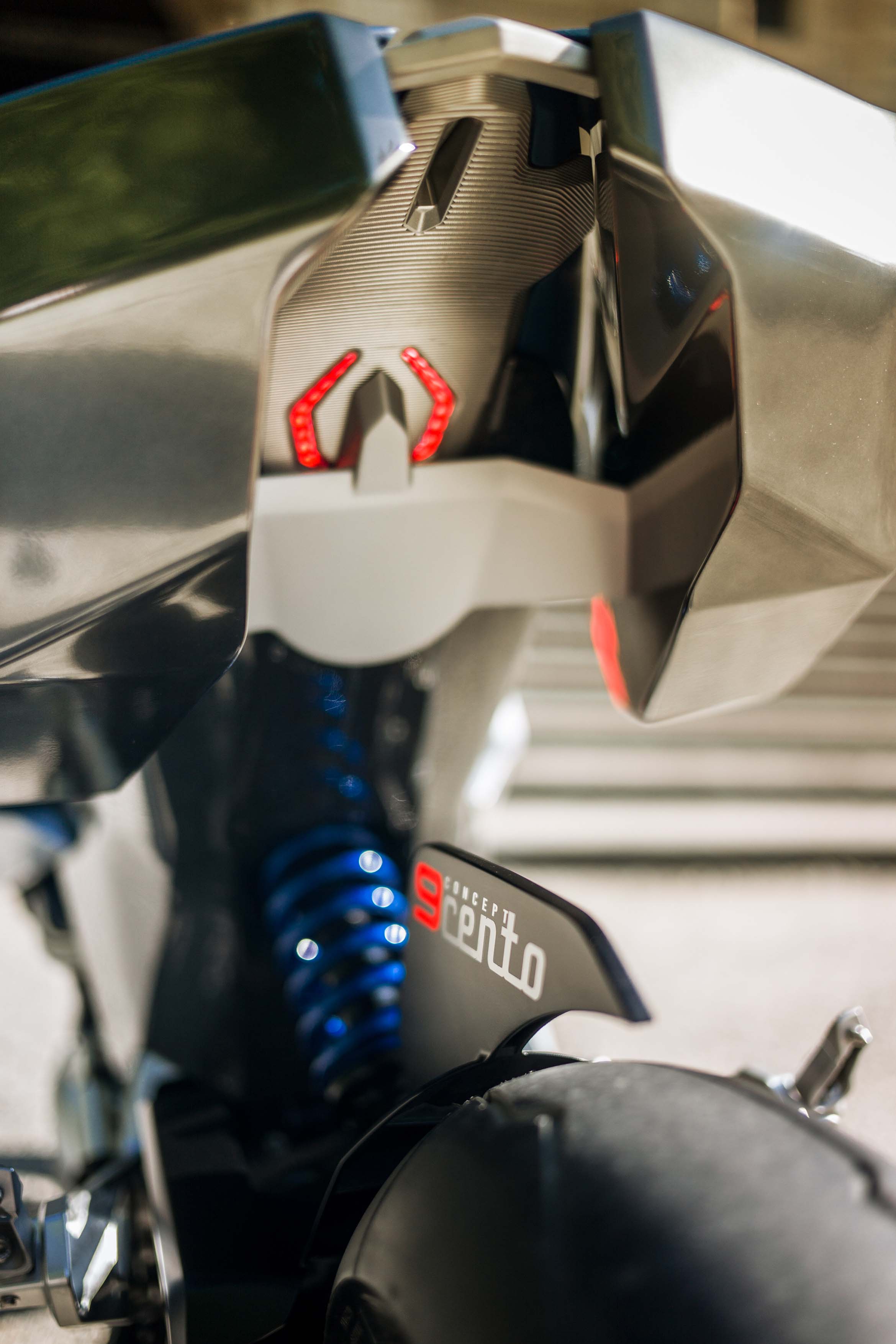 How much of the BMW 9Cento design makes it into production is of course the big question. One of the big features on the 9Cento is the luggage/seat arrangement, which uses the panniers (which attaches by using electromagnets) as a way to increase the passenger seat size.