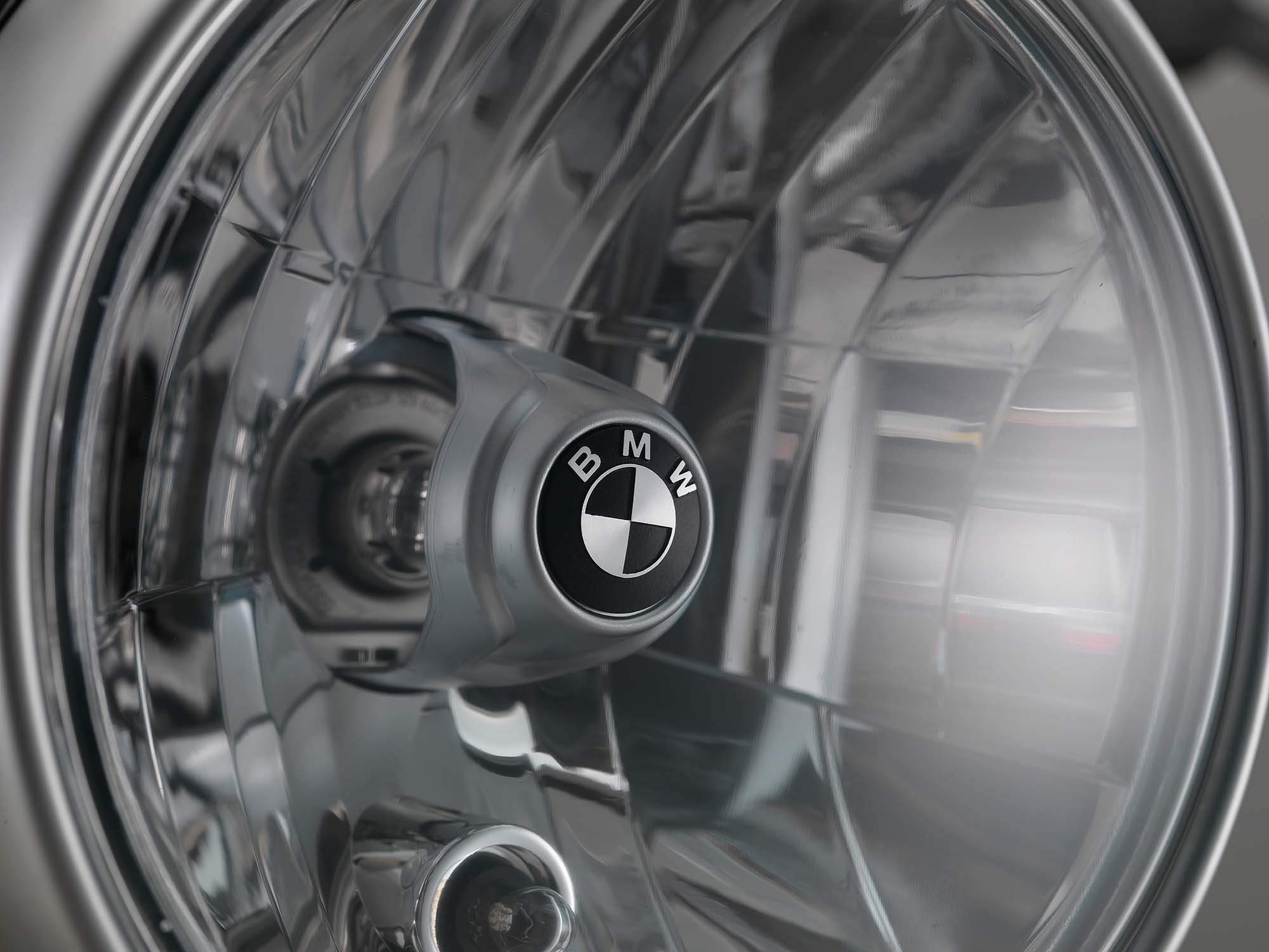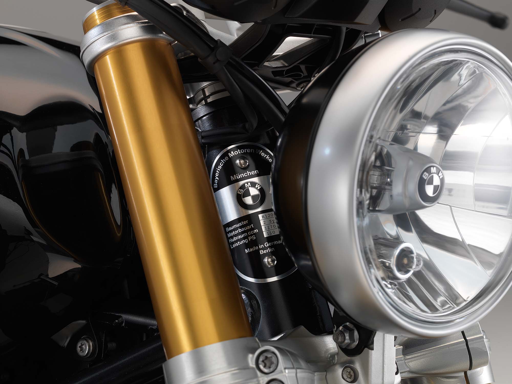 - Model plate riveted onto steering head in classic BMW Motorrad style.