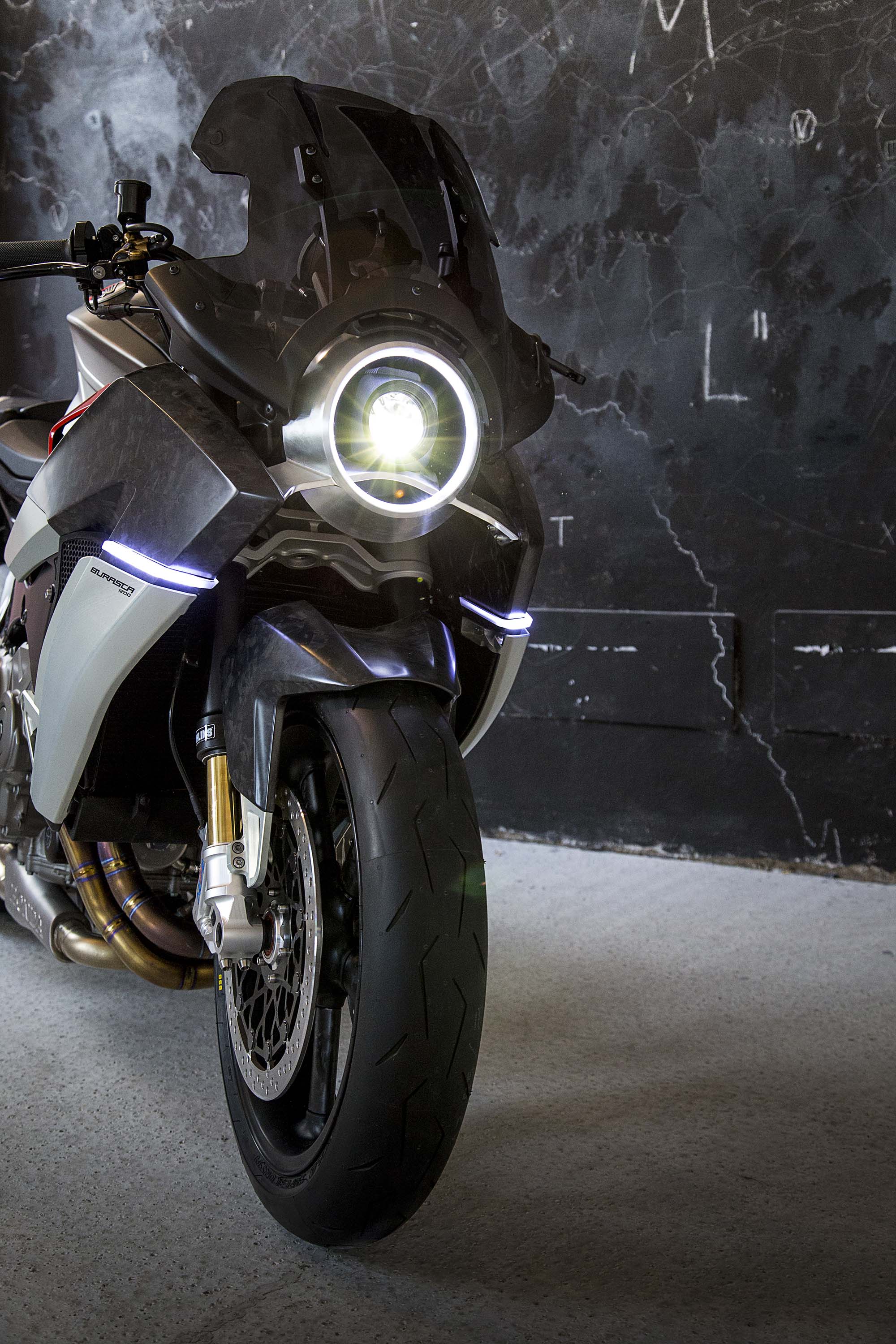 The chassis handles its 590-pound mass well, and the 1,27cc V4 engine has plenty of grunt , and this is what must have been what attracted Aldo Drudi to the machine for his first motorcycle concept.