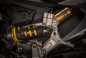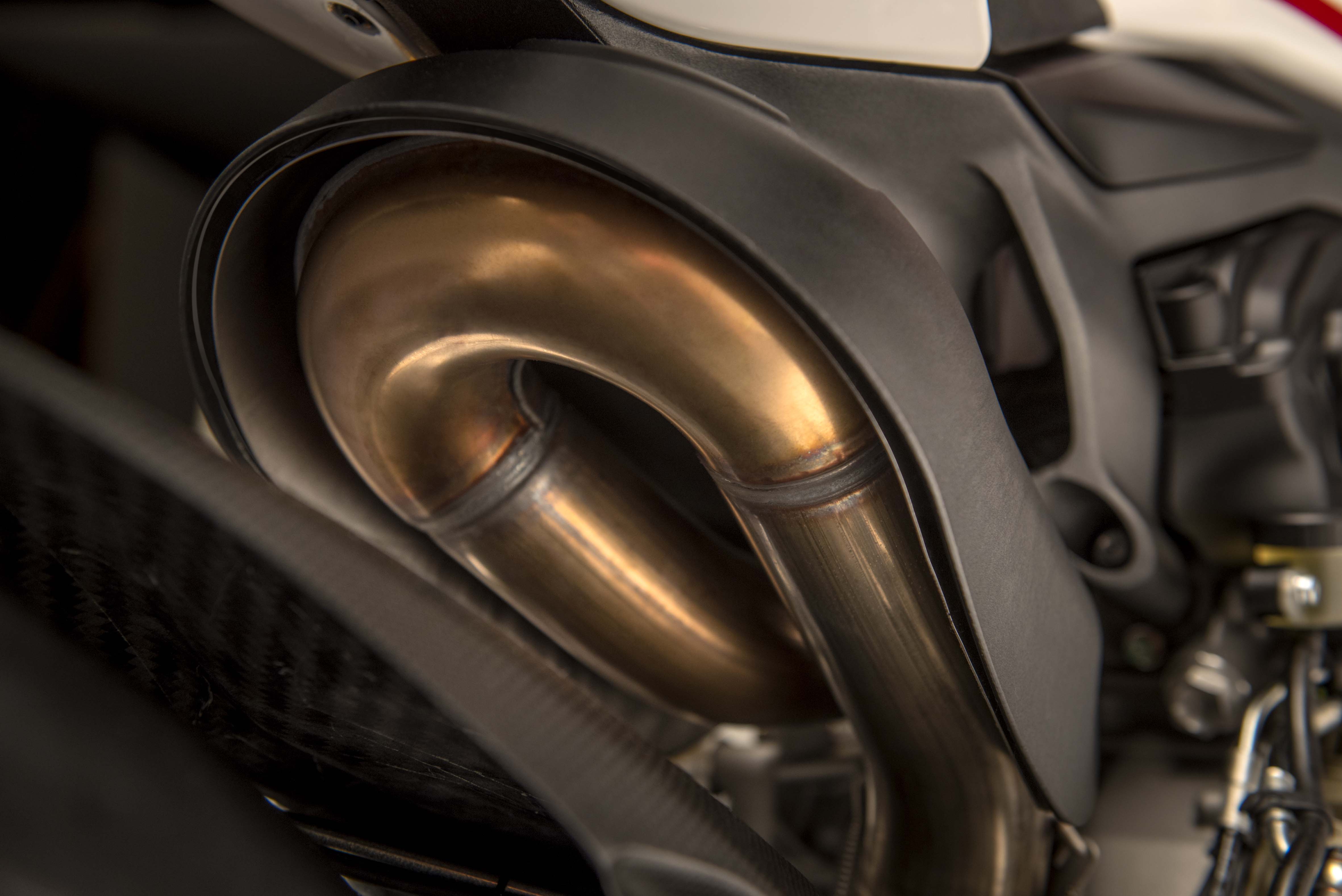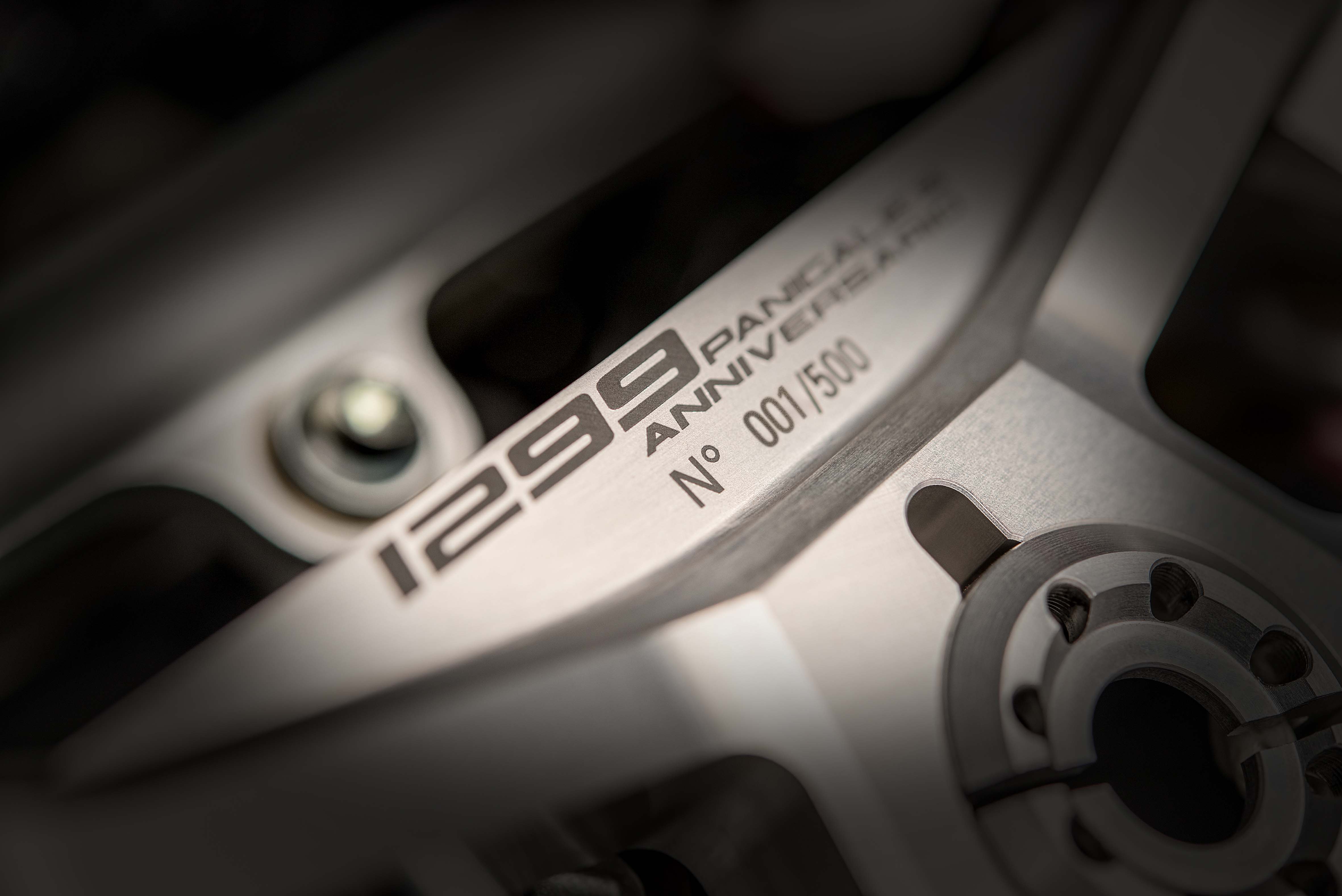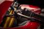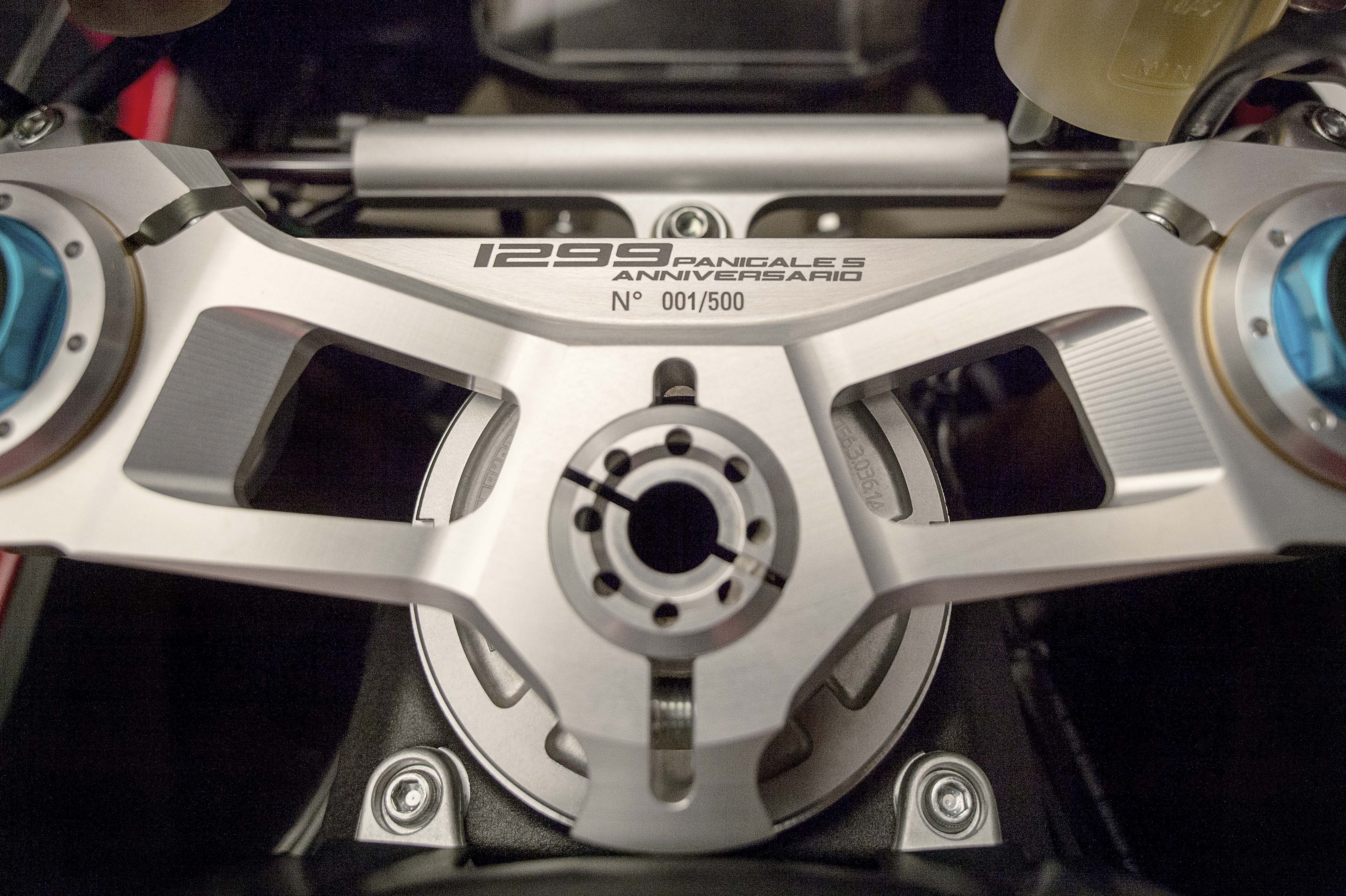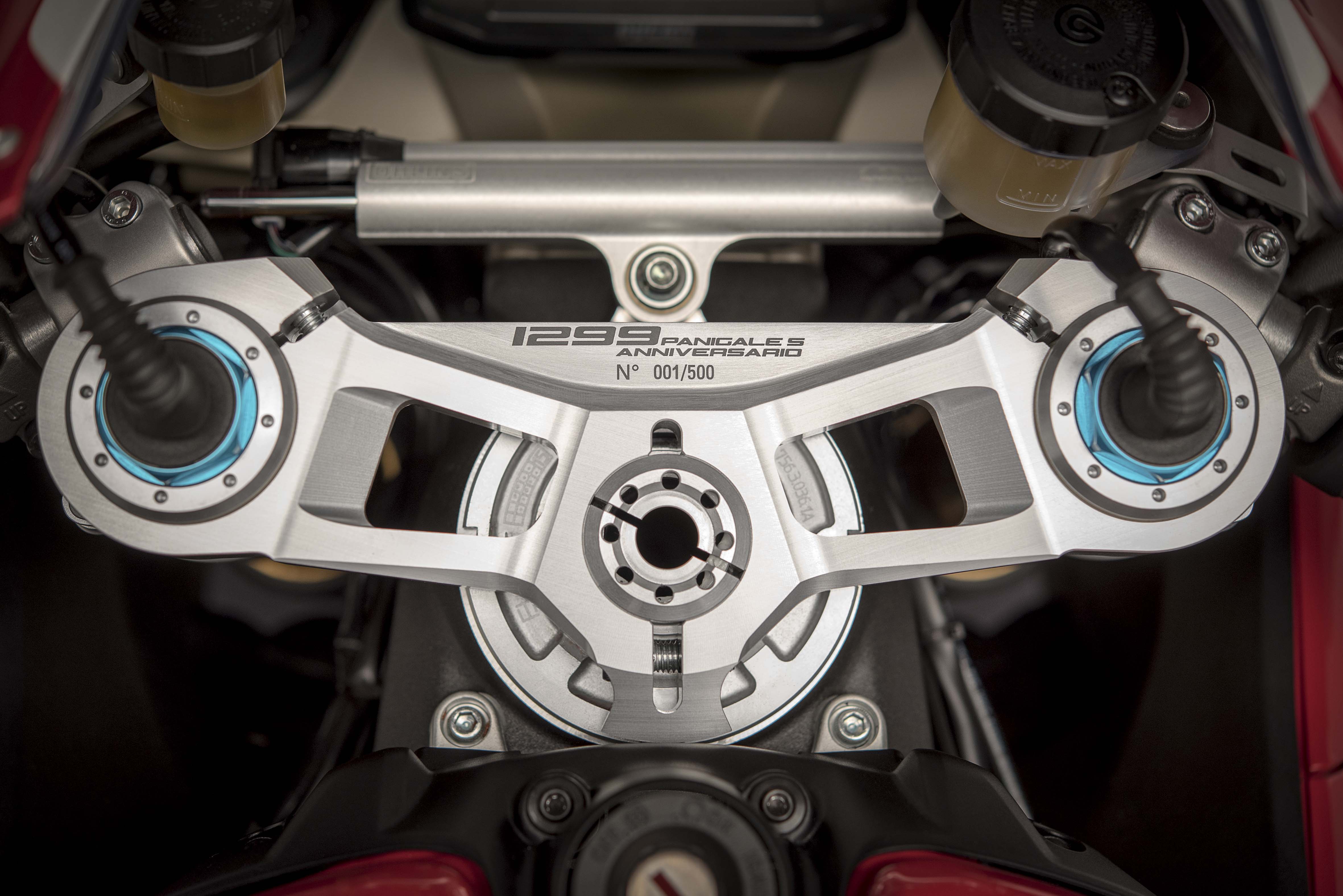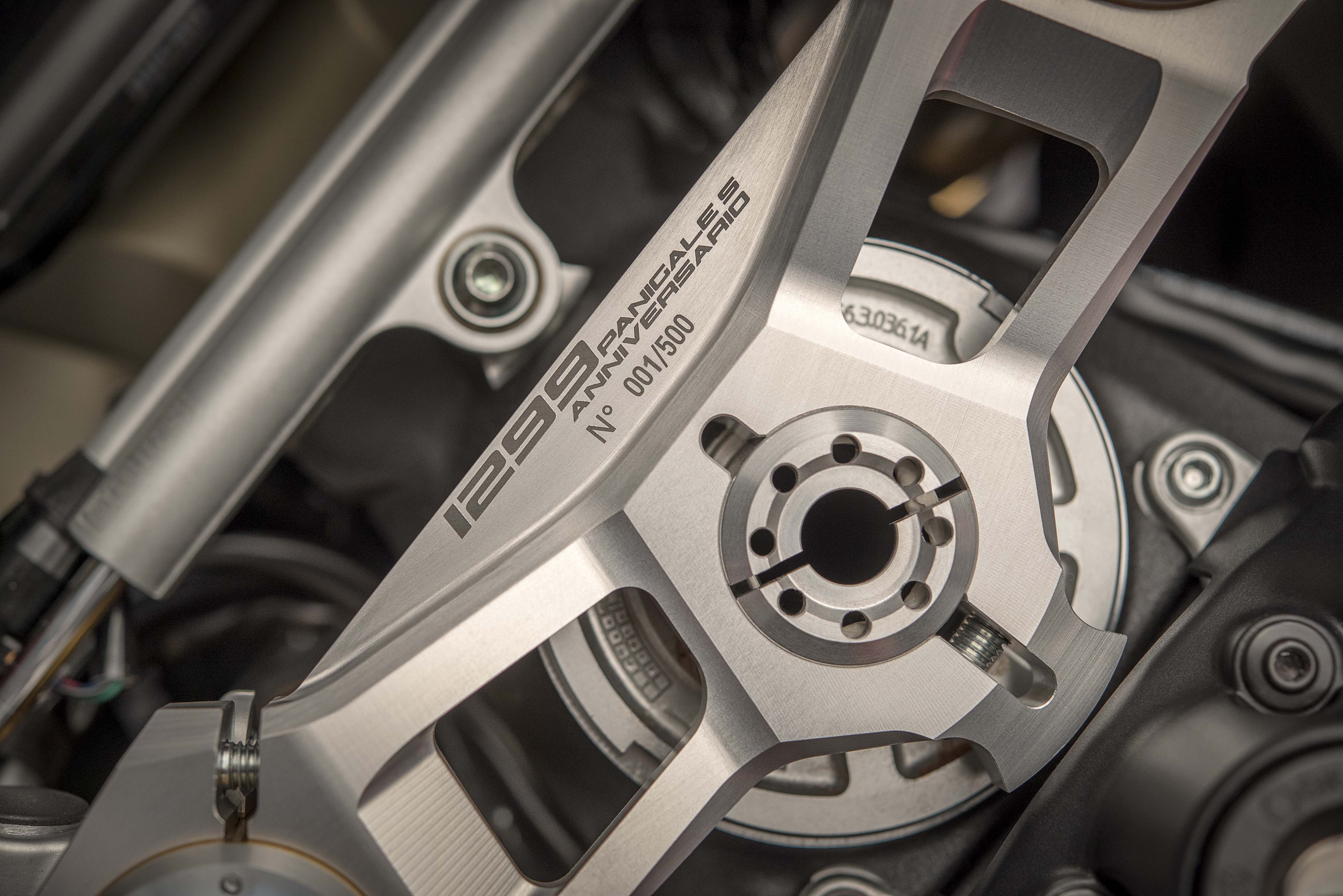 Other technical features include a top triple clamp and steering head inserts, both of which are machined-from-solid aluminium alloy. These inserts can shift the front wheel forward by 5mm, thus giving the Panigale S Anniversario the same geometry as the Panigale R.
