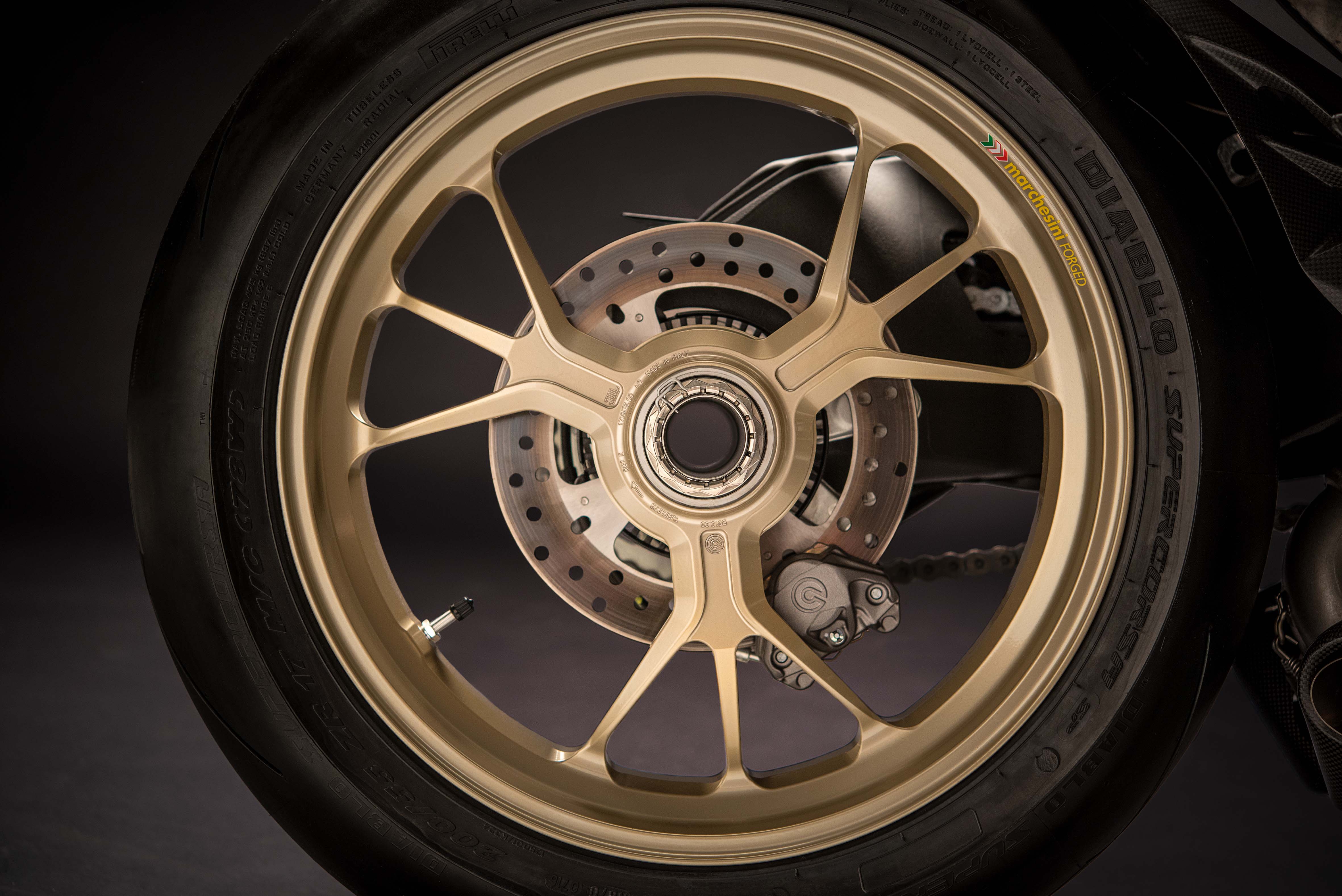 Aside from the special livery, Ducati 1299 Panigale S Anniversario owners will appreciate the gold-colored forged aluminum Marchesini wheels, gold-colored titanium Akrapovic exhaust, and limited edition laser-etched engraving.