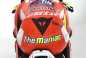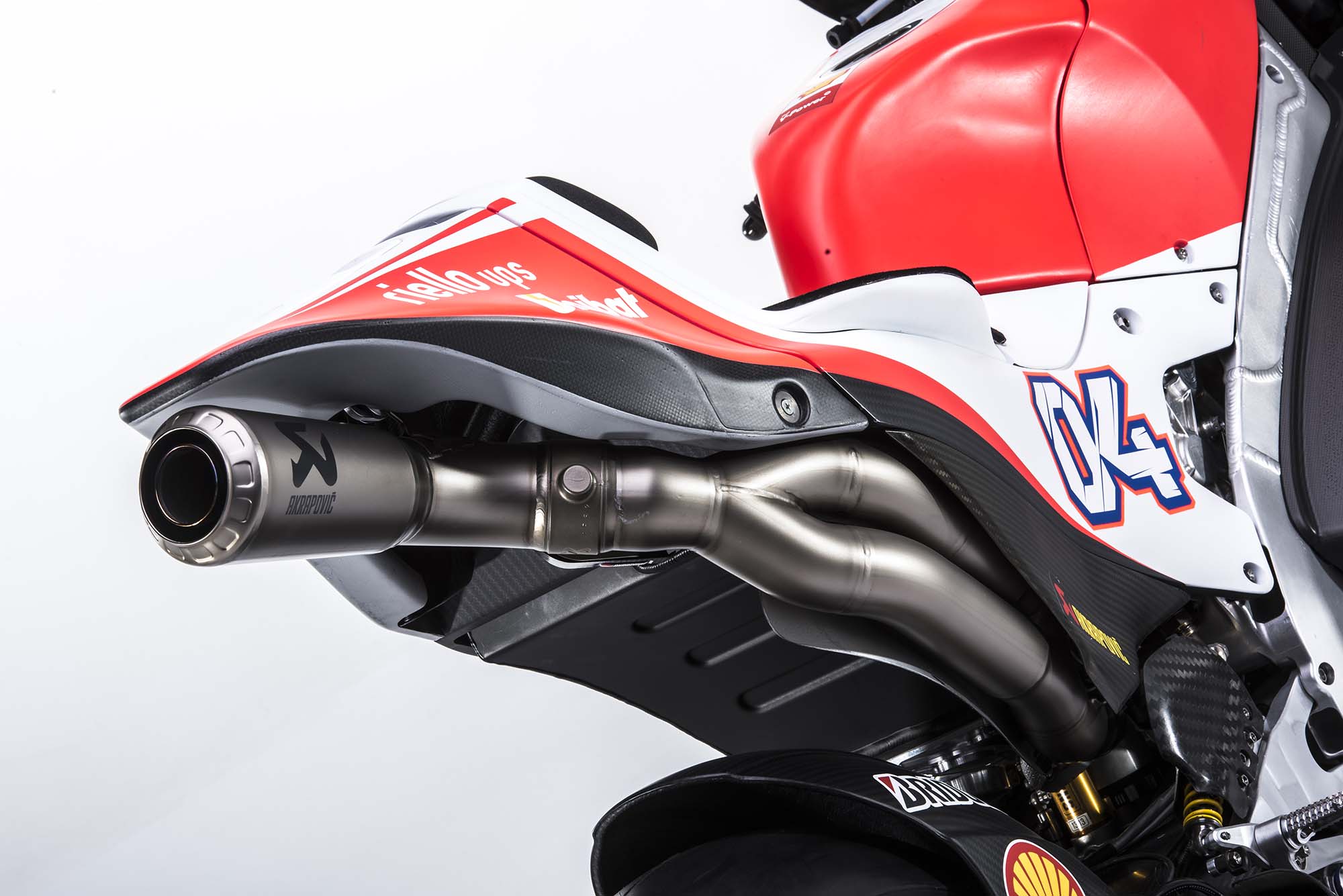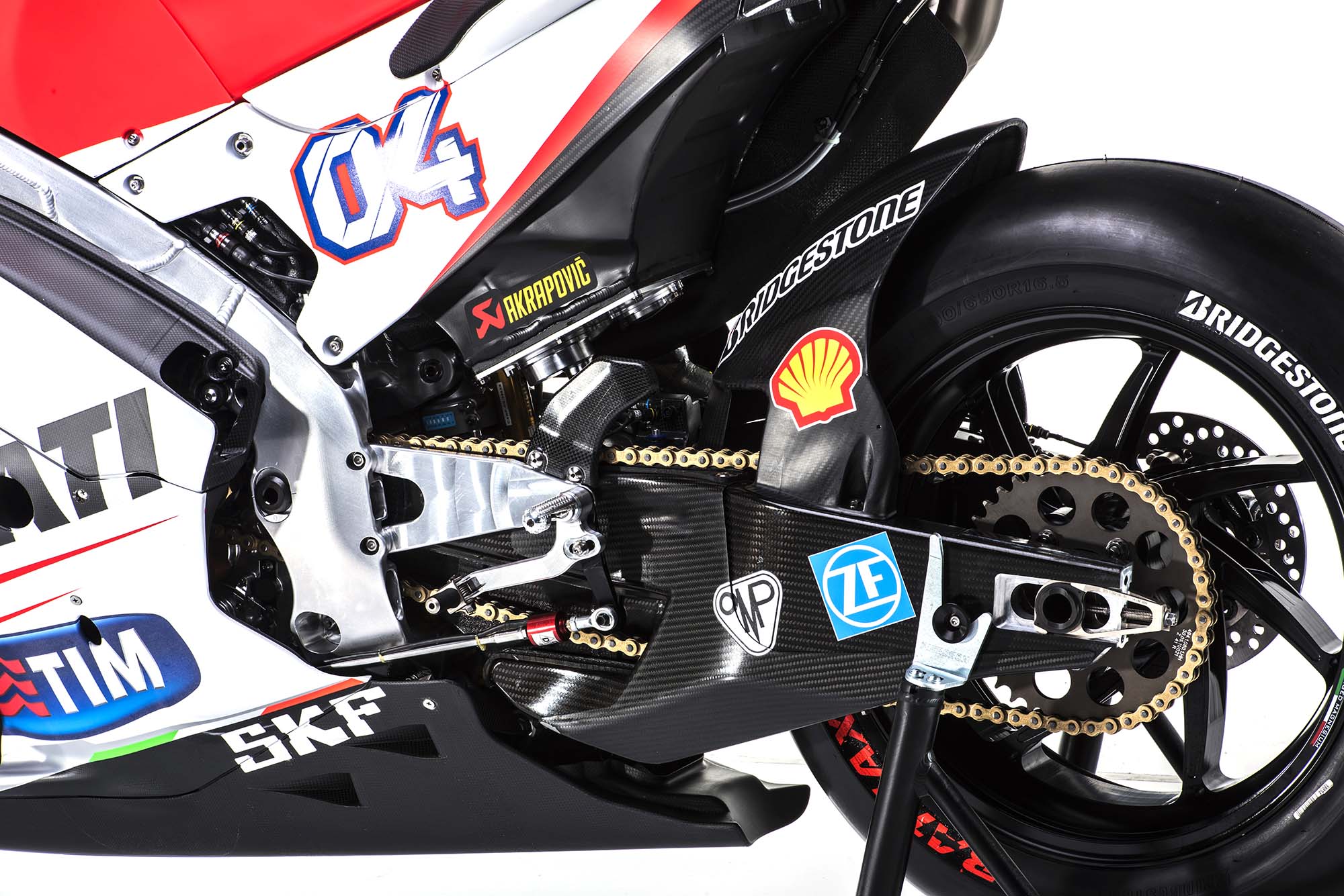 The bodywork is obviously different, and the Ducati Desmosedici GP15 is physically slimmer, with a much smaller tail section. The twin-spar aluminum chassis remains, though it is of a completely new design. Easy to see as well are the carbon fiber subframes fore and aft.