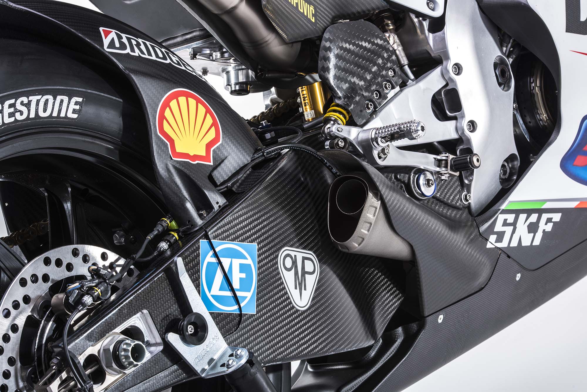 The most obvious change that can be seen on the GP15 is the re-routing of the exhaust, with the undertail pipes collecting on the right-hand side of the machine, rather than coming in from both sides and meeting in the middle.