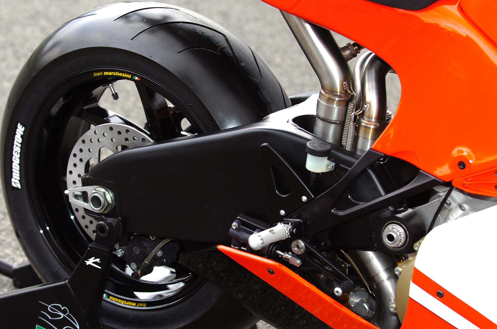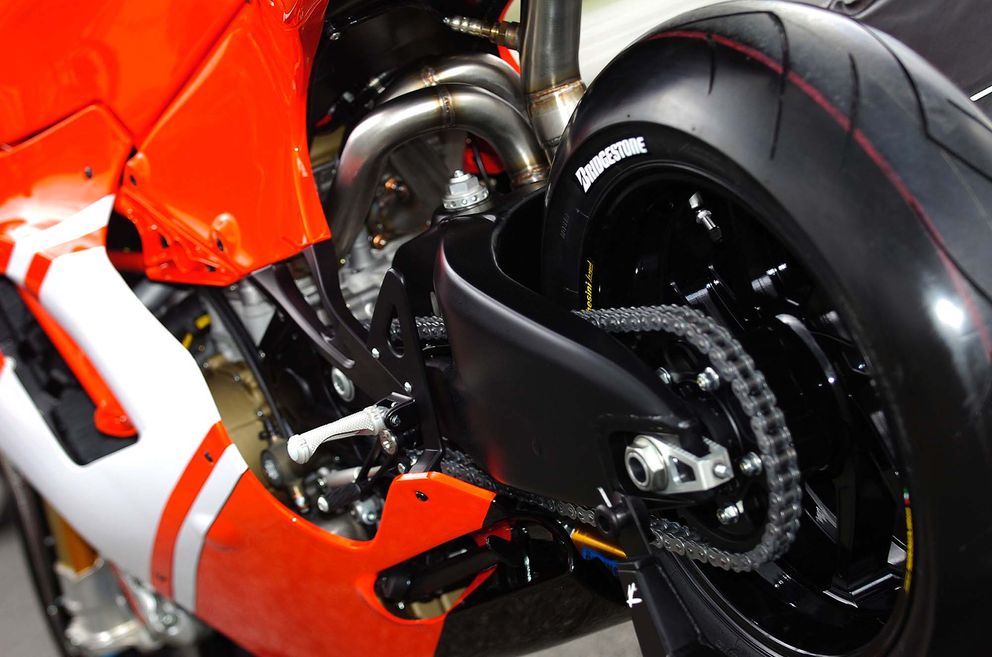 Looking at the photos after the jump, you can see a lot of the Panigale in the Desmosedici, which is of course due to the Ducati 1199 Panigale’s MotoGP-inspired “frameless” chassis design that uses the motor as the basis for the motorcycle’s structure.