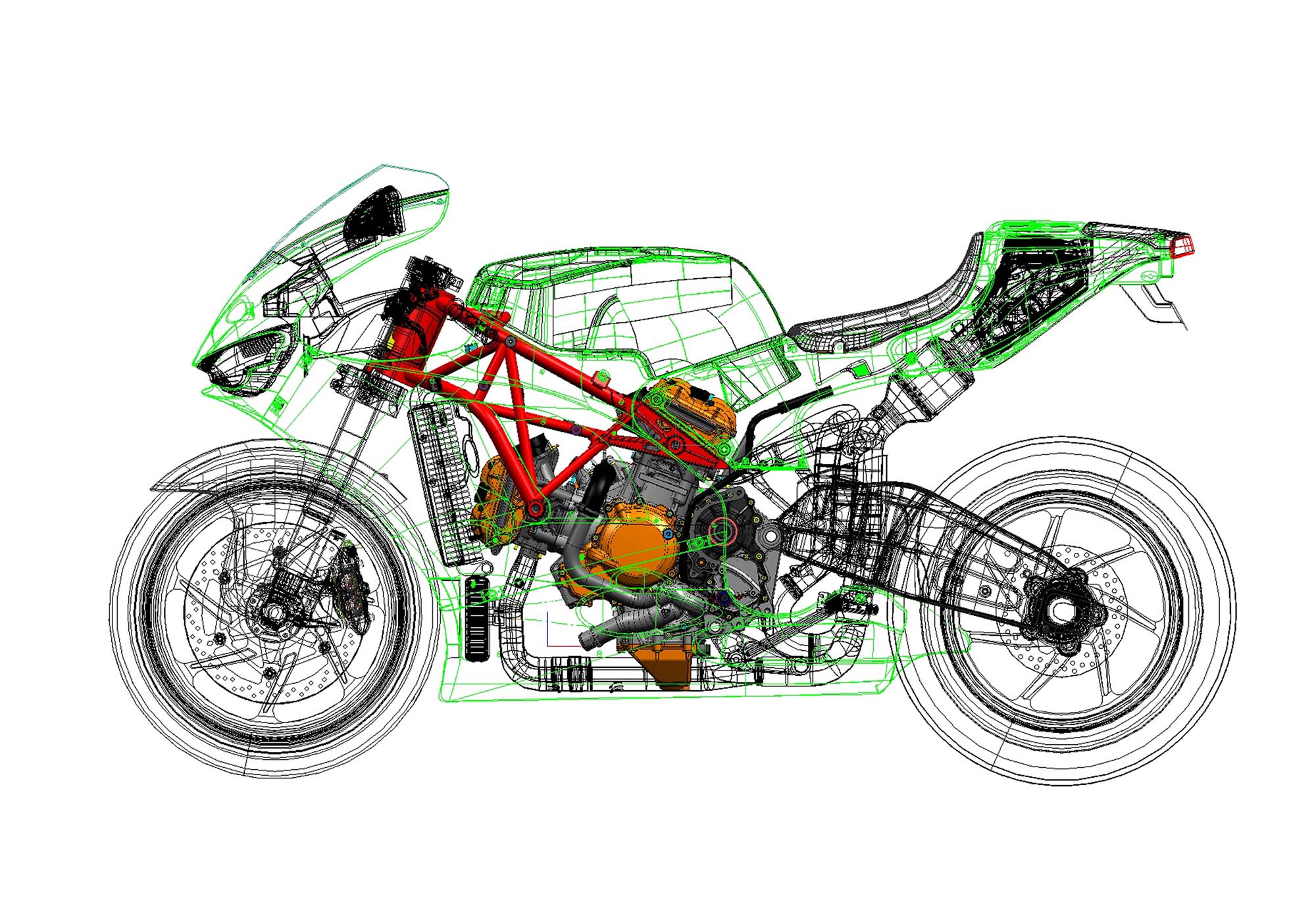 Building the headstock/airbox off the forward-facing cylinder head, and the tail/rear-subframe off the rearward cylinder head on the Panigale, we see the same design elements in the Ducati Desmosedici RR, except maybe one or two generations behind the current superbike (Ducati went from a steel trellis design, to a carbon design, to an aluminum design, and now rests on a aluminum perimeter-frame design).