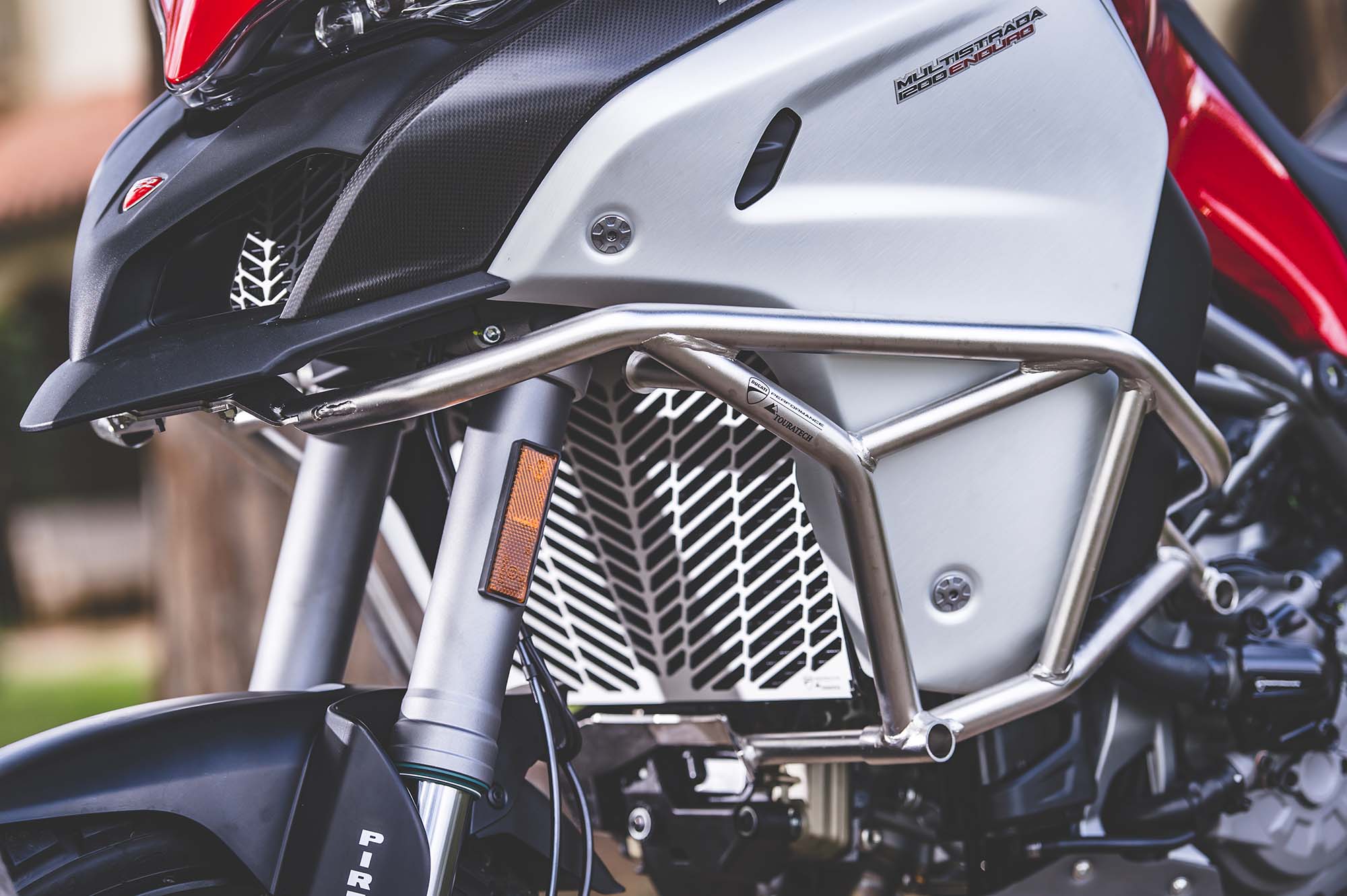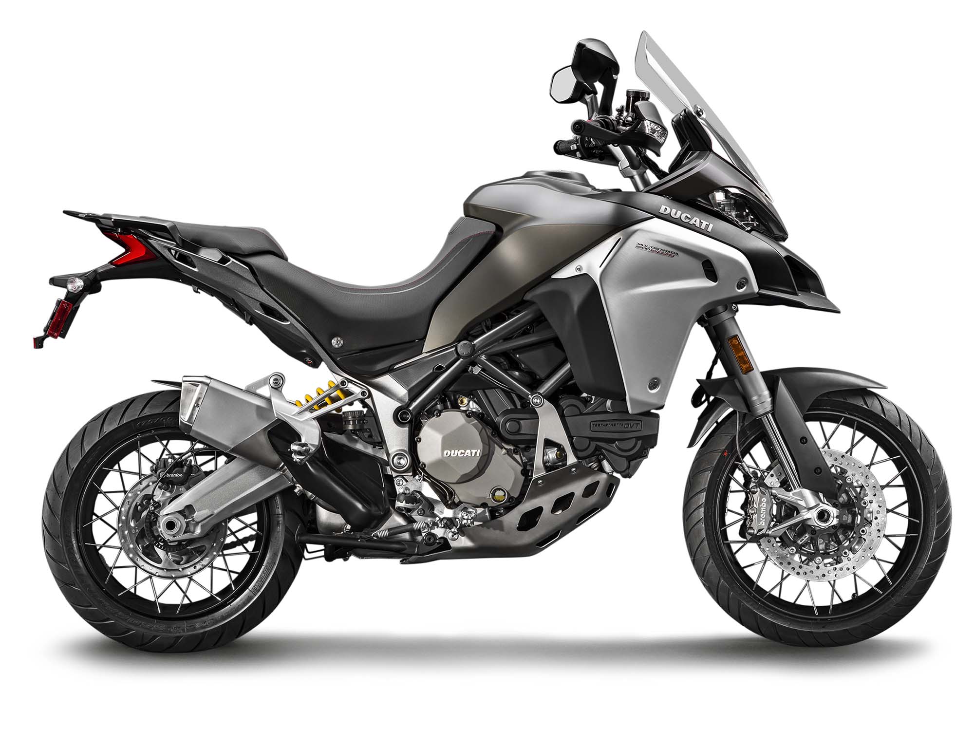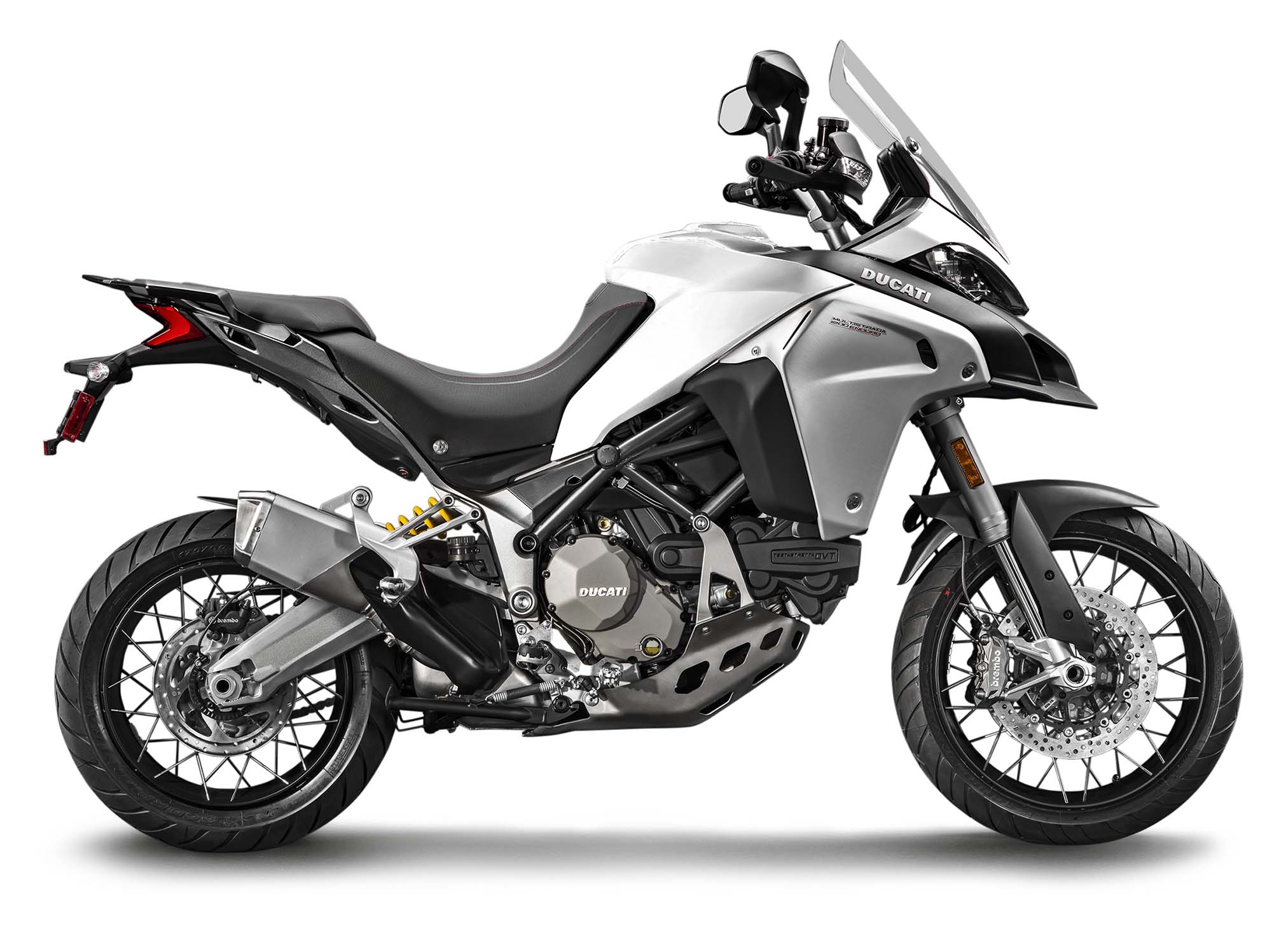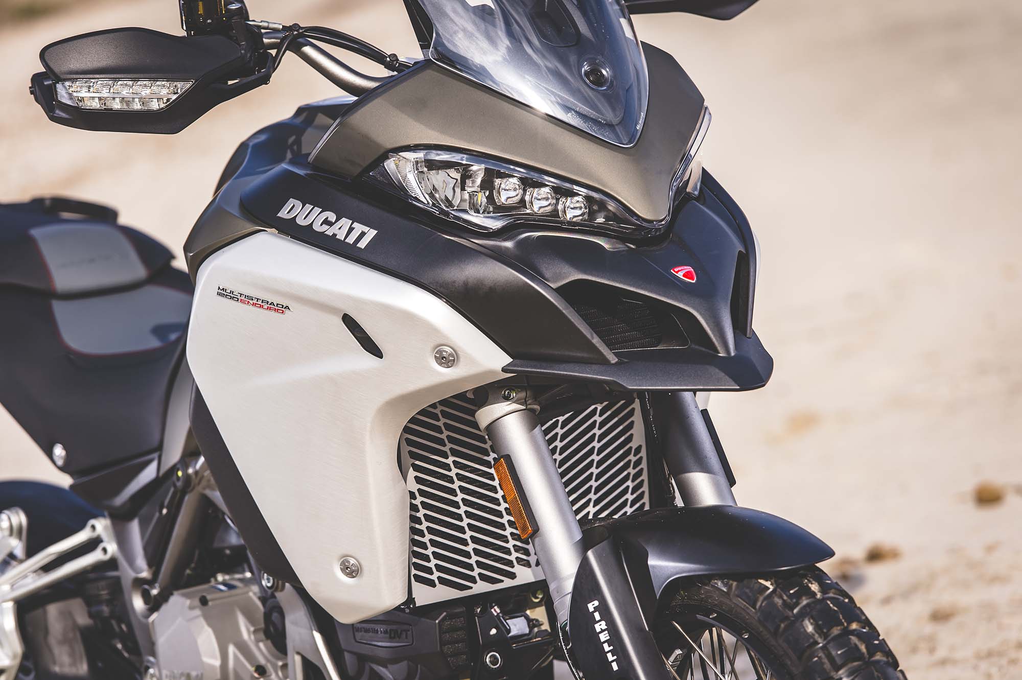 Ducati has made some obvious changes to its Multistrada 1200 platform to make the Enduro model ready for the dirt, the most noticeable of which are the spoked wheels (with a 19-incher up front) and the beefier double-sided swingarm. The optionally equipped Pirelli Scorpion Rally tires, slimmer exhaust can, and crash bars help complete the transformation, as well.