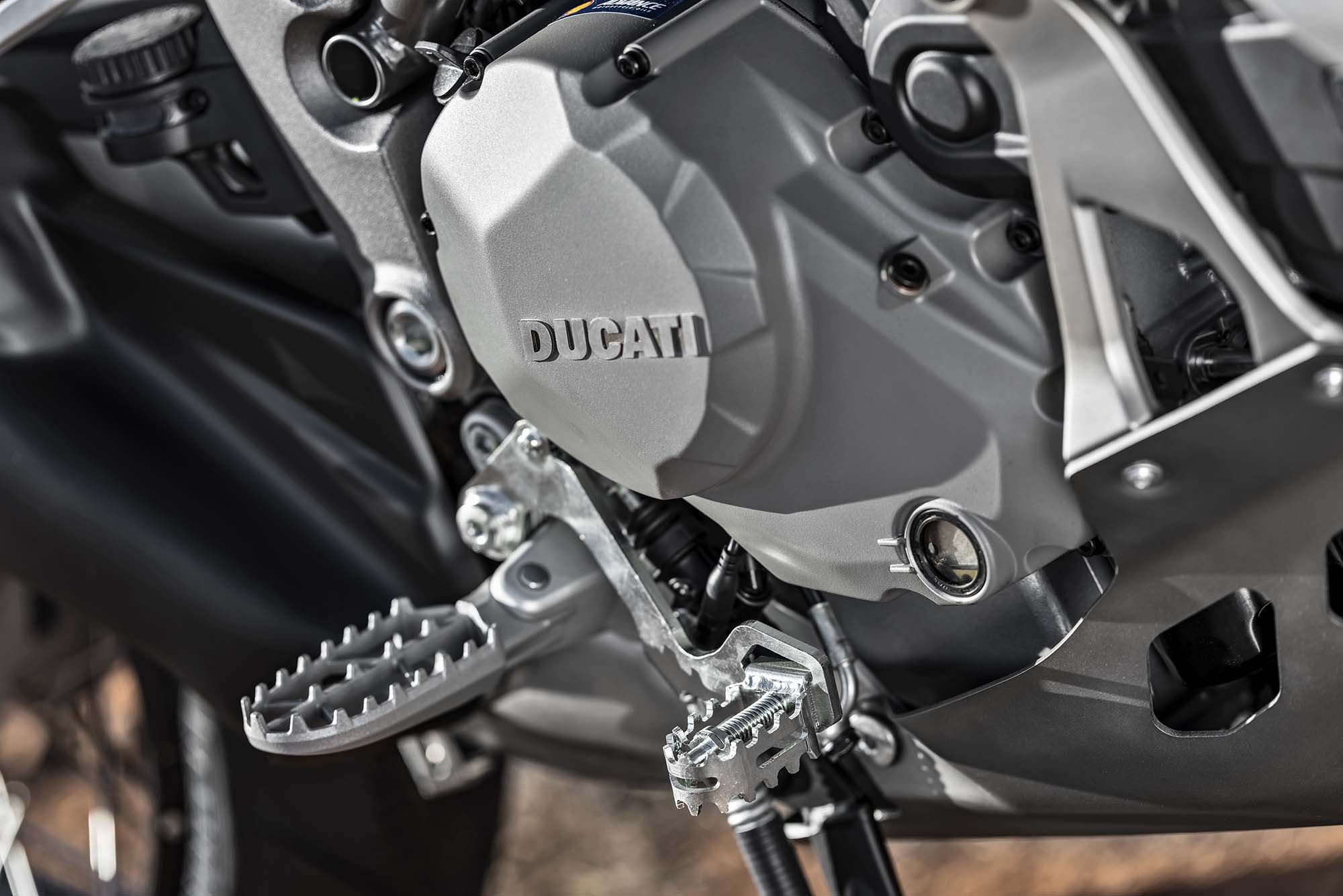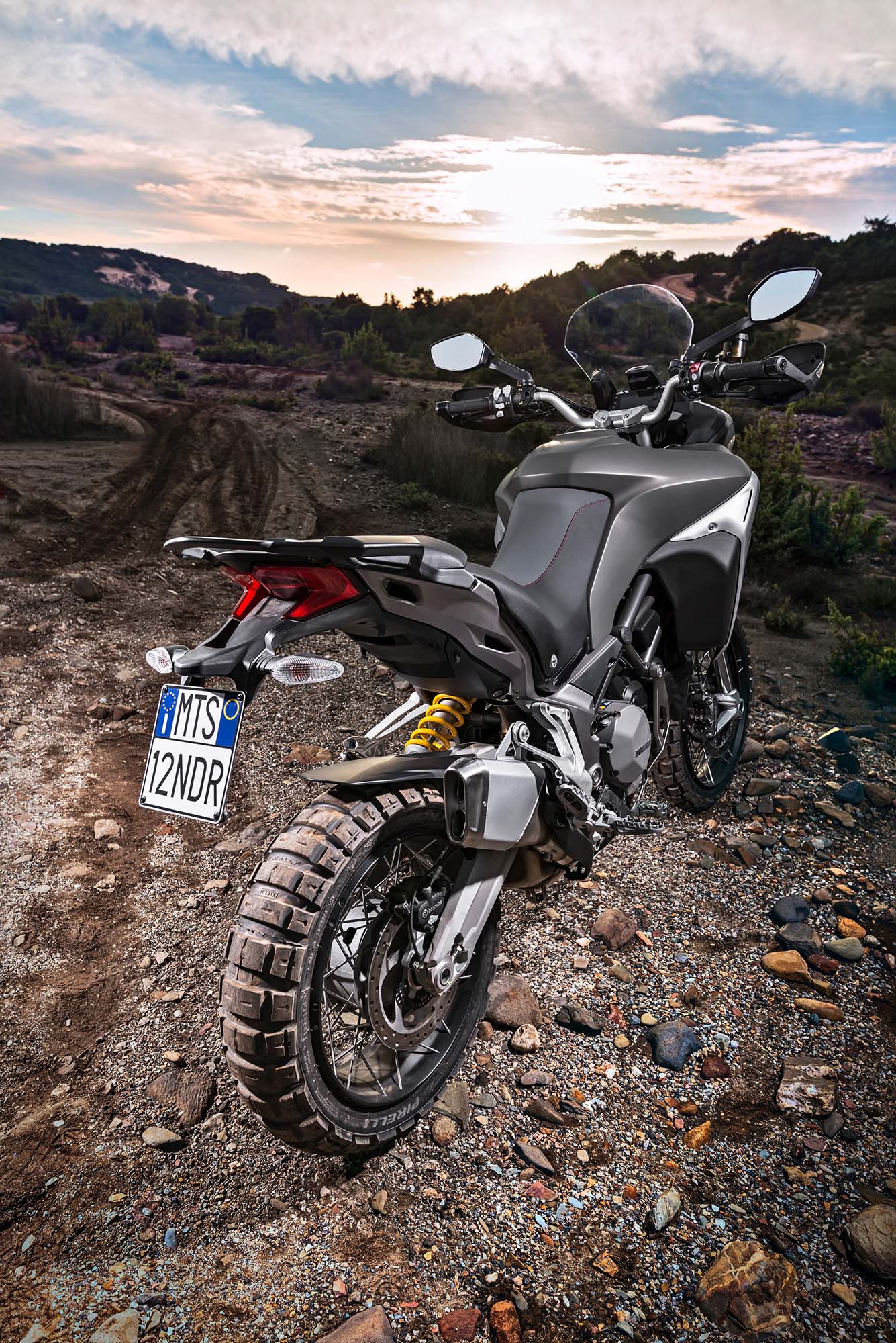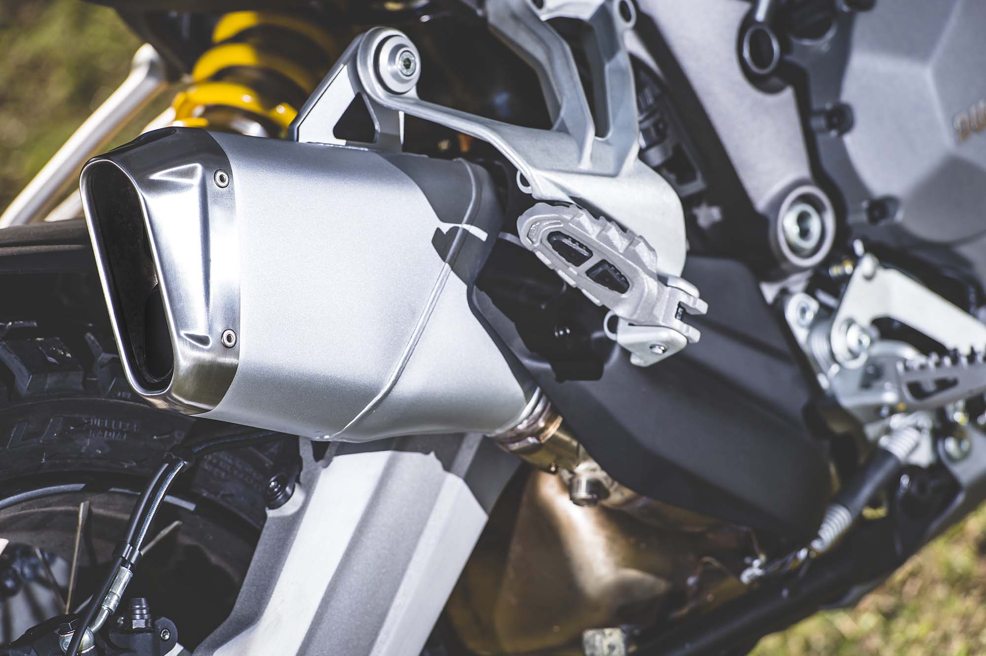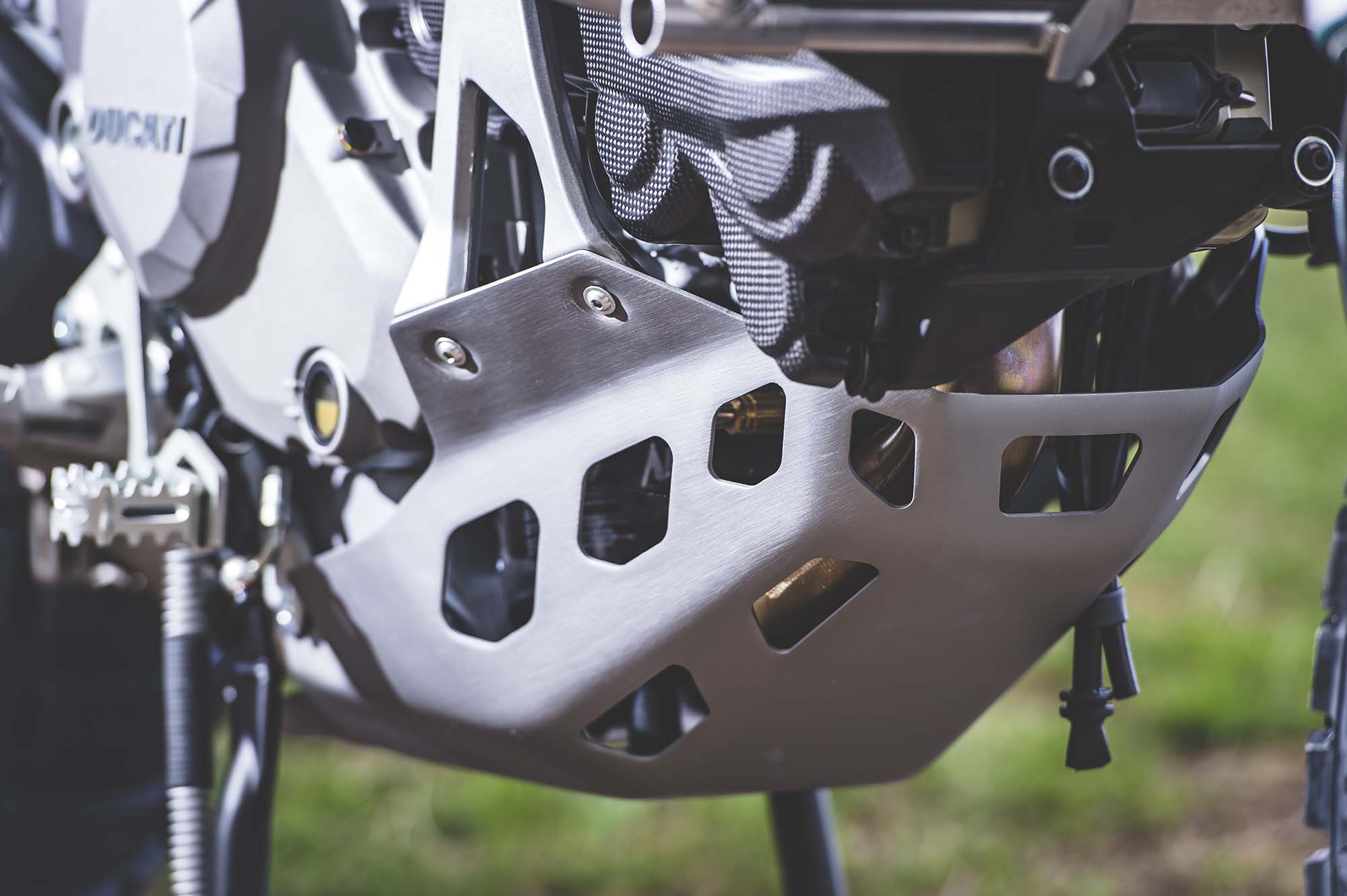 Ducati has made some obvious changes to its Multistrada 1200 platform to make the Enduro model ready for the dirt, the most noticeable of which are the spoked wheels (with a 19-incher up front) and the beefier double-sided swingarm. The optionally equipped Pirelli Scorpion Rally tires, slimmer exhaust can, and crash bars help complete the transformation, as well.
