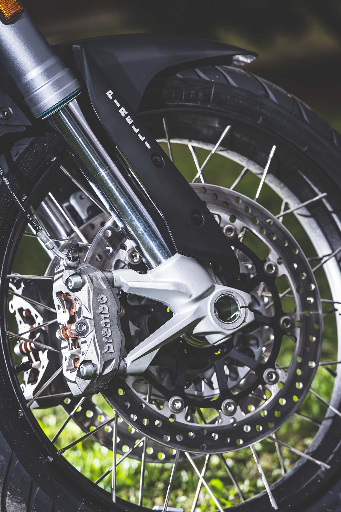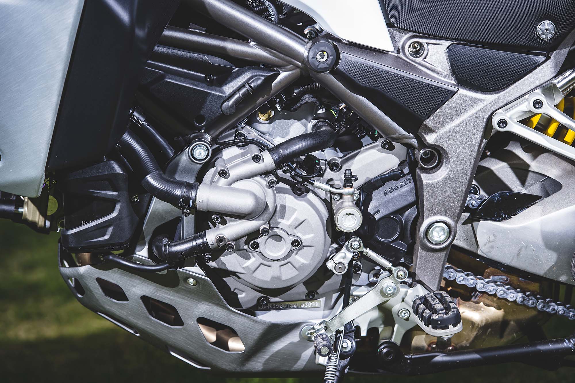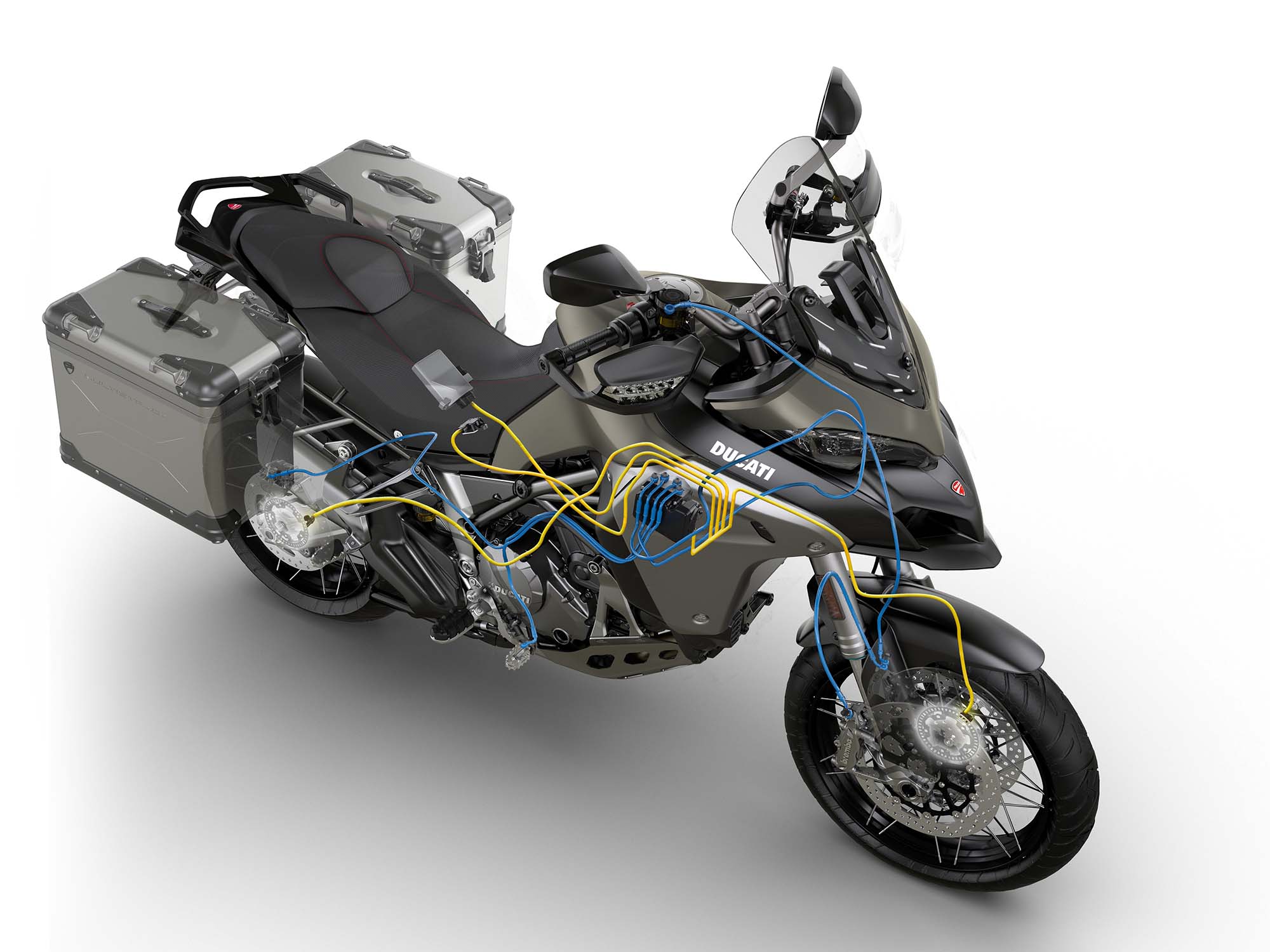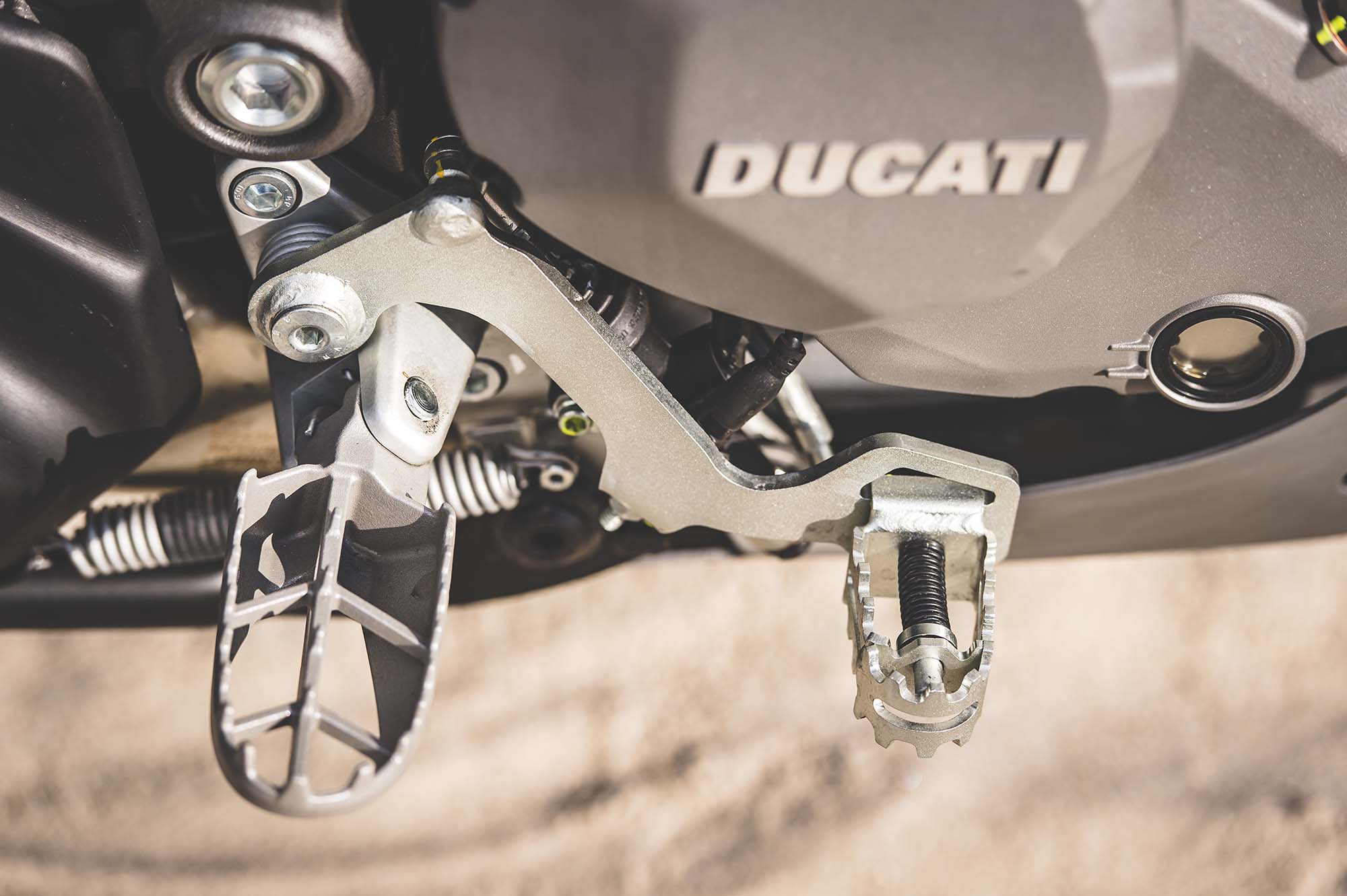 Ducati has made some obvious changes to its Multistrada 1200 platform to make the Enduro model ready for the dirt, the most noticeable of which are the spoked wheels (with a 19-incher up front) and the beefier double-sided swingarm. The optionally equipped Pirelli Scorpion Rally tires, slimmer exhaust can, and crash bars help complete the transformation, as well.