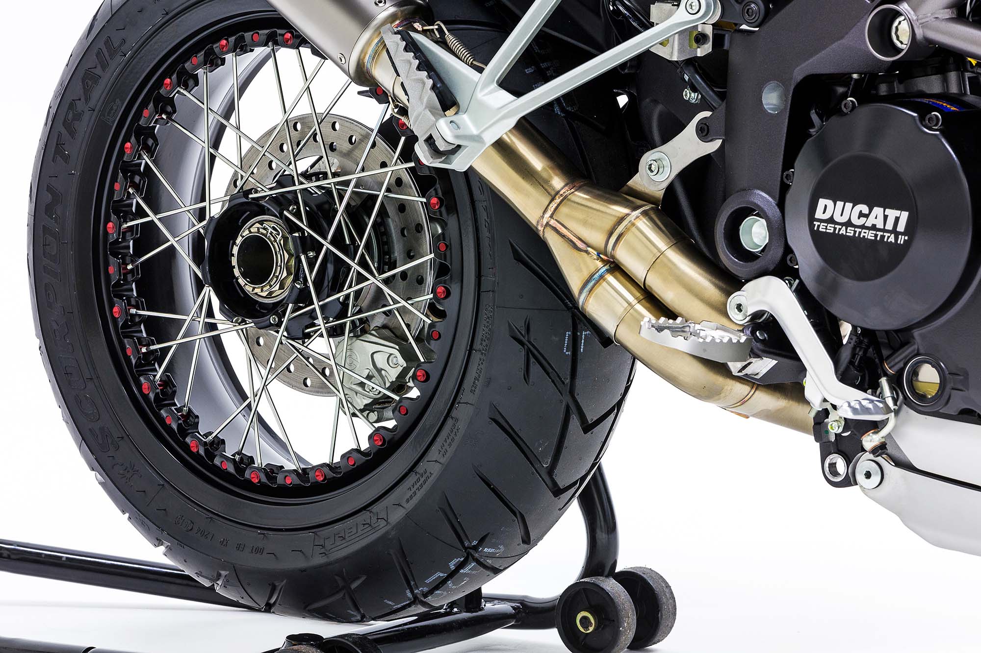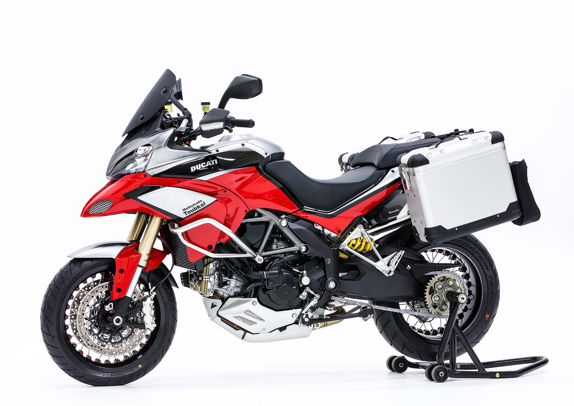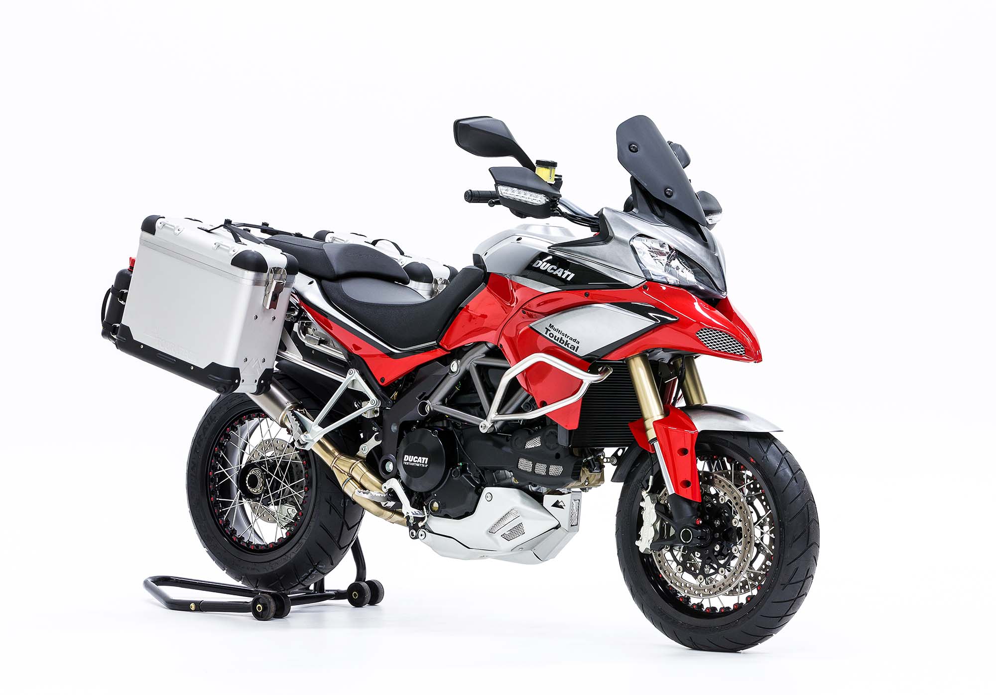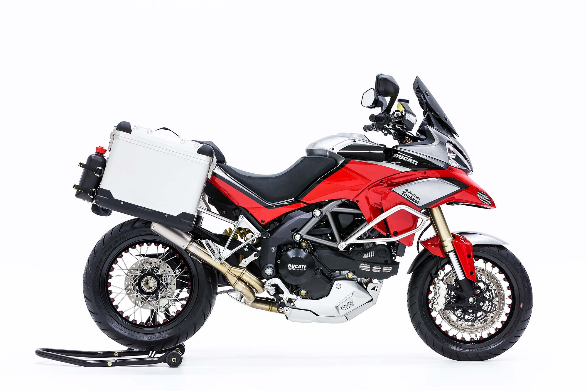 Equipped to go where the sidewalk ends (Toubkal is the highest mountain peak in the Atlas Mountains of Southwest Morocco), the Ducati Multistrada 1200 Toubkal features tubeless spoked wheels, proper panniers, and heavy duty crash protection.