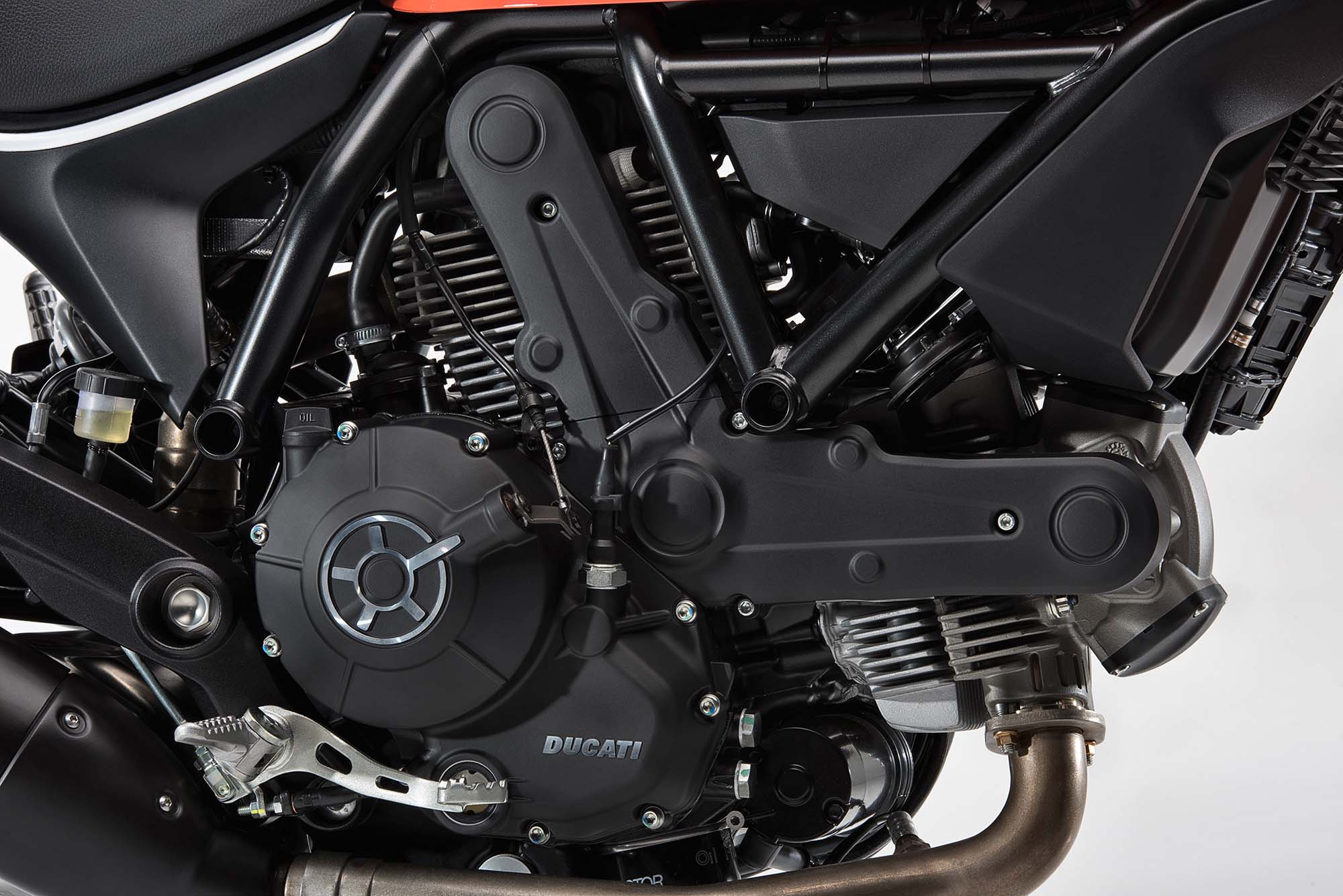 Accordingly, the Ducati Scrambler Sixty2 takes the basic Scrambler chassis and re-sleeves the machine’s air-cooled v-twin for 400cc of displacement, with a 72mm x 49mm bore and stroke (compared to the 88mm x 66mm bore and stroke on the 803cc models).