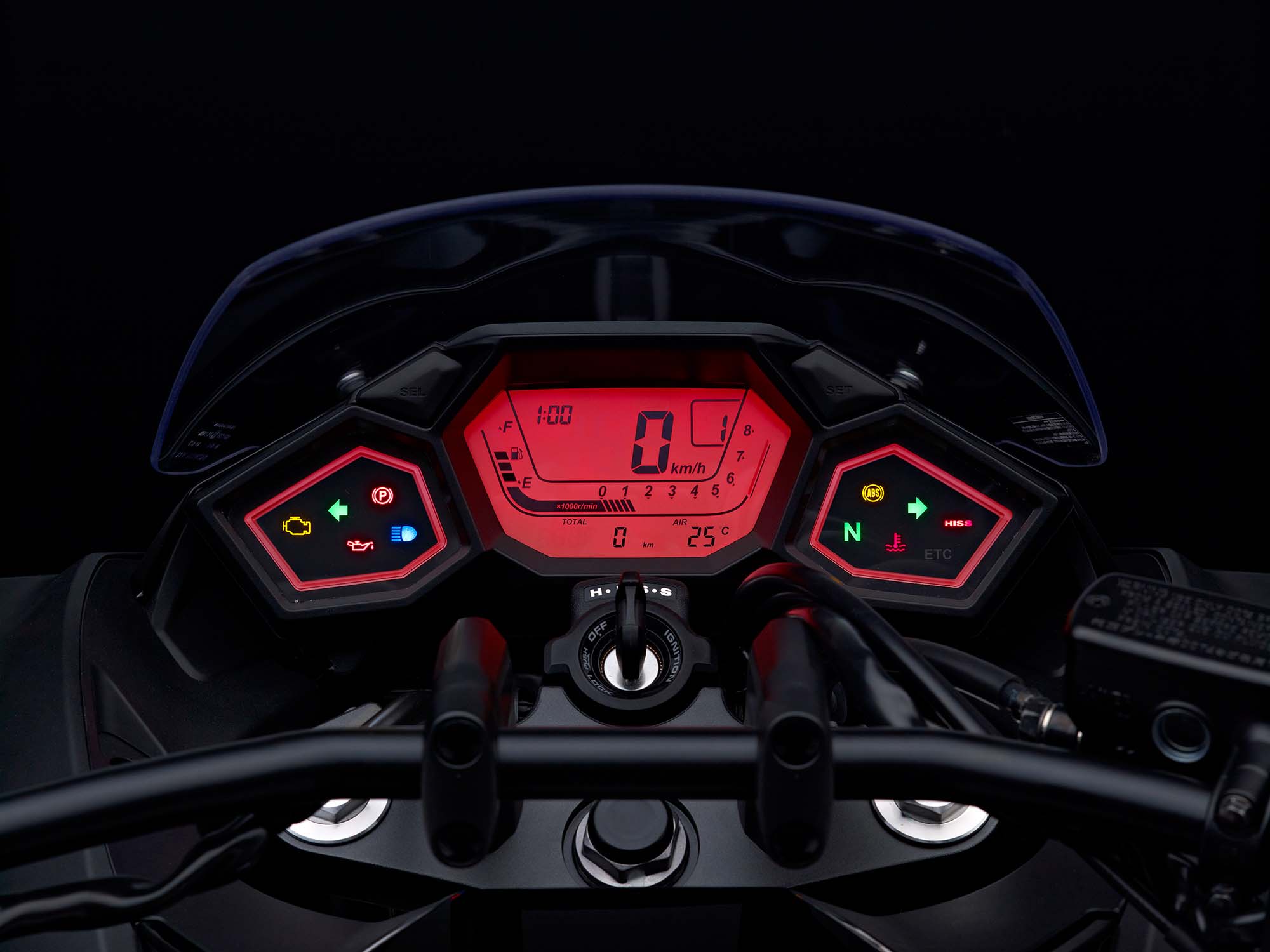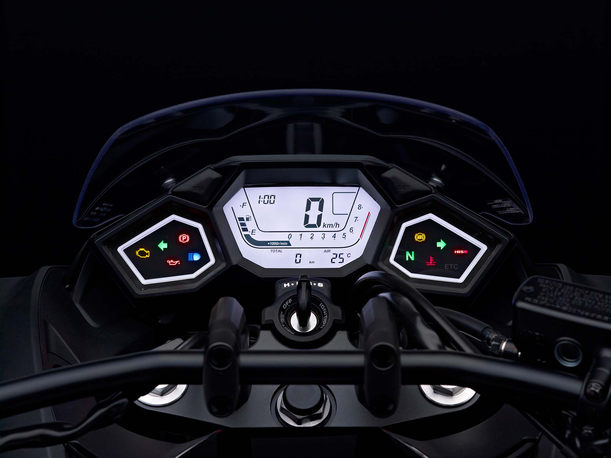| Instruments | Digital speedometer, digital bar-type tachometer, clock, bar-type fuel meter, two trip meters, gear position indicator, outside air temperature gauge and coolant temperature warning light. |