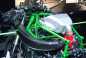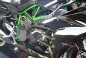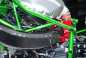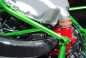 The steel trellis frame is a painted radioactive green, and glows under critical lighting. The long sweeping carbon fiber intake runs down the side of the motorcycle, to the red-painted centrifugal supercharger. We go back and forth as to whether we like the exposed belly of the H2 — is it a throwback or a misstep?