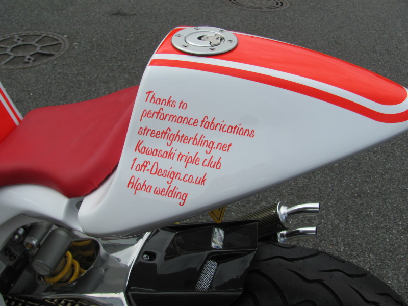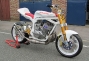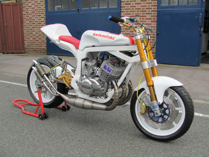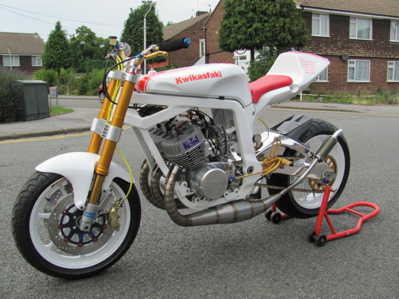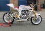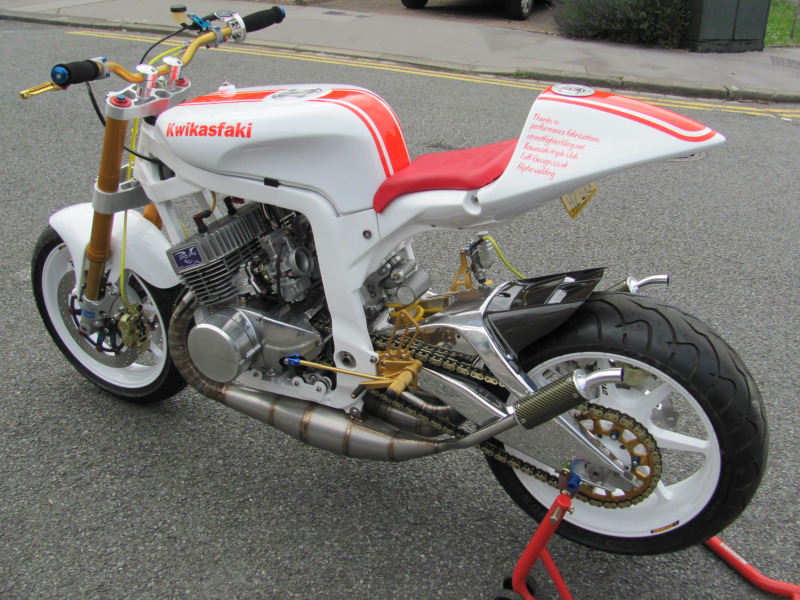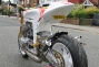 Take one Kawasaki H2 750 motor, recently decommisioned from drag strip duty we might add, throw in a plenty of bling parts, for measure include one deliciously white powdercoated frame, and you’ve got one seriously trick bike that is sure to go “kwikasfaki” (295lbs, 135rwhp, 9.3 down the ¼ mile if you’re a numbers person). Oddly enough, that’s exactly what one member on the Custom Fighters forum, named cabbie, did (full build thread here), and the result is Pamela-Anderson-in-a-wet-leotard-on-a-windy-day stunning.