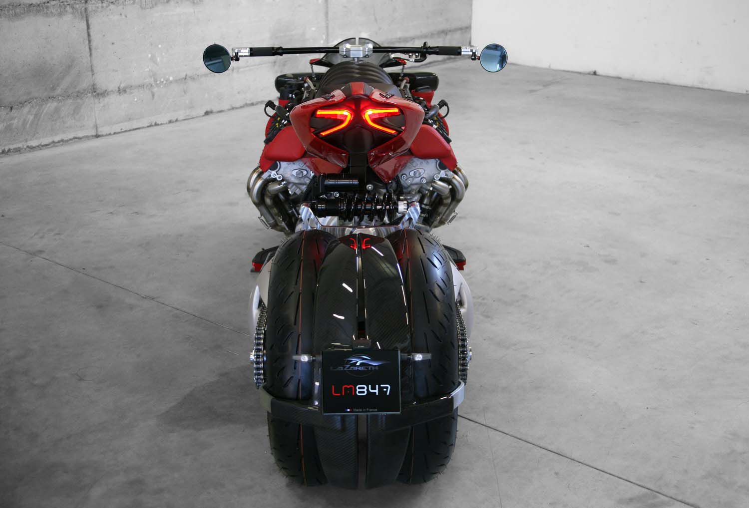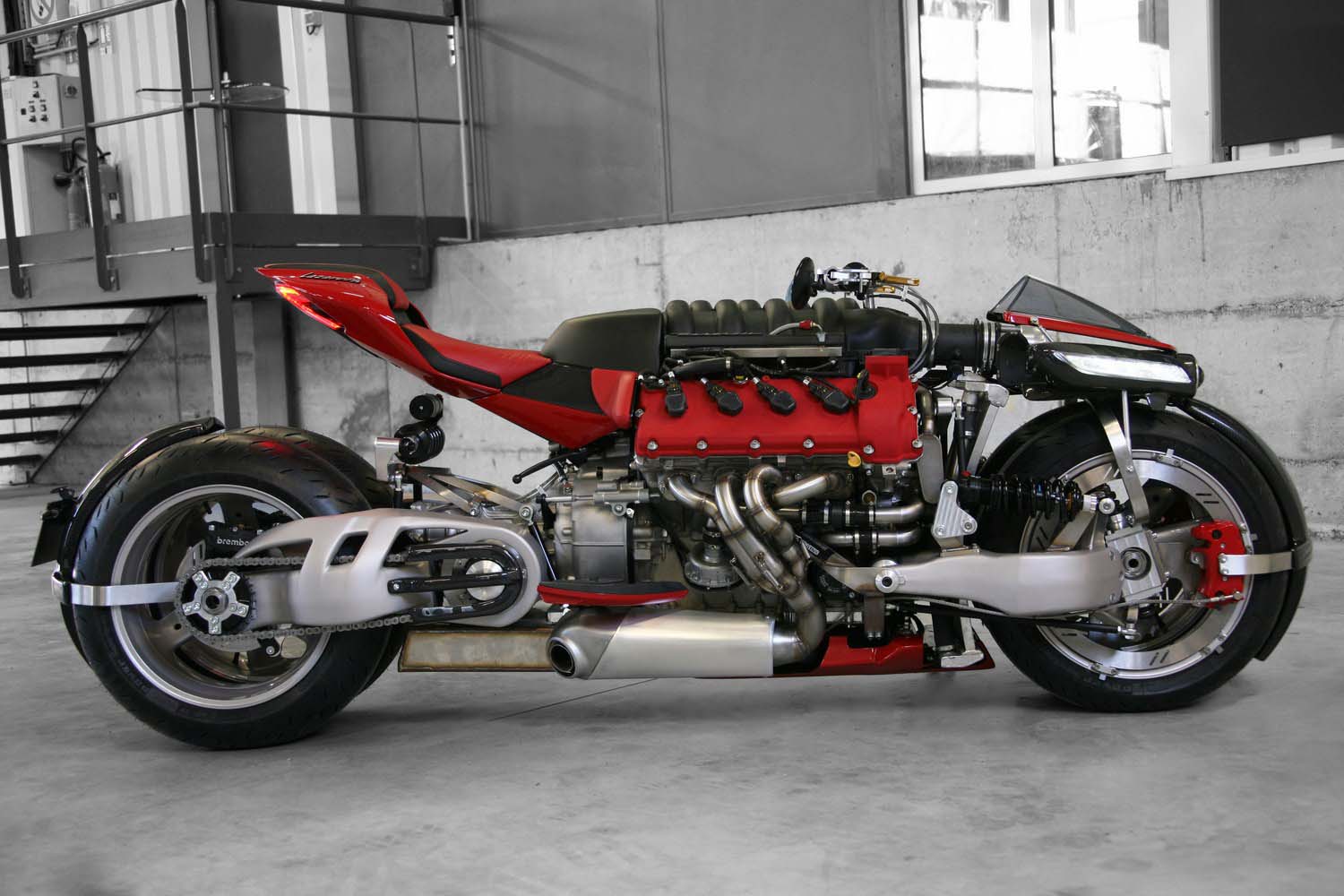 The 880 lbs vehicle is conceptually like the Dodge Tomahawk, which featured the V10 engine from the Dodge Viper sports car. The leaning quad setup looks very similar to the Yamaha Tesseract concept, both visually and technically. And for the piece of resistance, the tail section is straight off a Ducati 1299 Panigale.