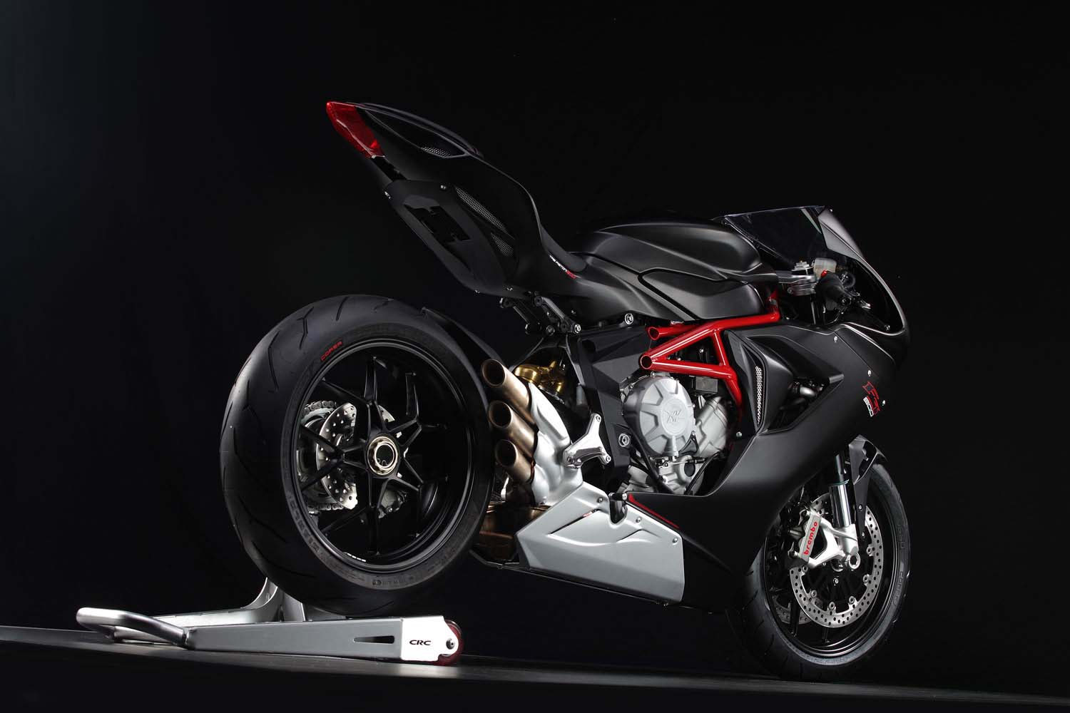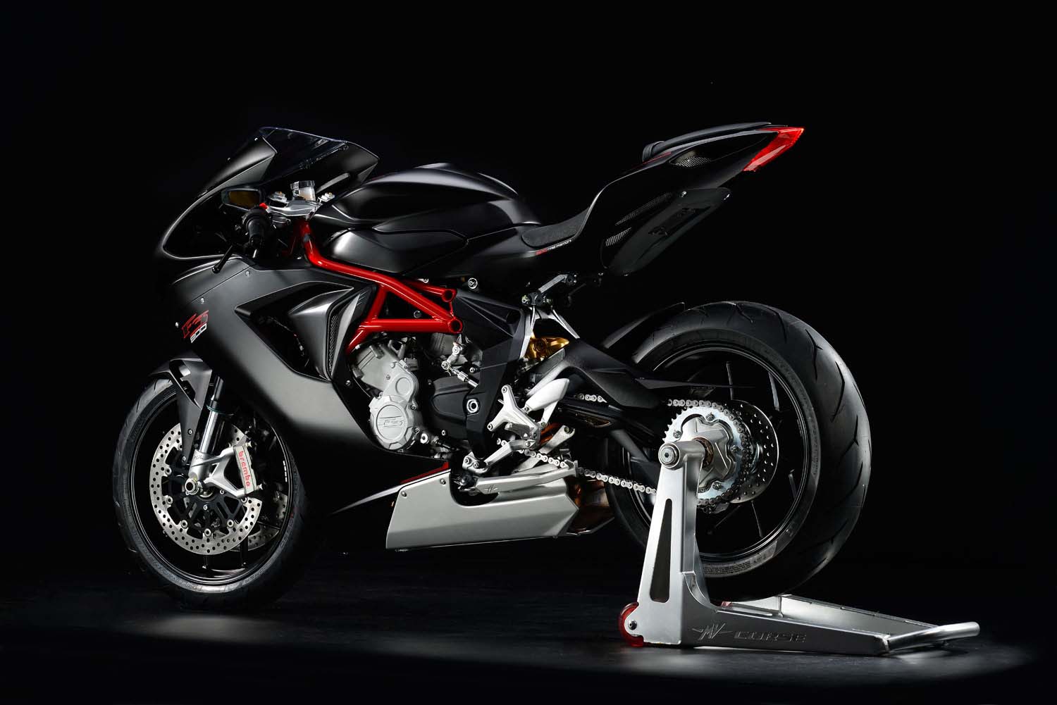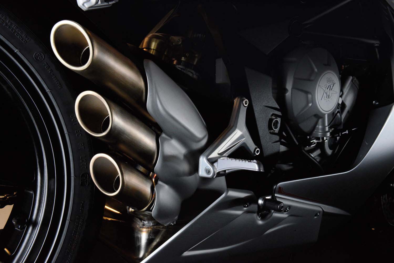 Pepping that three-cylinder motor up to 146hp (note: MV Agusta continues to have some trouble converting kW into horsepower, and other publications continue to fail at checking MV’s math. Last we checked, 108.8 kW equalled 145.9 hp), MV Agusta has wedged the lump into its supersport chassis, and reports that no additional weight has come as a result.