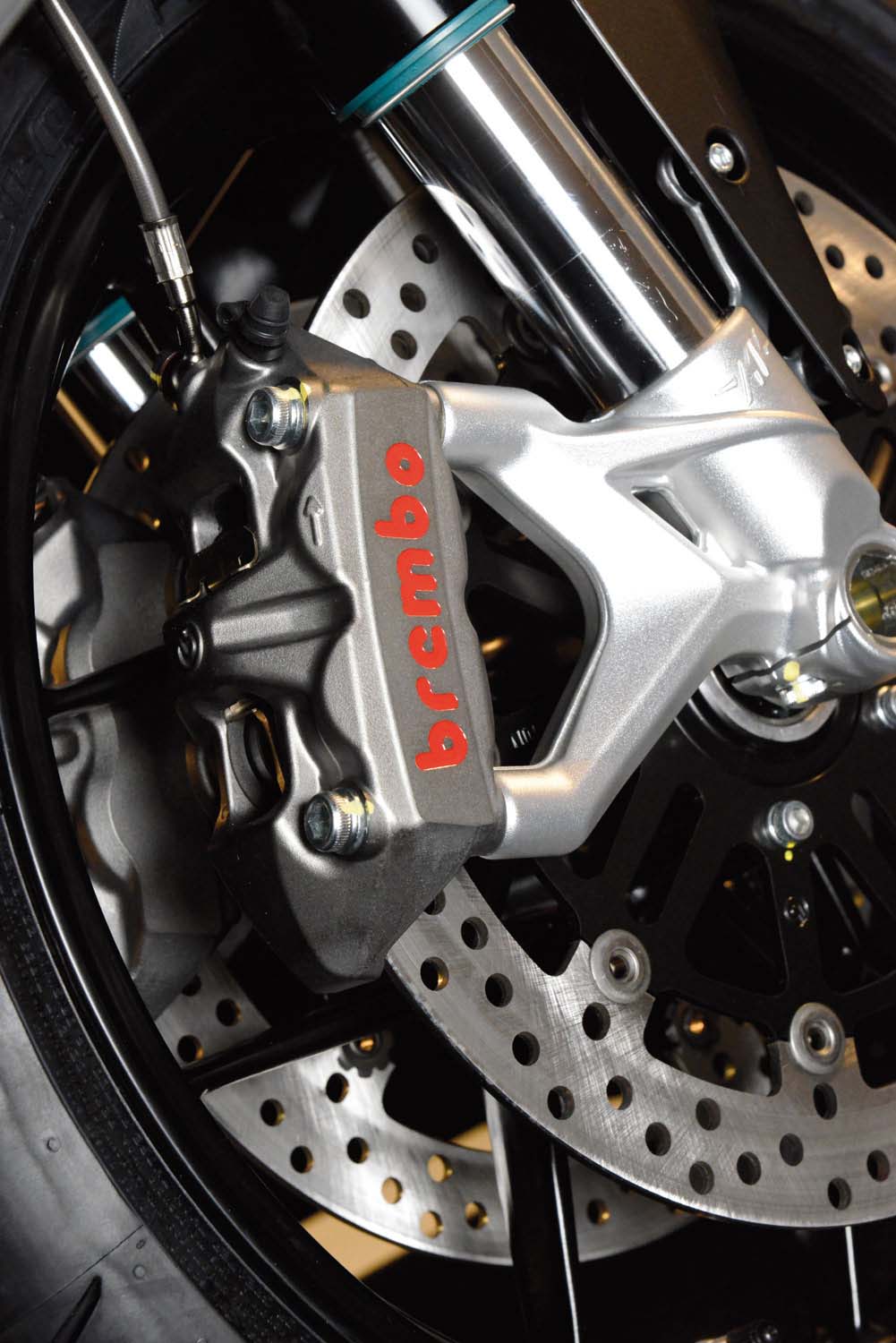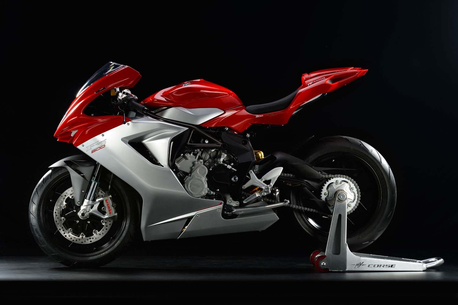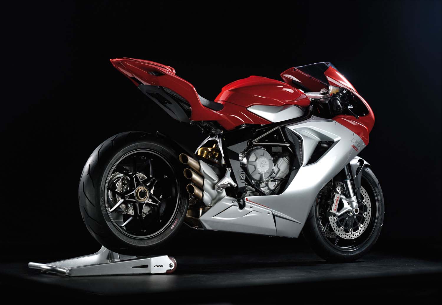 Pepping that three-cylinder motor up to 146hp (note: MV Agusta continues to have some trouble converting kW into horsepower, and other publications continue to fail at checking MV’s math. Last we checked, 108.8 kW equalled 145.9 hp), MV Agusta has wedged the lump into its supersport chassis, and reports that no additional weight has come as a result.