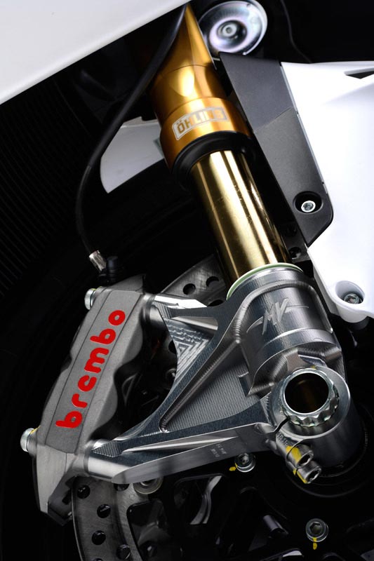 As the most sophisticated motorcycles, the front wheel axle carriers are machined from billet aluminum and the front forks offer precise external adjustment of spring preload as well as compression and rebound damping. Also, the fork of the MV Agusta F4 RR provides separate adjustments for the hydraulic damping (left leg compression, right leg extension), a solution that enables the accuracy of the hydraulic independence as varying the compression does not have an influence on the rebound.
