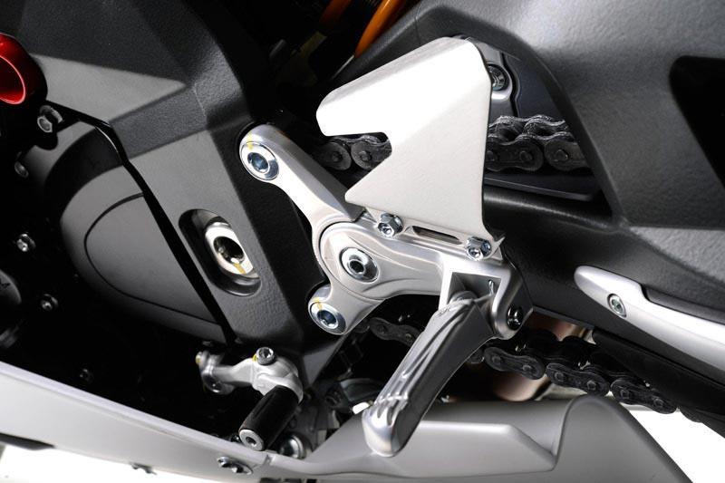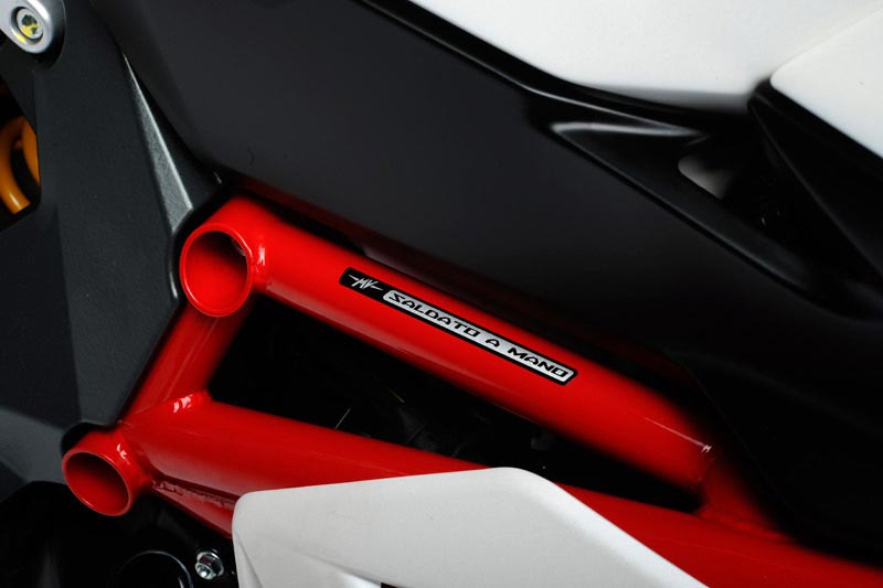 The frame and swingarm are common with those of the already excellent F4, but the desire on the part of MV Agusta to offer a four-cylinder superbike has also led to the employment of some unique solutions. To optimize performance and adapt the F4 RR to all race tracks and conditions, the MV Agusta F4 RR allows a virtually infinite combination of adjustments. Multi-adjustable suspension, essential for a racing motorcycle, has been combined with the adjustable steering head angle (with interchangeable eccentrics) and the height of the swing arm pivot and rear axle by means of calibrated inserts.
