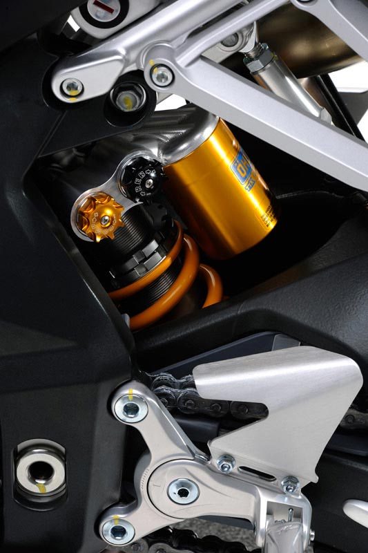 The Öhlins Racing TTX 36 rear shock is simply the best in the world. Born from experience in competition, it is externally adjustable in spring preload, compression, rebound and length allowing you to vary the ride height of the rear of the bike to match the different driving styles and different circuits. In addition, the MV Agusta F4 RR also offers the possibility of adjusting the height of the swing arm pivot point by means of calibrated inserts.