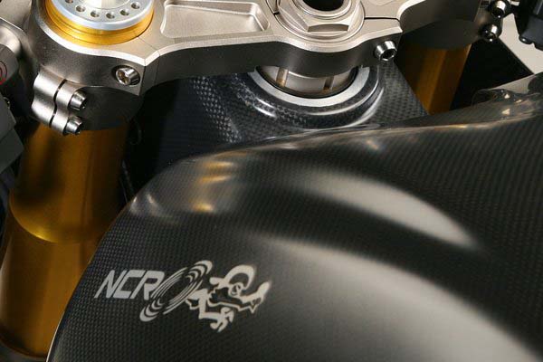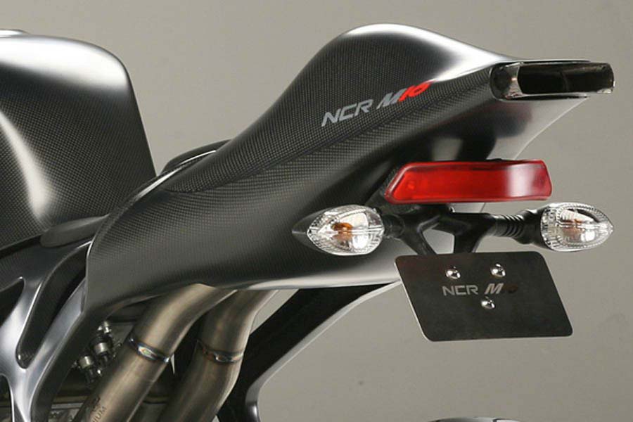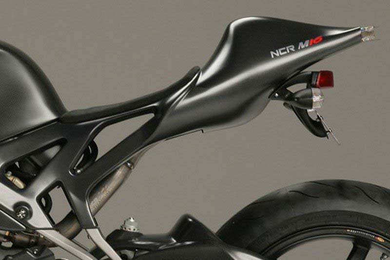 True to NCR form, everything is made out of either carbon fiber, titanium, or aircraft-grade aluminum…in that order apparently. NCR went to great lengths to use carbon fiber where they could on the motorcycle, and as such the frame, swingarm, fuel tank, farings, integrated subframe/tail, and wheels are all made out of the material. The exhaust is pure titanium, and from the looks of it a car alarm detector for sure. Note the side and under-seat placement in the photos.