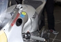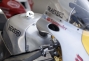 Looking up-close at the race bike, the air intake is immediately eye-catching. The front nose inlet goes straight back like any other RAM air system, while additional breathing for the airbox comes from the two ducts at the top of the fairing, near the windscreen. Those drop down into the forward mock fuel tank, and which houses the four-barrelled throttle body and airbox.