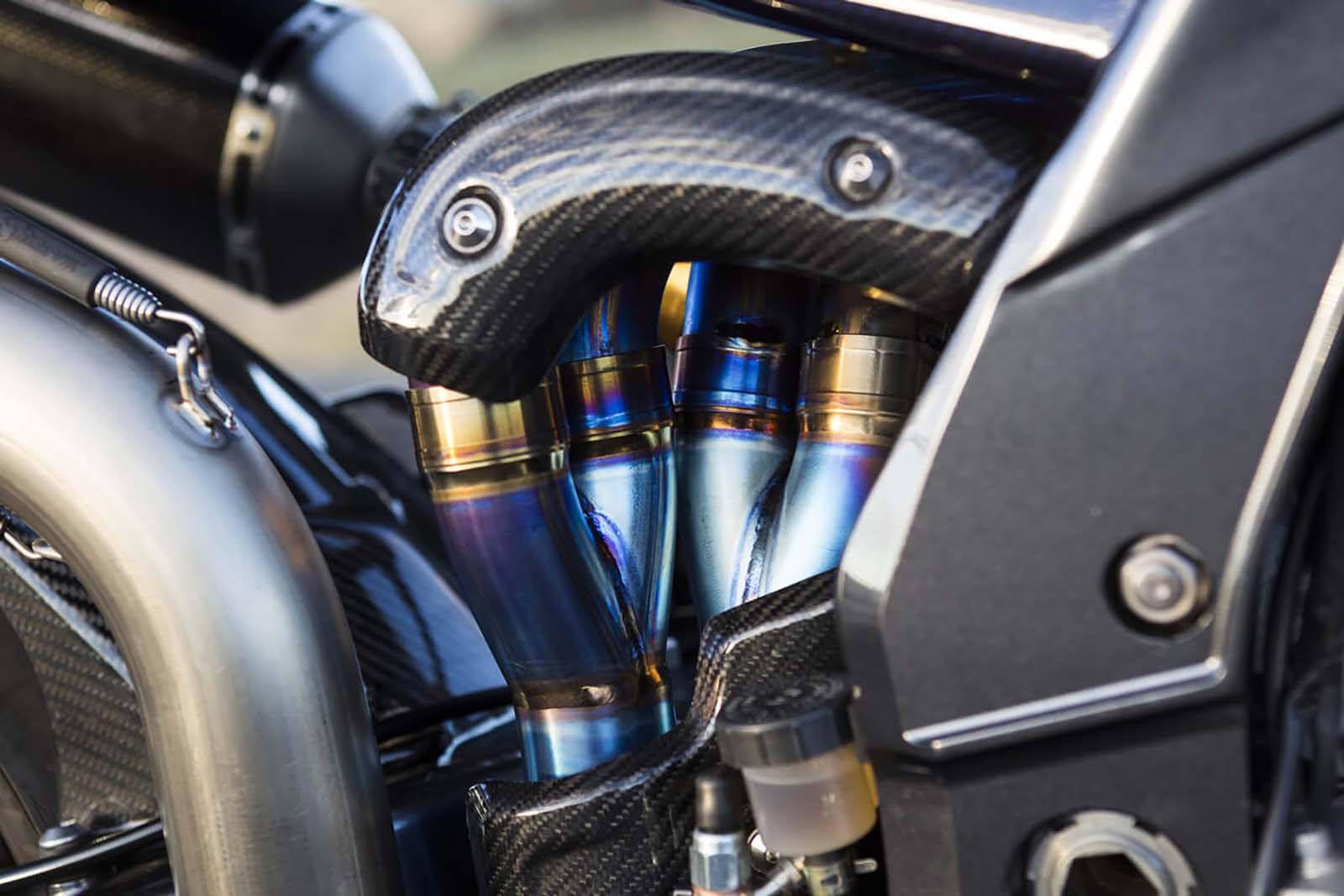 Brembo GP4 brake calipers are at the front, stopping dual 320mm discs, while a Brembo P4 caliper is on the back, mated to a Yamaha YZF-R1 swingarm. Holding the 90°, 1,996cc (77mm x 54mm), eight-cylinder motor is a chrome-moly chassis with an aluminum subframe.