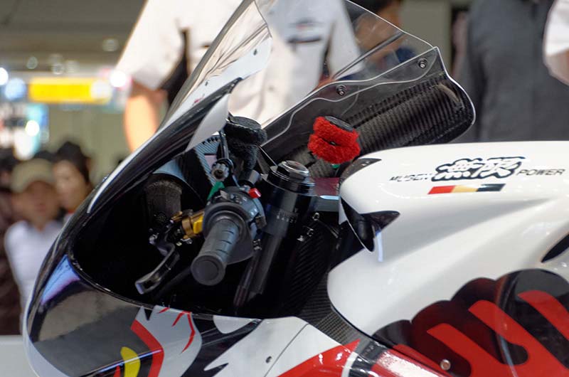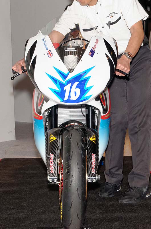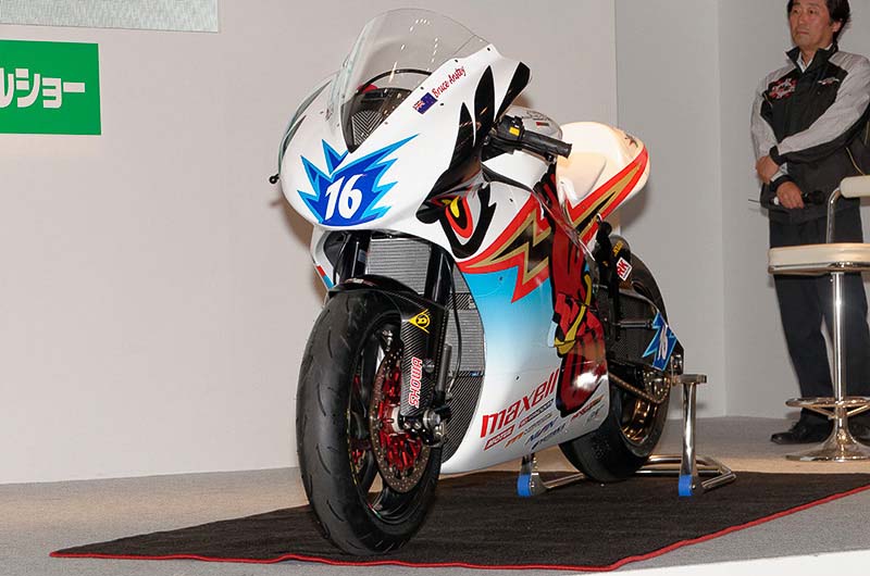 Sitting next to the Shinden San, the Shinden Ni looks positively large, as its predecessor’s fairings are noticeably more streamlined and stylized — does anyone else thing the front fairing looks suspiciously like the Mission RS?