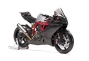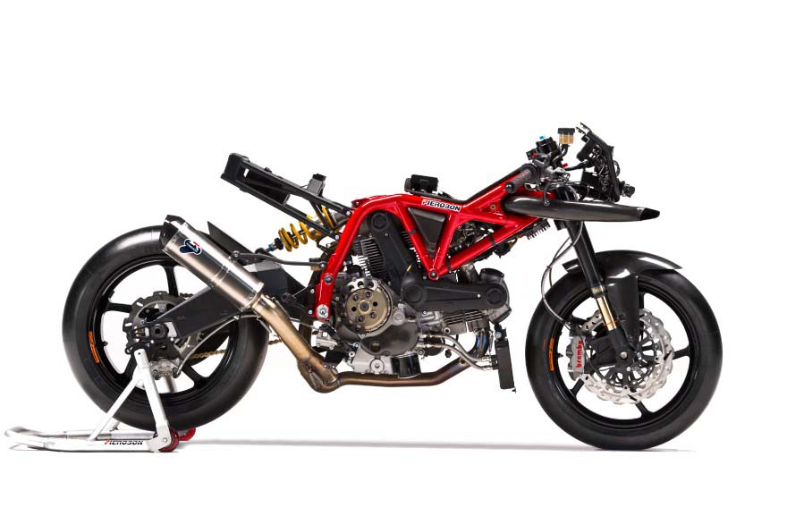 Derived from the company’s GP designs, the chain-side of the swingarm has been fully enclosed, presumably for increased rigidity. Pierobon has also increased the size of the oil-cooler radiator to help with heat transfer on the more powerful motor.