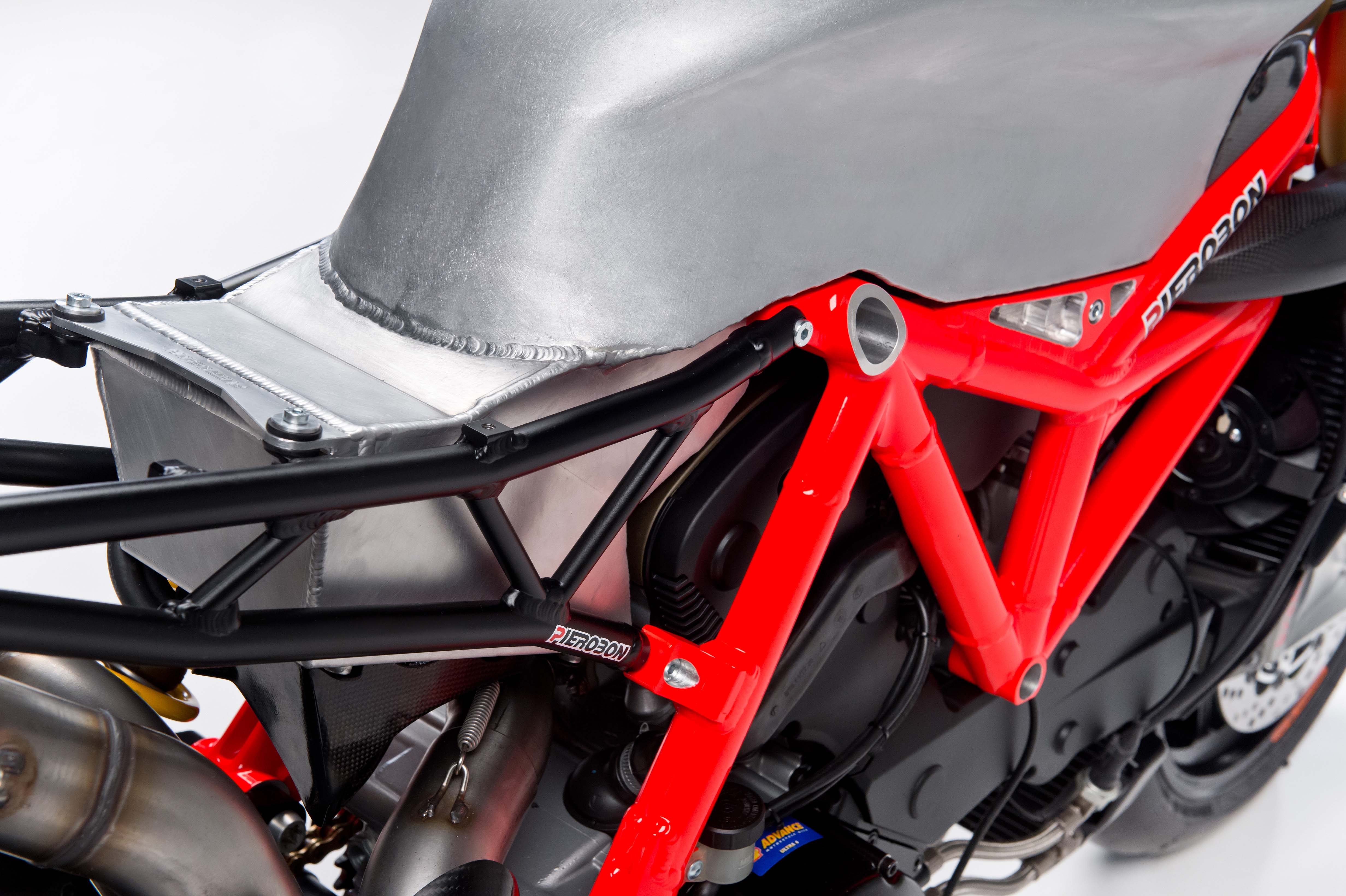 Pierobon has tried to make the conversion as easy as possible, so the fuel tank mounts any 848, 1098, 1198 fuel pump, while the rear subframe will allow the mounting of any 848, 1098, 1198 undertail exhaust. You can get bodywork in either fiberglass or carbon fiber, we suggest the latter.