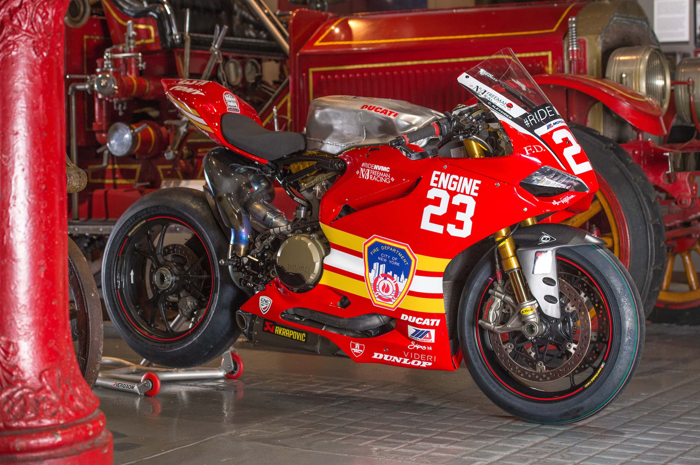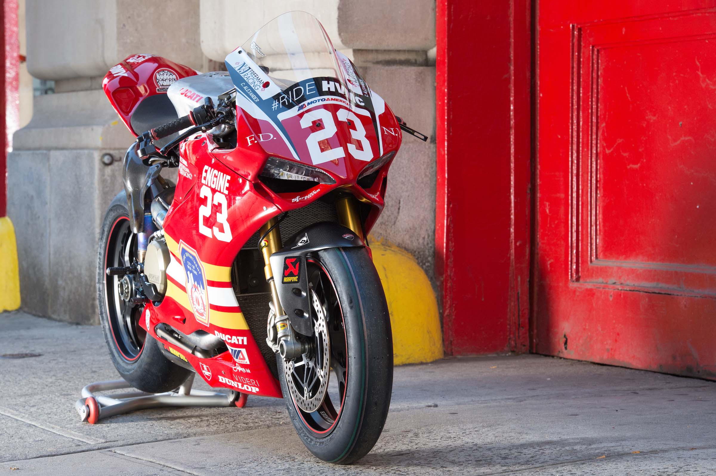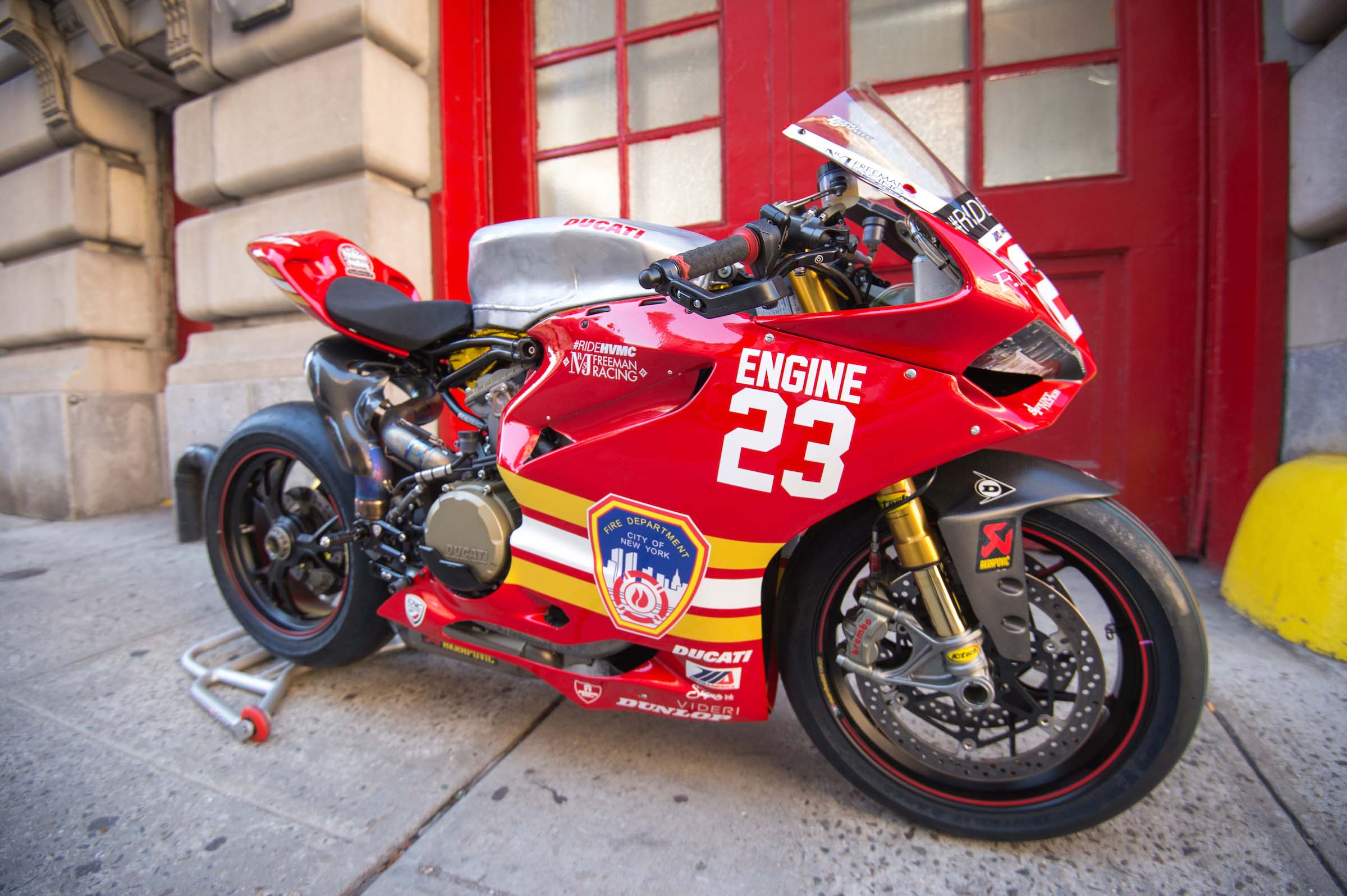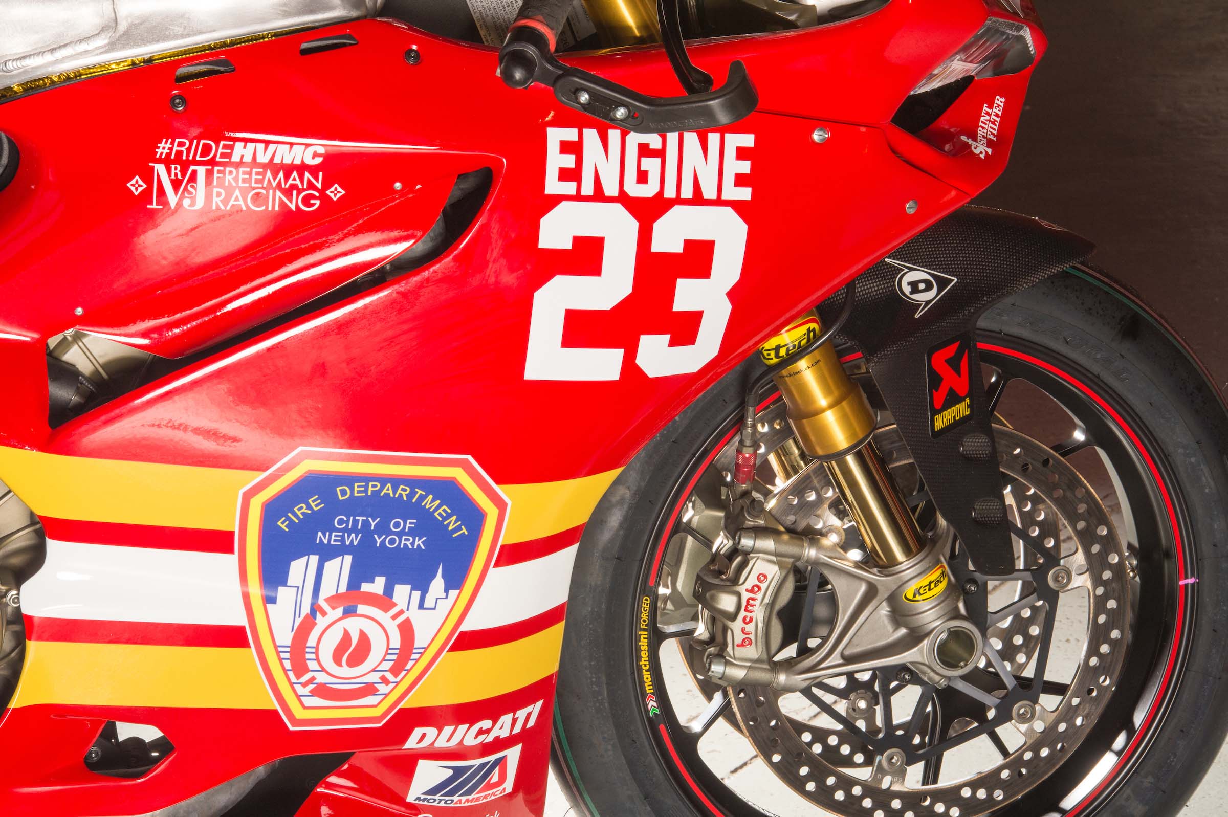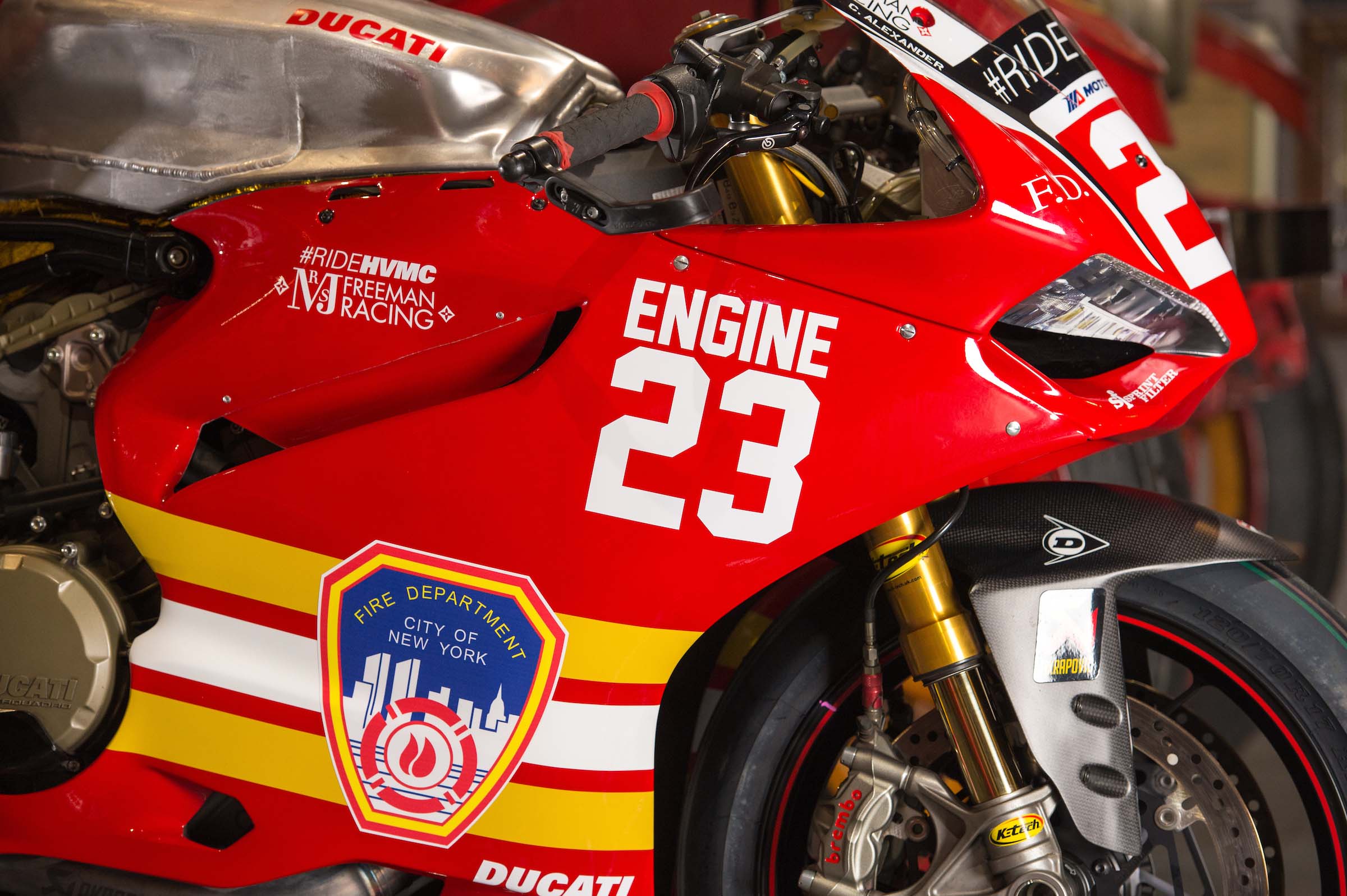 As such, Corey Alexander and the #RideHVMC Freeman Racing Ducati Panigale R will be wearing a special livery that commemorates the men and women of the New York City Fire Department. As you will see in the photos after the jump, “Engine 23” is a fetching motorcycle, with a touching message.